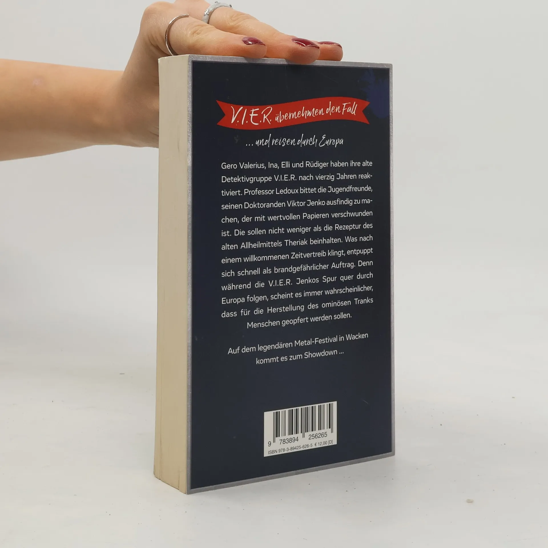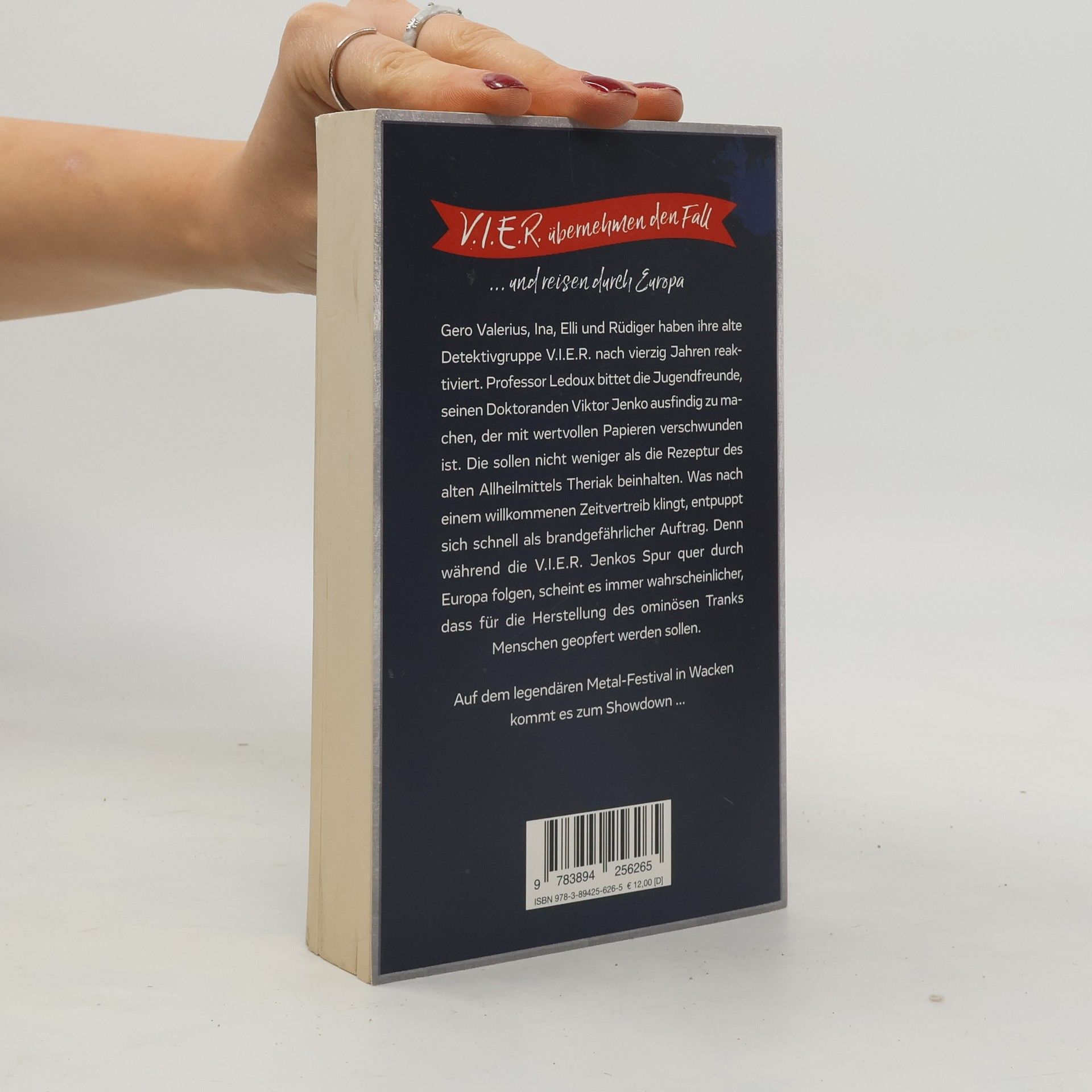 Sieben Orte, sieben Opfer – V. I. E. R.übernehmen den Fall. Gerade erst von der gemeinsamen Kreuzfahrt heimgekehrt, stolpern Gero Valerius, Ina, Elli und Rüdiger schon ins nächste Abenteuer. Professor Ledoux bittet die Jugendfreunde, die ihre alte Detektivgruppe V. I. E. R. nach 40 Jahren reaktiviert haben, seinen Doktoranden aufzuspüren. Viktor Jenko ist mit wertvollen Papieren verschwunden, die nicht weniger als die Rezeptur des alten Allheilmittels Theriak beinhalten sollen. Was nach einem willkommenen Zeitvertreib klingt, entpuppt sich schnell als brandgefährlicher Auftrag. Denn während die V. I. E. R. Jenko quer durch Europa verfolgen, scheint es immer wahrscheinlicher, dass für die Herstellung des ominösen Tranks Menschen geopfert werden sollen. Auf dem legendären Metal-Festival in Wacken kommt es zum Showdown ...