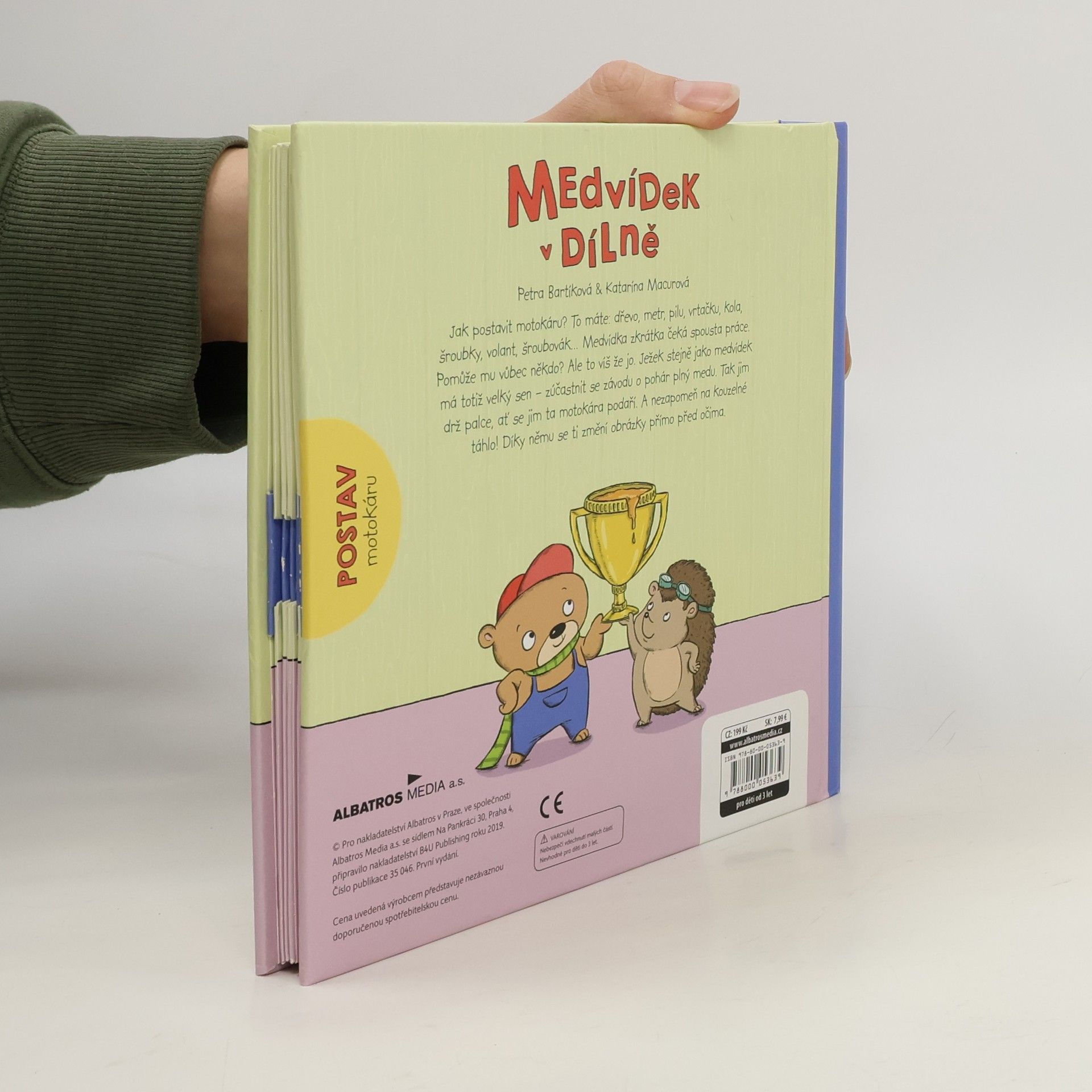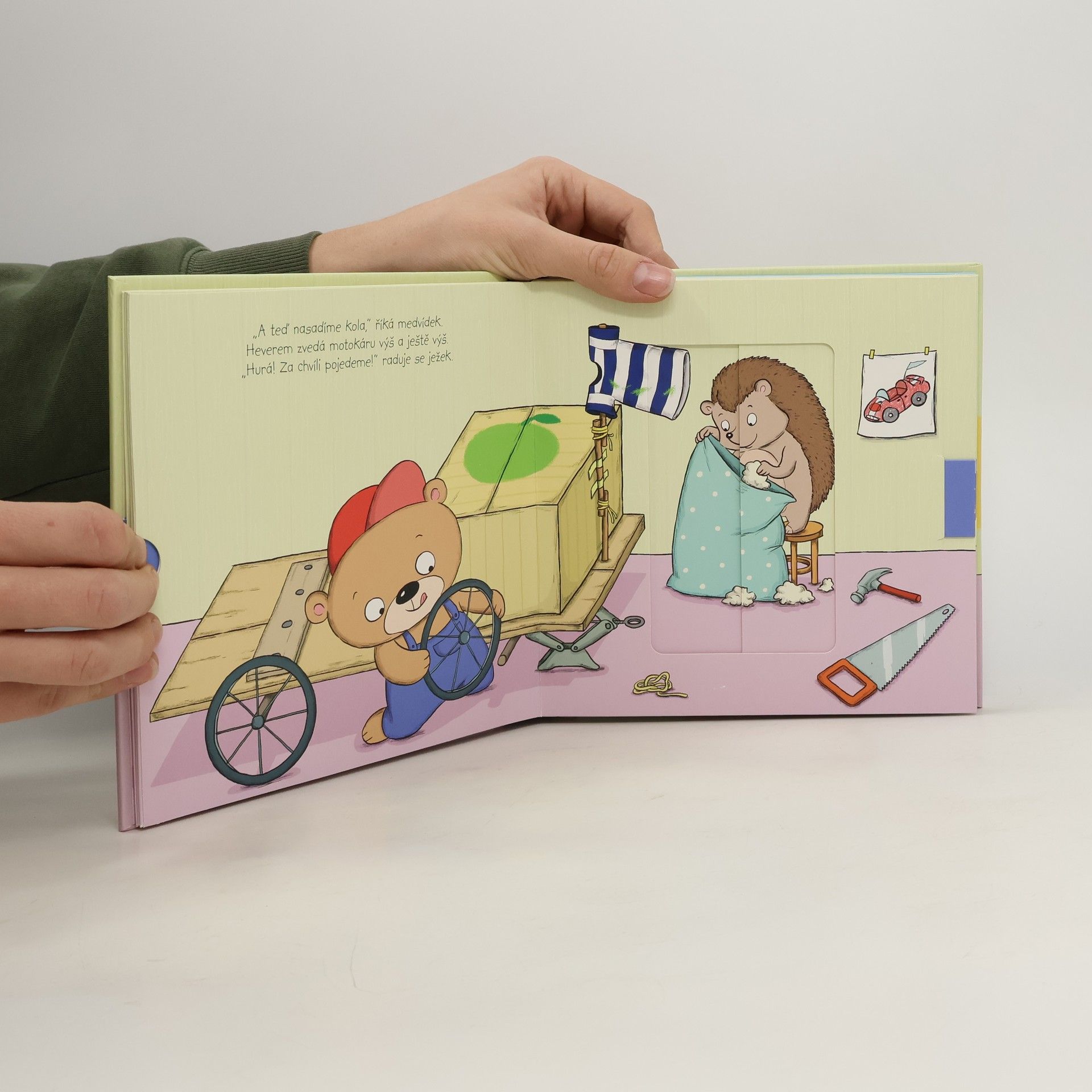 Medvídkovi při sestrojování motokáry pomáhá ježeček. Je to ale náramný popleta. Veselé leporelo s pohyblivými obrázky a roztomilými ilustracemi.