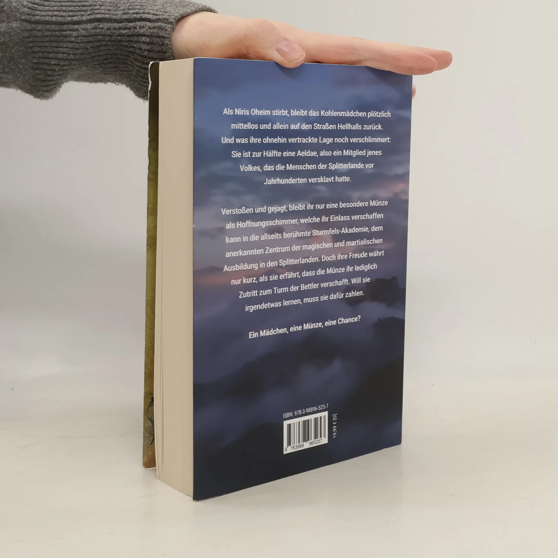 Als Niris Oheim stirbt, bleibt das Kohlenmädchen plötzlich mittellos und allein auf den Straßen Hellhalls zurück. Und was ihre ohnehin vertrackte Lage noch verschlimmert: Sie ist zur Hälfte eine Aeldae, also ein Mitglied jenes Volkes, das die Menschen der Splitterlande vor Jahrhunderten versklavt hatte. Verstoßen und gejagt, bleibt ihr nur eine besondere Münze als Hoffungsschimmer, welche ihr Einlass verschaffen kann in die allseits berühmte Sturmfelsakademie, dem anerkannten Zentrum der magischen und martialischen Ausbildung in den Splitterlanden. Doch ihre Freude währt nur kurz, als sie erfährt, dass die Münze ihr lediglich Zutritt zum Turm der Bettler verschafft. Will sie irgendetwas lernen, muss sie dafür zahlen. Ein Mädchen, eine Münze, eine Chance?