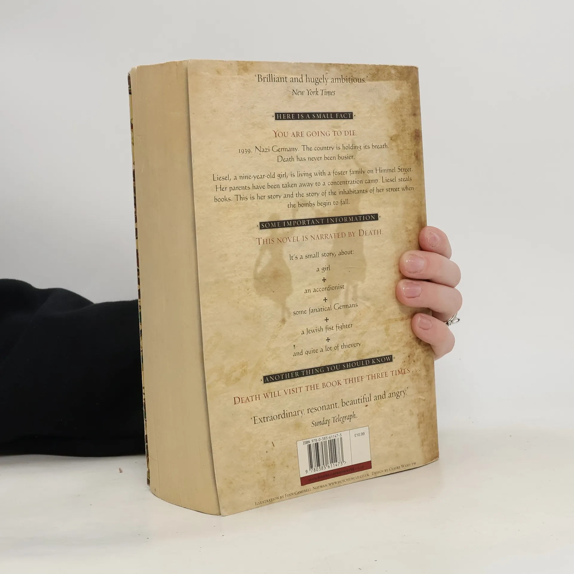 HERE IS A SMALL FACT - YOU ARE GOING TO DIE 1939. Nazi Germany. The country is holding its breath. Death has never been busier. Liesel, a nine-year-old girl, is living with a foster family on Himmel Street. Her parents have been taken away to a concentration camp. Liesel steals books. This is her story and the story of the inhabitants of her street when the bombs begin to fall. SOME IMPORTANT INFORMATION - THIS NOVEL IS NARRATED BY DEATH It's a small story, about: a girl an accordionist some fanatical Germans a Jewish fist fighter and quite a lot of thievery. ANOTHER THING YOU SHOULD KNOW - DEATH WILL VISIT THE BOOK THIEF THREE TIMES
