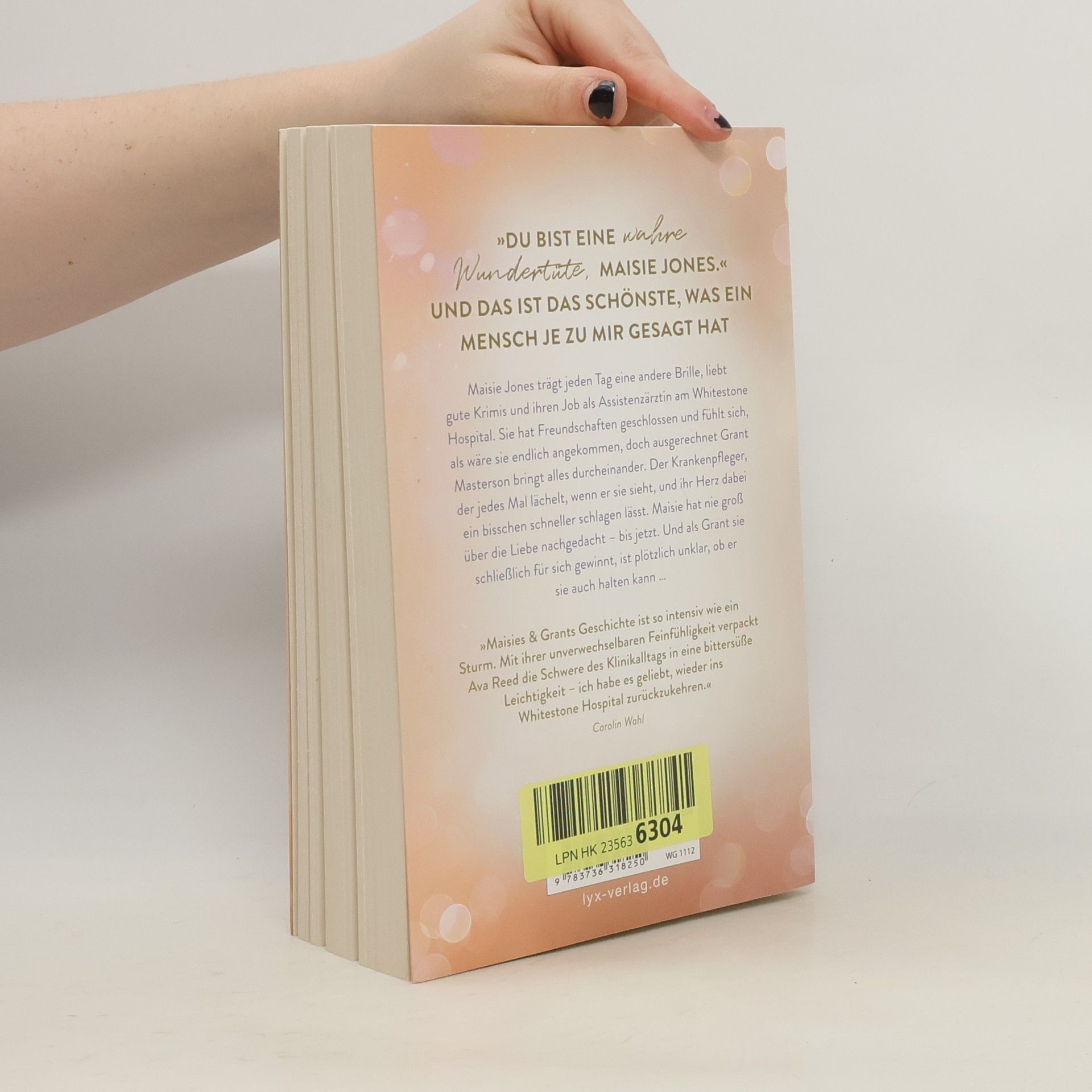 »Du bist eine wahre Wundertüte, Maisie Jones.« Und das ist das Schönste, was ein Mensch je zu mir gesagt hat Maisie Jones trägt jeden Tag eine andere Brille, liebt gute Krimis und ihren Job als Assistenzärztin am Whitestone Hospital. Sie hat Freundschaften geschlossen und fühlt sich, als wäre sie endlich angekommen, doch ausgerechnet Grant Masterson bringt alles durcheinander. Der Krankenpfleger, der jedes Mal lächelt, wenn er sie sieht, und ihr Herz dabei ein bisschen schneller schlagen lässt. Maisie hat nie groß über die Liebe nachgedacht - bis jetzt. Und als Grant sie schließlich für sich gewinnt, ist plötzlich unklar, ob er sie auch halten kann ... »Maisies & Grants Geschichte ist so intensiv wie ein Sturm. Mit ihrer unverwechselbaren Feinfühligkeit verpackt Ava Reed die Schwere des Klinikalltags in eine bittersüße Leichtigkeit - ich habe es geliebt, wieder ins WHITESTONE HOSPITAL zurückzukehren.« CAROLIN WAHL Band 3 der Serie rund um die jungen Ärzt: innen des WHITESTONE HOSPITALS von SPIEGEL -Bestseller-Autorin Ava Reed