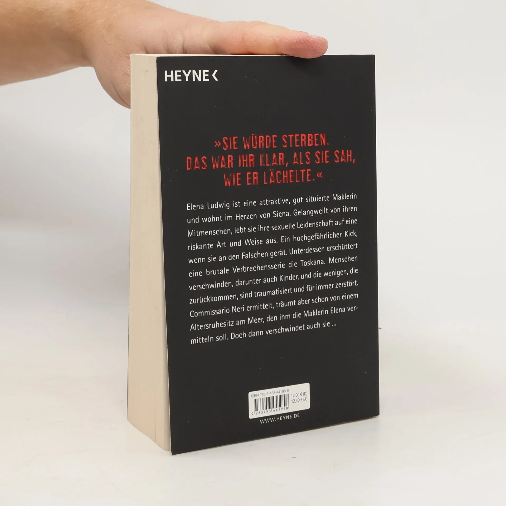 Elena Ludwig ist eine attraktive, gut situierte Maklerin und wohnt im Herzen von Siena. Gelangweilt von ihren Mitmenschen, lebt sie ihre sexuelle Leidenschaft auf eine riskante Art und Weise aus. Ein hochgefährlicher Kick, wenn sie an den Falschen gerät. Unterdessen erschüttert eine brutale Verbrechensserie die Toskana. Menschen verschwinden, und die wenigen, die zurückkommen, sind traumatisiert und für immer zerstört. Commissario Neri ermittelt, träumt aber schon von einem Altersruhesitz am Meer, den ihm die Maklerin Elena vermitteln soll. Doch dann verschwindet auch sie...