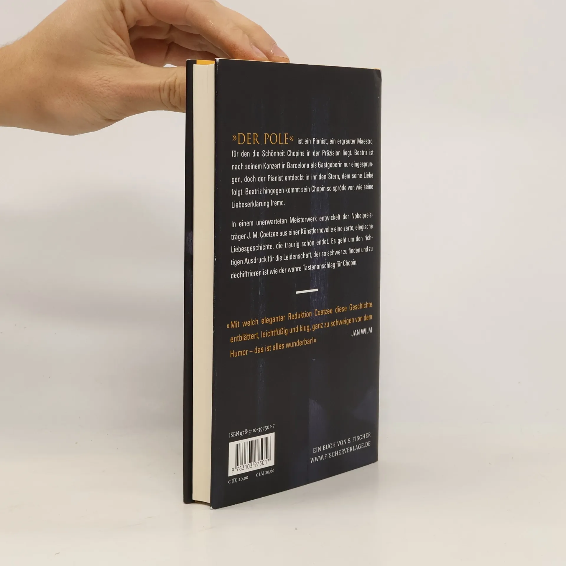 In seiner Künstlernovelle »Der Pole« entwirft der Nobelpreisträger J. M. Coetzee eine zarte, elegische Liebesgeschichte, die spröde beginnt und traurig schön endet. Der Protagonist, ein ergrauter Maestro, ist Pianist, für den die Schönheit Chopins in der Präzision liegt. Beatriz ist nach seinem Konzert in Barcelona als Gastgeberin nur eingesprungen, doch der Pianist entdeckt in ihr den Stern, dem seine Liebe folgen will. Beatriz kommen seine Interpretationen von Chopins Nocturnes etwas reizlos vor und seine Liebeserklärung in Form eines Gedicht-Zyklus in einer fremden Sprache stellt sie vor die Herausforderung deren Bedeutung erst mühsam dechiffrieren zu müssen. Dennoch entwickelt sich zwischen beiden eine Liebesbeziehung, die die Schwierigkeif aufzeigt, wahre Gefühle zu übermitteln. In einem wahren Meisterwerk entwickelt J. M. Coetzee eine Erzählung, in der es um den richtigen Ausdruck für die Leidenschaft geht, der den anderen überzeugt und so schwer zu finden ist wie der wahre Tastenanschlag für Chopin. Mit der Erkenntnis, dass man ihn manchmal auch zu spät erst findet… »Mit welch eleganter Reduktion Coetzee diese Geschichte entblättert, leichtfüßig und klug, ganz zu schweigen von dem Humor – das ist alles wunderbar!« Jan Wilm »Eine Sprache, die sich auf die kleinen Dinge des Lebens konzentriert.« Marie-Luise Knott, Deutschlandfunk, zu »Ein Haus in Spanien«