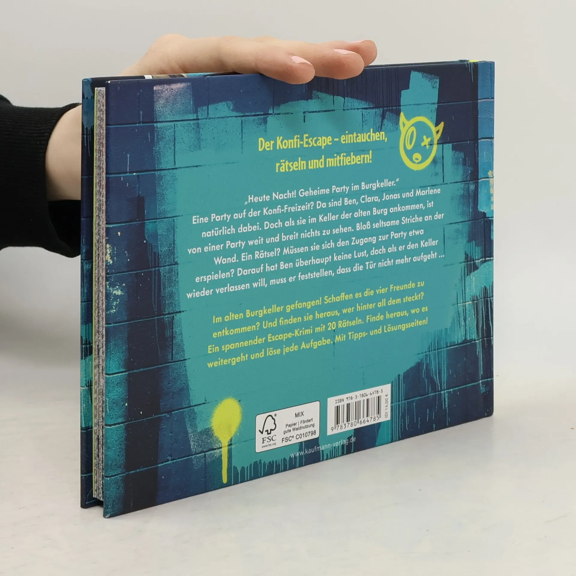 Der neue Konfi-Escape – Eintauchen, rätseln und mitfiebern! Das perfekte Geschenk zur Konfirmation: Eine spannende Geschichte im Escape-Abenteuer-Stil und 20 knifflige Rätsel. Löse die Aufgaben und finde heraus, wo es im Buch weitergeht. Außerdem gibt es Tipps- und Lösungsseiten, wenn man mal nicht weiterweiß. Die Geschichte: „Eine geheime Party? Wie cool war das denn?“ Ben, Clara, Marlene und Jonas lassen sich das auf der Konfi-Freizeit natürlich nicht entgehen. „Hmm, wo sind wohl die anderen alle?“, fragt sich Ben, als er den Keller der alten Burg betritt, doch da ist es schon zu spät. Sie sind in dem unterirdischen Räumen gefangen. Irgendwer scheint sich einen schrecklichen Spaß daraus zu machen sie mit Rätseln und Aufgaben zu quälen. Doch wer steckt dahinter? Und schaffen es die vier Freunde unversehrt aus dem Keller zu entkommen…? So gehts: Die Seiten des Buchs sind verschlossen. Nach jedem Kapitel kann ein neues Seitenpaar aufgetrennt und weiter in die Geschichte eingetaucht werden. Nach jedem Abschnitt muss ein Rätsel gelöst werden um weiterzukommen und hoffentlich letztendlich zu fliehen. Die Lösung des Rätsels zeigt an, an welcher Stelle im Buch weitergelesen werden soll. Perfekt als Konfirmations-Geschenk für Escape Room Fans und Spannungs-, Krimi- und Rätselliebende.