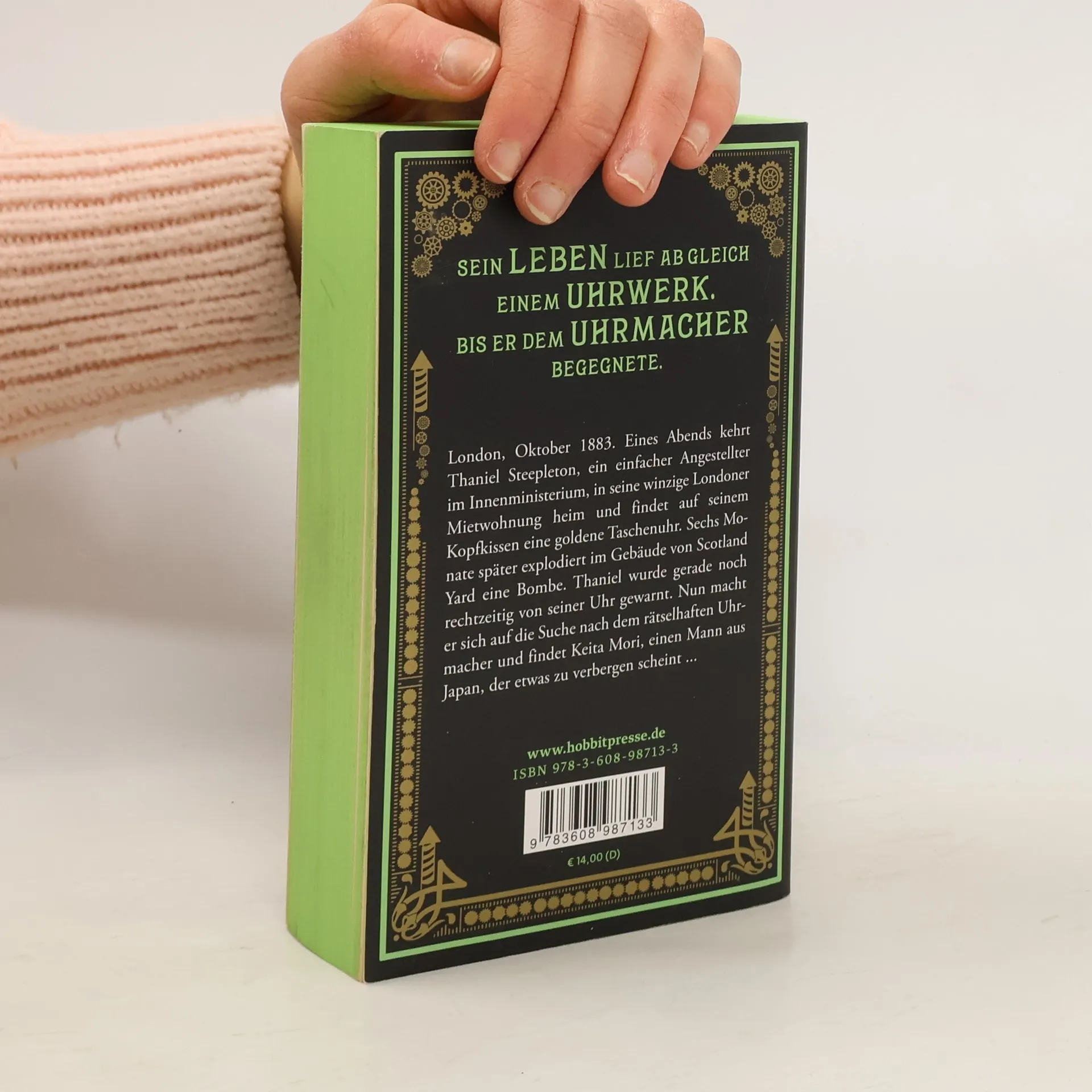 »Ein großartiges Lesevergnügen. Stark, voller Energie!« Die Geschichte entfaltet sich im viktorianischen England und im Japan des 19. Jahrhunderts und erzählt von einer geheimnisvollen Uhr sowie einem spektakulären Bombenanschlag auf Scotland Yard. Im Oktober 1883 kehrt Thaniel Steepleton, ein einfacher Angestellter im Innenministerium, nach Hause zurück und findet auf seinem Kopfkissen eine goldene Taschenuhr, deren Ursprung ihm ein Rätsel bleibt. Sechs Monate später explodiert eine Bombe im Gebäude von Scotland Yard, doch Thaniel wird rechtzeitig gewarnt, da seine Uhr ein Alarmsignal gibt. Auf der Suche nach dem Uhrmacher trifft er auf Keita Mori, einen freundlichen, aber einsamen Japaner. Trotz seiner harmlosen Erscheinung deutet eine Reihe unheimlicher Ereignisse darauf hin, dass Mori ein Geheimnis hat. Inmitten dieser spannenden Handlung stellt der Autor nachdenkliche Fragen zu freiem Willen, Schicksal und Identität und schafft eine fesselnde Mischung aus historischer Fantasie, Philosophie und intensiven Emotionen.