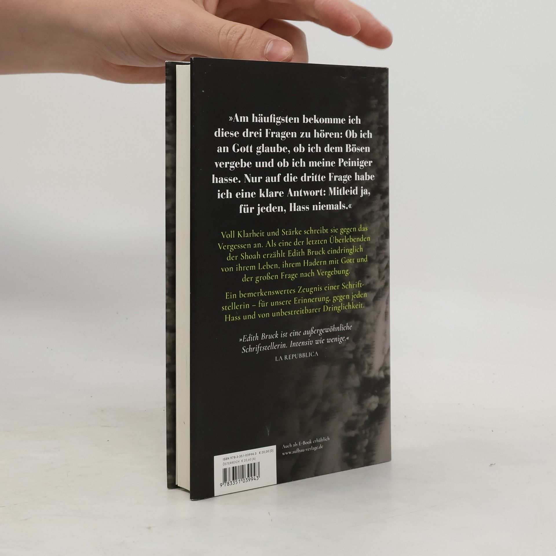 Das berührende Memoir und die einzigartige Biographie einer Shoah-Überlebenden, die sich bis heute gegen das Vergessen engagiert Als junges Mädchen läuft sie unbeschwert durch die staubigen Gassen des kleinen ungarischen Dorfes, in dem sie mit ihrer Familie lebt. Bis sie eines Tages nach Auschwitz deportiert wird. Edith Bruck, eine der letzten Überlebenden der Shoah, blickt zurück auf ihre eigene Geschichte. Sie erzählt, wie sie nach der Erfahrung absoluter Grausamkeit und Unmenschlichkeit zurück ins Leben findet, wie sie sich in Israel fremd fühlt, sich einer Tanztruppe anschließt und schließlich in Italien niederlässt, wo sie eine neue Sprache lernt, auf der sie bis heute schreibt. Ihre Worte zeugen von großer Stärke und Klarheit: Eindringlich schildert sie ihr Hadern mit Gott, ihr Festhalten an Vergebung und ihr vehementes Eintreten gegen das Vergessen. »Edith Bruck ist eine außergewöhnliche Schriftstellerin. Intensiv wie wenige.« La Repubblica