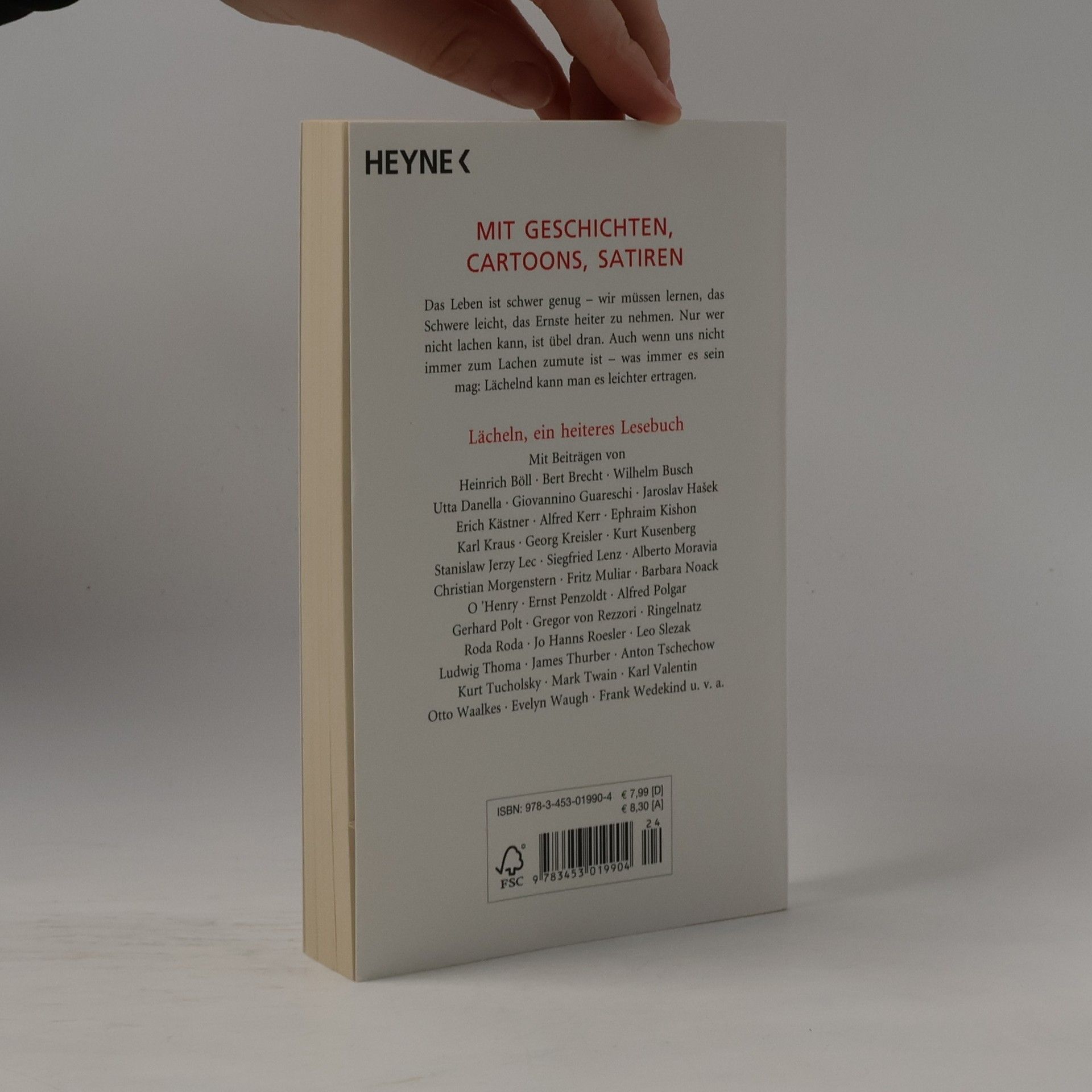 Das Leben ist schwer genug – wir müssen lernen, das Schwere leicht, das Ernste heiter zu nehmen. Nur wer nicht lachen kann, ist übel dran. Auch wenn uns nicht immer zum Lachen zumute ist – was immer es sein mag: Lächelnd kann man es leichter ertragen.Mit Beiträgen von Heinrich Böll · Bert Brecht · Wilhelm Busch · Utta Danella · Giovannino Guareschi · Jaroslav Hašek · Erich Kästner · Alfred Kerr · Ephraim Kishon · Karl Kraus · Georg Kreisler · Kurt Kusenberg · Stansilaw Jerzy Lec · Siegfried Lenz · Alberto Moravia · Christian Morgenstern · Fritz Muliar · Barbara Noack · O'Henry · Ernst Petzold · Alfred Polgar · Gerhard Polt · Gregor von Rezzori · Ringelnatz · Roda Roda · Jo Hanns Roesler · Leo Slezak · Ludwig Thoma · James Thurber · Anton Tschechow · Kurt Tucholsky · Mark Twain · Karl Valentin · Otto Waalkes · Evelyn Waugh · Frank Wedekind u. v. a.