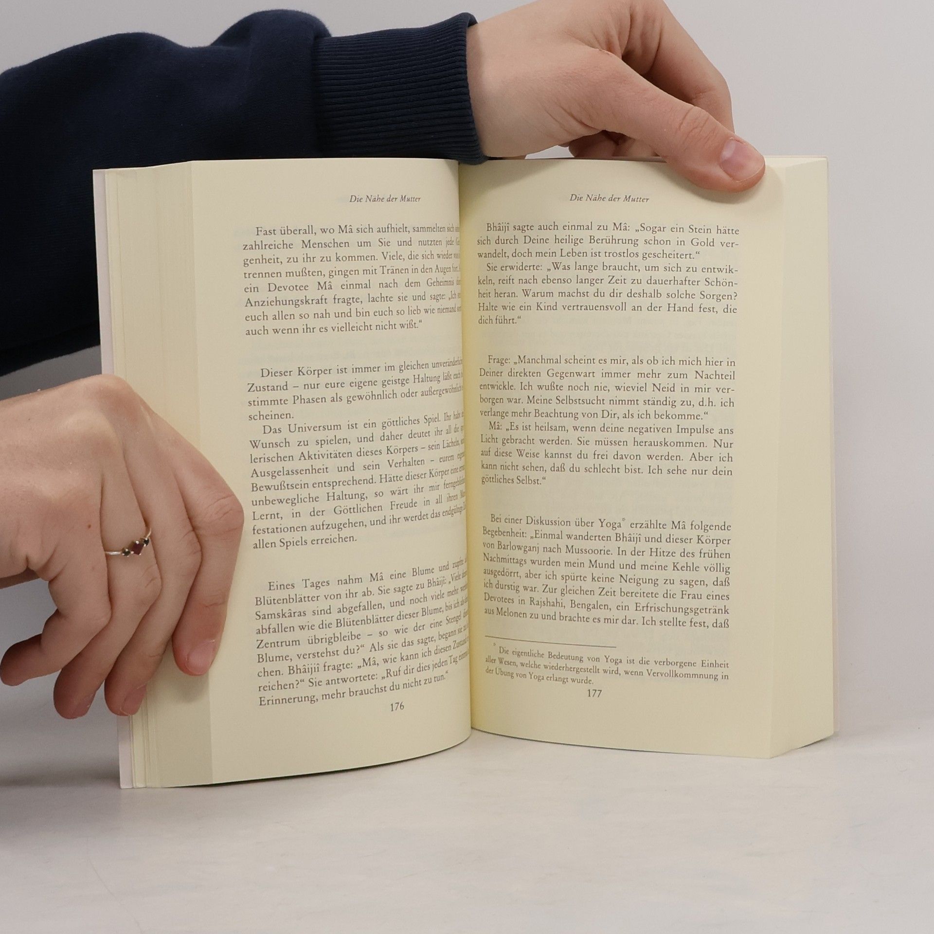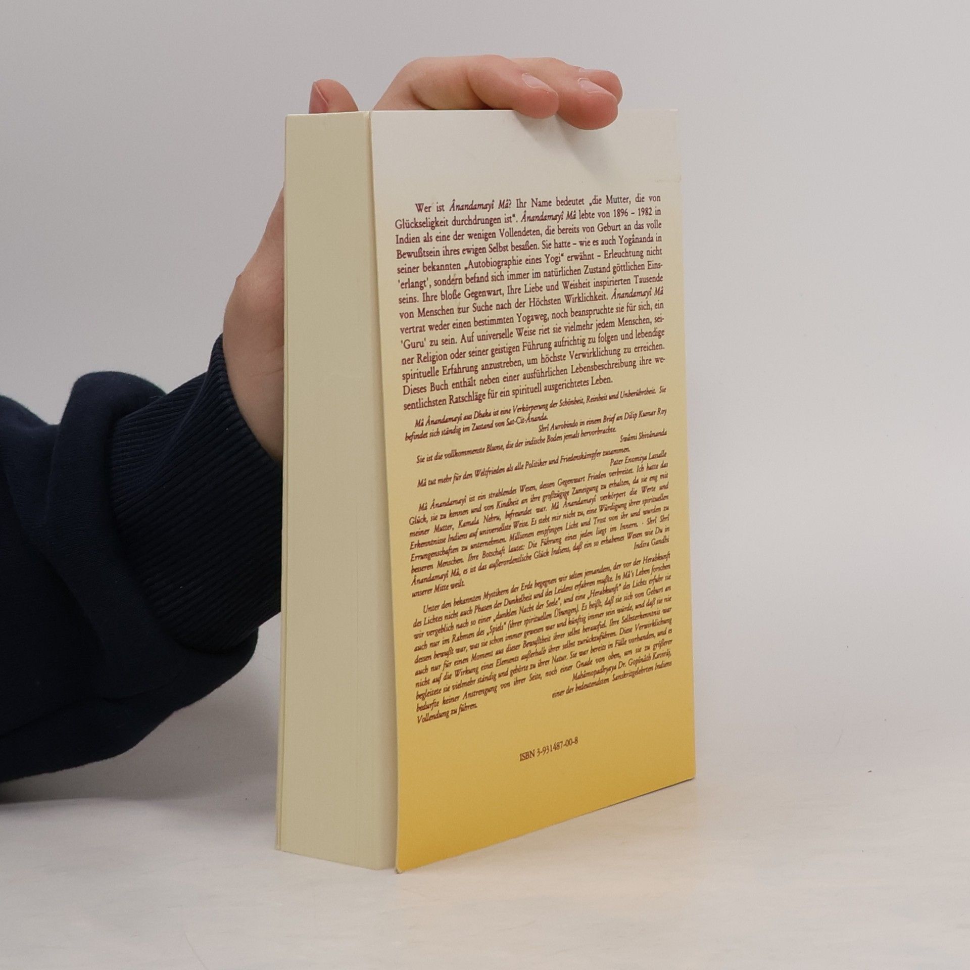 Wer ist Ânandamayî Mâ? Ihr Name bedeutet „die Mutter, die von Glückseligkeit durchdrungen ist“. Sie lebte von 1896 bis 1982 in Indien und war eine der wenigen Vollendeten, die von Geburt an das volle Bewusstsein ihres ewigen Selbst besaßen. Wie Yogânanda in seiner „Autobiographie eines Yogi“ erwähnt, hatte sie Erleuchtung nicht „erlangt“, sondern befand sich immer im Zustand göttlichen Einsseins. Ihre bloße Gegenwart, Liebe und Weisheit inspirierten Tausende zur Suche nach der Höchsten Wirklichkeit. Ânandamayî Mâ vertrat keinen bestimmten Yogaweg und beanspruchte nicht, ein ‚Guru‘ zu sein. Vielmehr riet sie universell, seiner Religion oder seinem Meister aufrichtig zu folgen und lebendige spirituelle Erfahrungen anzustreben. Dieses Buch enthält ihre wesentlichen Ratschläge für ein spirituell ausgerichtetes Leben. Mâ Ânandamayî aus Dhaka verkörpert Schönheit, Reinheit und Keuschheit und befindet sich ständig im Zustand von Sat-Cit-Ânanda. Sie wird von Swâmi Shivânanda als die vollkommenste Blume Indiens bezeichnet. Pater Enomiya Lassalle sagt, dass sie mehr für den Weltfrieden tut als alle Politiker und Friedenskämpfer zusammen. Im Gegensatz zu vielen Mystikern erlebte Mâ keine Phasen der Dunkelheit oder des Leidens. Ihre Selbsterkenntnis war von Geburt an präsent und nicht von äußeren Elementen abhängig. Diese Verwirklichung war Teil ihrer Natur und bedurfte keiner Anstrengung oder Gnade, um sie zu erreichen.