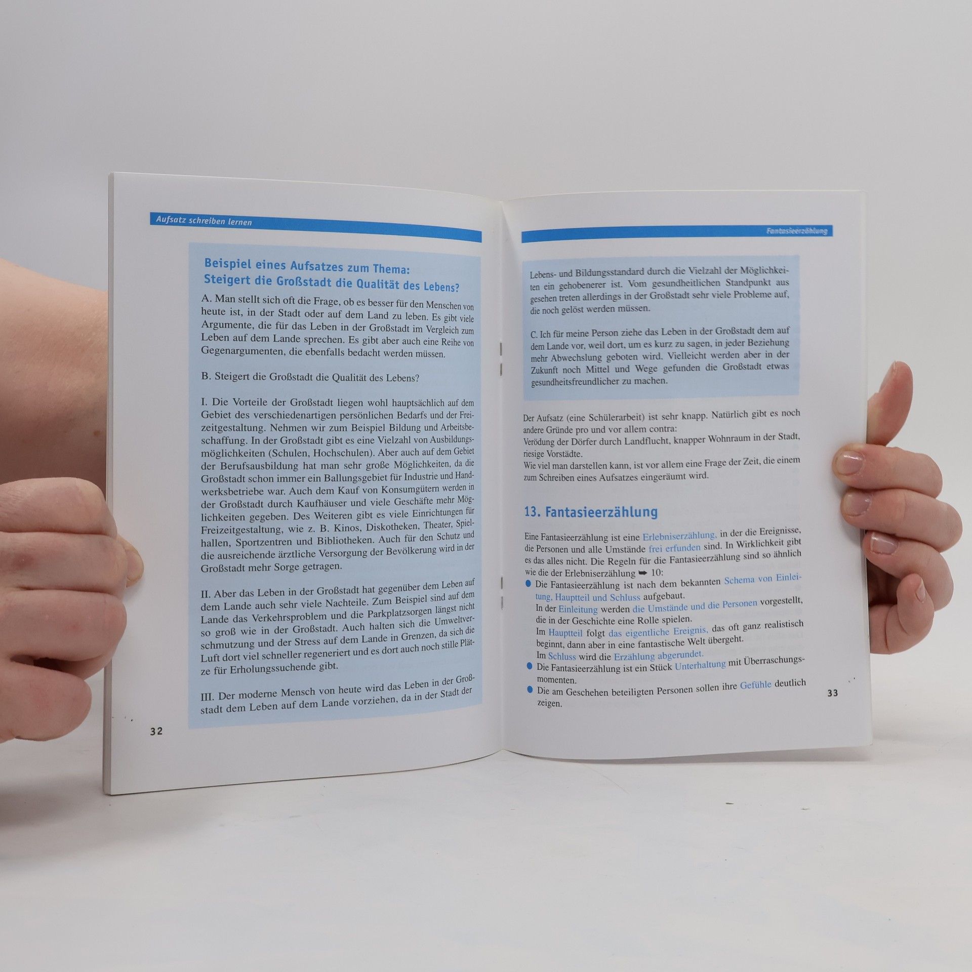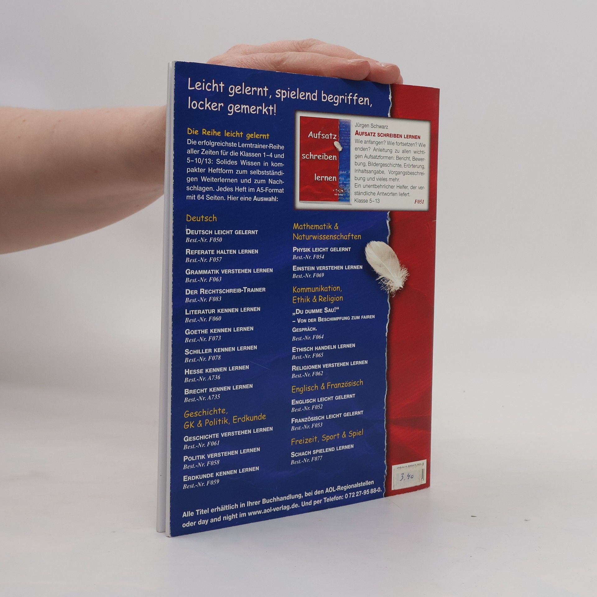 Wie anfangen? Wie fortsetzen? Wie enden? Das sind grundsätzliche Fragen, wenn man einen Aufsatz schreiben will - oder soll. Aber nicht verzweifeln! Dieses Heft gibt Anleitung zu allen wichtigen Aufsatzformen der Sekundarstufe I: von der Begriffserläuterung über Bericht, Bewerbung, Bildergeschichte, Charakteristik, Inhaltsangabe quer durchs Alphabet bis zur Vorgangsbeschreibung. Dazu immer wieder Hinweise zur Arbeitstechnik, zu sprachlich-stilistischen Besonderheiten und zur Gliederung. Mit farblicher Hervorhebung aller Begriffe, ganz in Blau, und übersichtlichen Schaubildern. Mit zahlreichen Musteraufsätzen - auch von Schülerhand. Wer das Wichtigste wiederholen oder sich gezielt auf eine Klassenarbeit vorbereiten möchte, kann sich hier schnell und gründlich informieren. Ein Register erleichtert das Auffinden. Jürgen Schwarz hat dieses Schülerheft verständlich geschrieben und alles übersichtlich dargestellt, ironisch übertriebene Empfehlungen des Satirikers Kurt Tucholsky sorgen für den nötigen Humor. Denn auch nach vielen Jahren der Korrektur von Schüleraufsätzen ist Schwarz überzeugt: „Aufsatzschreiben ist etwas Herrliches!“