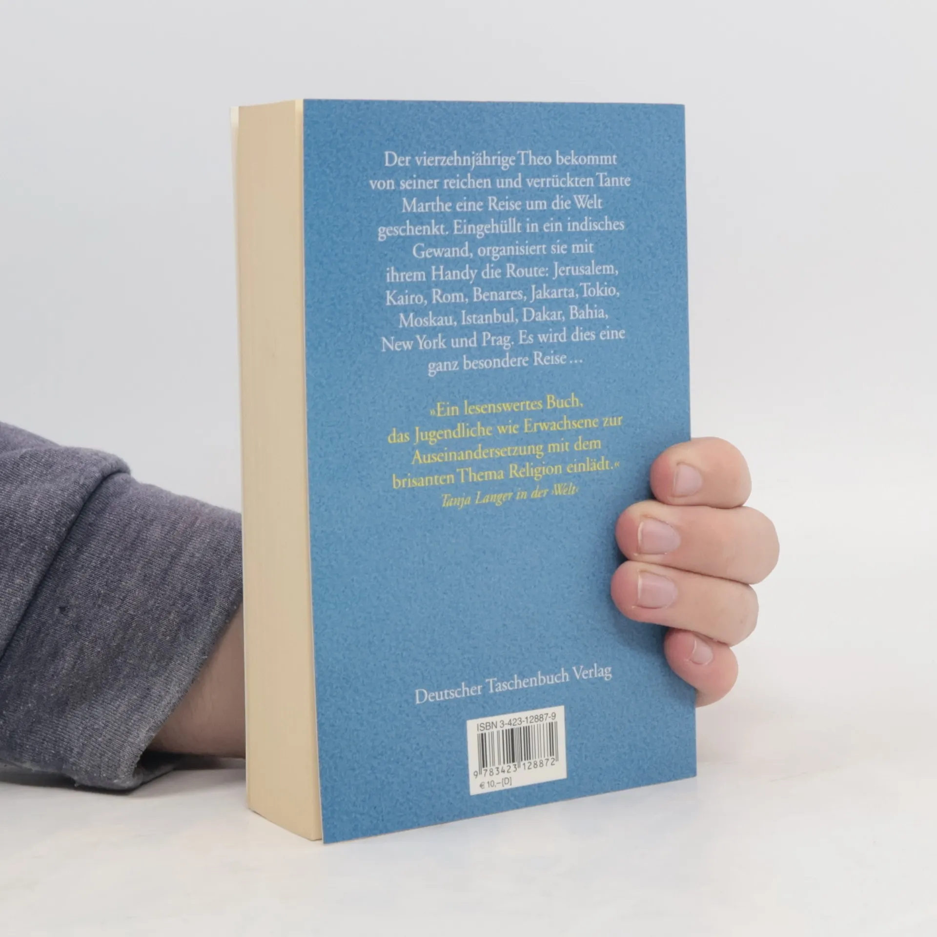 Er ist ein Morgenmuffel und liest bis spät in die Nacht Bücher über das alte Ägypten oder tibetanische Totenbücher. Theo ist 14 Jahre alt und lebt in Paris. Und wenn er nicht gerade seinen Kopf in Bücher steckt, sitzt er vor dem Computer und versucht das Rätsel des Tages zu lösen, das ihm seine rothaarige Computerfreundin Pythia stellt. In Theos Leben gibt es noch seine senegalesische Freundin Fatou, seine griechische Mutter Melina, seinen französischen Vater Jérôme und seine beiden Schwestern. Als sein morgendlicher Schwindel nicht nachläßt, erfährt Theo nach einem Arzttermin, dass er schwer krank ist. Eine mysteriöse Krankheit, die schlimmstenfalls mit dem Tod enden kann. Die Ärzte sind machtlos. Kurzerhand plant seine Tante Marthe eine ungewöhnliche Reise - eine Reise durch die Religionen der Welt. Theo sieht Jerusalem, Kairo, Rom, Benares, Jakarta, Tokio, Moskau, Istanbul, Dakar, Bahia, New York und Prag. Überall treffen er und Tante Marthe kundige Führer, die vom Judentum bis zum Schamanismus, von der Urkirche bis zum Mormonentum Glaubensrichtungen erklären und ihn sogar an den wichtigsten Festen und Riten teilnehmen lassen. Bei einem dieser Riten erfährt Theo, dass seine Zwillingsschwester kurz nach der Geburt gestorben ist. Ein Tod, über den seine Eltern nie sprechen wollten. Wider aller Hoffnung wird Theo am Ende geheilt, jedoch nicht von der klassischen Medizin, sondern von Medizinmännern.