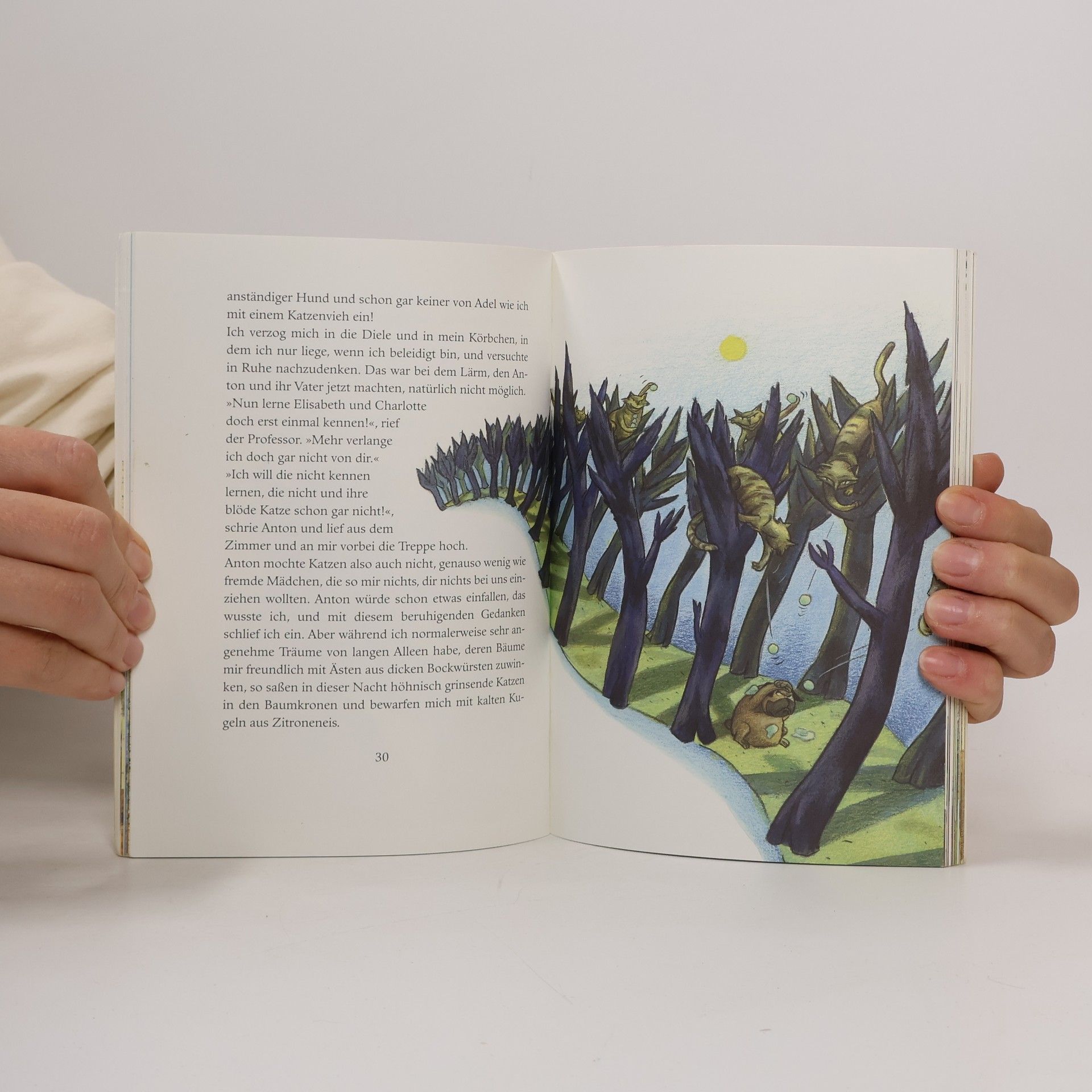 Eigentlich ist Harro von und zu Donnersmarck, genannt Mops, mit seinem Leben vollkommen zufrieden. Bis Antons Vater sich einbildet, wieder eine neue Frau zu brauchen. Als dann eine fremde Frau, ein noch fremderes Mädchen und eine Katze in ihr Haus einziehen, ist nichts mehr, wie es einmal war. Anton, die in Wirklichkeit Antonia heißt, ist stinkwütend auf ihren Vater. Sie heult fast nur noch und vergisst immer öfter, Mops' Fressnapf zu füllen. Klar, dass Mops das nicht länger mit ansehen kann! Schließlich bleibt ihm nichts anderes übrig, als sich mit dieser blöden Katze, die auch noch Molly Mendelssohn heißt, zu verbünden, damit endlich wieder Frieden einkehrt.