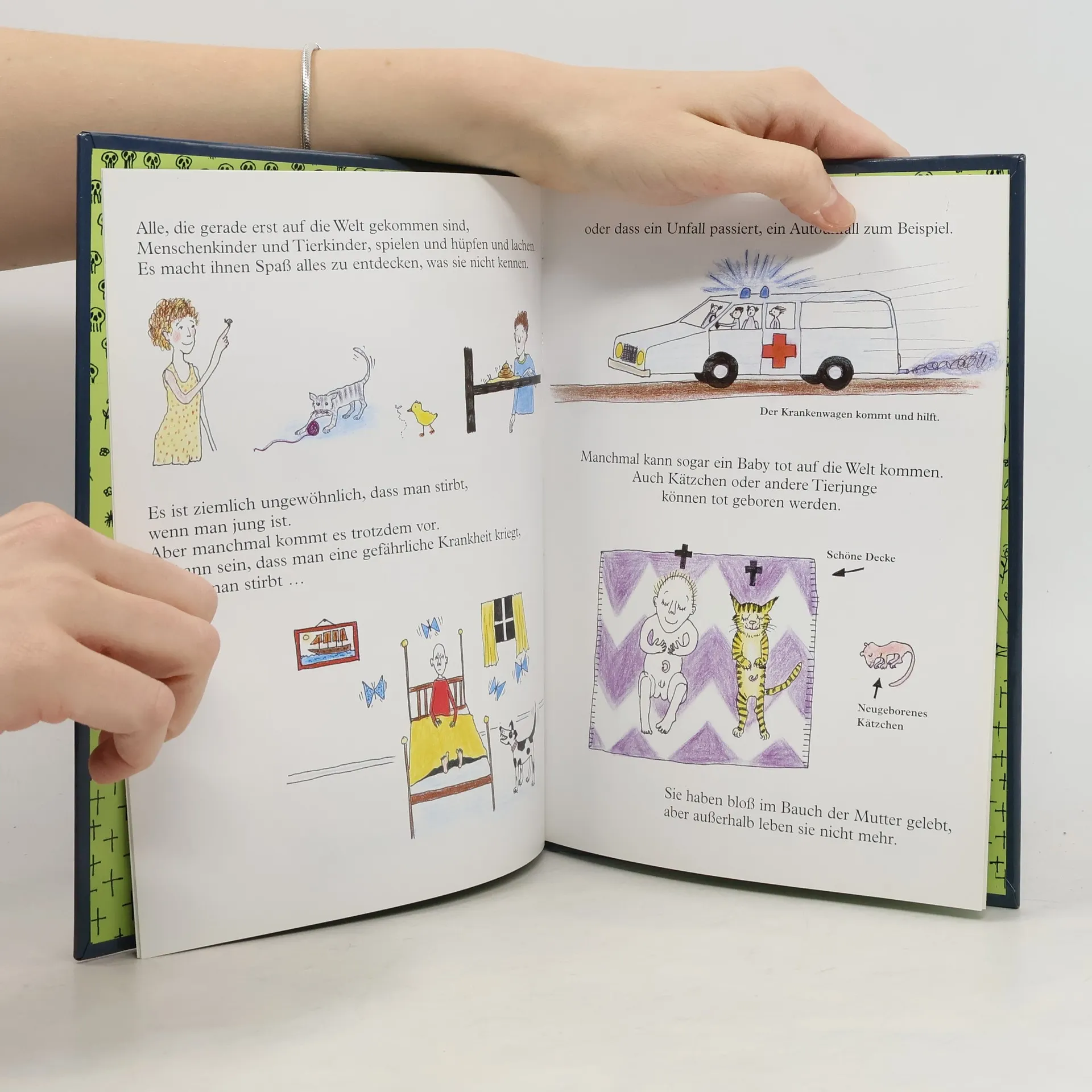 Souverän und gleichzeitig lustig kommt dieses Kinderbuch vom Tod aus Schweden daher. Es beantwortet Fragen, die sich Kinder stellen und wird dabei niemals sentimental. Und was kommt dann? Das möchten nicht nur Kinder wissen, wenn es um den Tod geht. Pernilla Stalfelt nähert sich dem Thema auf gleichermaßen eigenwillige wie kindernahe Weise: Sie erklärt erst einmal, wer alles sterben muss: Blumen und Marienkäfer genauso wie Erwin und Klein-Bobo. Und dass Fische ihre Augen nie zumachen, selbst wenn sie tot sind.»Der Tod kann ganz schnell kommen. An einem Tag hat man seinen Opa noch. Am anderen kann man ihn vielleicht schon nicht mehr treffen. Das ist dann sehr leer und traurig.« Es geht um die Zeit nach dem Tod. Kinder erfahren, dass es eine Beerdigung gib, ein Grab und den Leichenschmaus. Dieses Buch ist durchaus ernst gemeint, bringt aber durch Illustrationen und Aufbau unterhaltsame Aspekte in ein Thema, das vor Kindern allzu oft tabuisiert wird. Die Autorin, deren Illustrationsstil in Schweden hohe Anerkennung erfahren hat, arbeitet regelmäßig mit Kindern und weiß um die Fragen, die sie stellen.