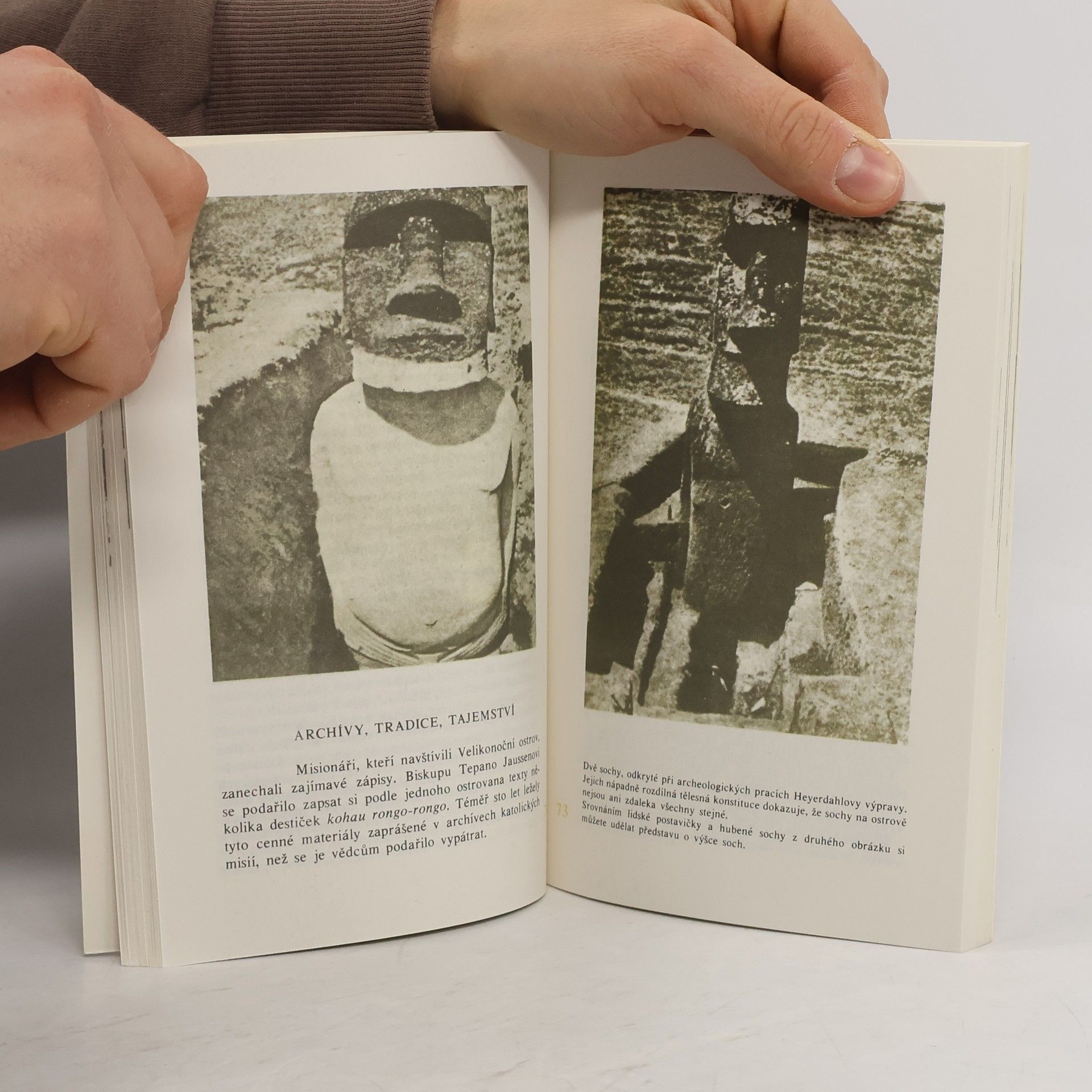 Na Rano Raraku cítíš, jak tě celého prostupuje tajemství Velikonočního ostrova. Jak je jím nasycen vzduch kolem tebe. Civí na tebe sto padesát mlčenlivých, záhadných obličejů bez očí, prohlížejí si tě z každého výčnělku, z každé prohlubně ve skále, kde dosud nenarození i mrtví obři leží jako v kolébce nebo na úmrtním loži, bezmocní a bez života, jak je opustila tvůrčí síla, která je kdysi vytvářela...
