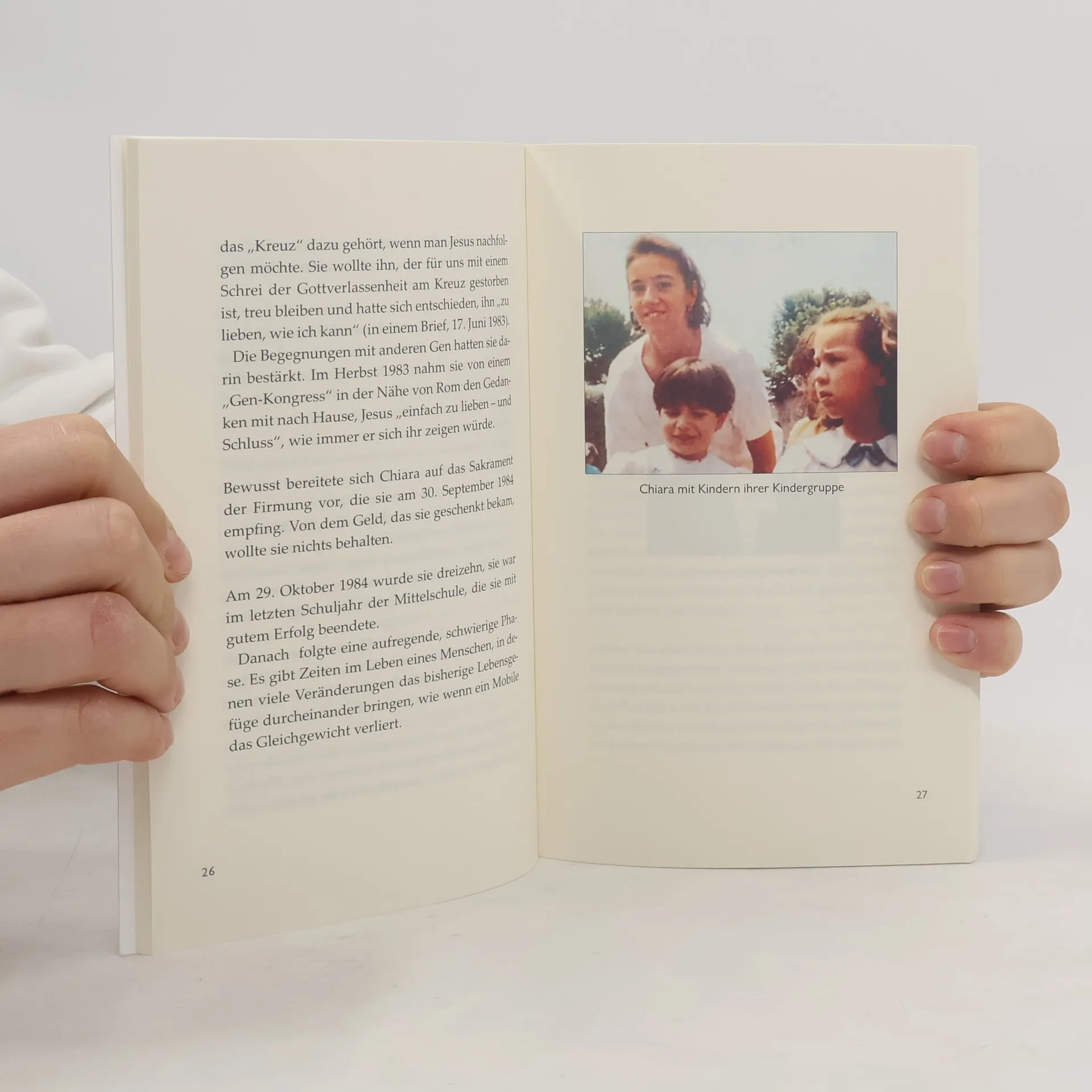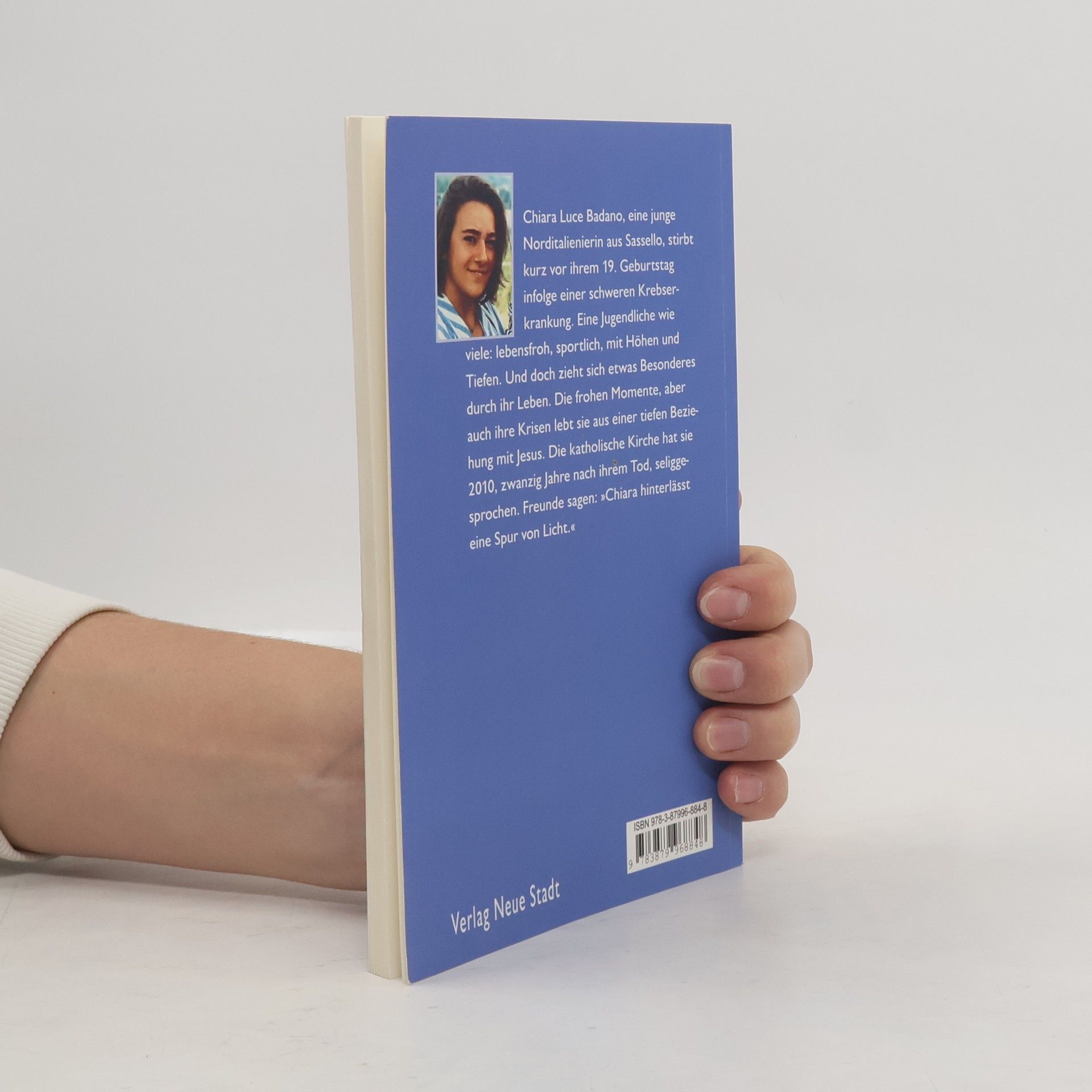 Chiara Badano kommt 1971 in einem kleinen Dorf in Norditalien zur Welt. Der Vater LKW-Fahrer, die Mutter Angestellte in einem Betrieb, der Amaretti herstellt. Chiara besucht den Kindergarten und die Grundschule im 2000-Seelen-Dorf Sasello, treibt Sport, lernt Klavierspielen. Als sie 14 Jahre alt ist, hat sie so manche Bewährungsprobe zu bestehen: Im Gymnasium muss sie die Klasse wiederholen, die Familie zieht in die Stadt Savona, ihre Freundin beginnt ihr Studium in Turin. Im Januar des Jahres 1989 wird ein Knochenkrebs diagnostiziert. Es folgen Operationen, Chemos, verschiedene Therapien, Hoffnungen, Enttäuschungen … Geprägt von einer tiefen Beziehung zu Jesus gestaltet Chiara ihren Umgang mit ihrer Familie, ihren Freundinnen und Bekannten und auch mit ihrer Erkrankung. Ihr Verhalten weckt Erstaunen, ihre innere Klarheit und die tiefe Freude in ihren Augen wirken anziehend. Als Chiara Badano am 7. Oktober 1990 stirbt, bleibt das Zeugnis eines jungen Menschen, der den Alltäglichkeiten des Lebens eine große Bedeutung geben konnte. Chiara Badano wird am 25. September 2010 in Rom seliggesprochen. – Das vorliegende Buch bietet eine kurze Biografie mit Selbstzeugnissen, Erinnerungen ihrer Bezugspersonen und vielen Farbfotos.