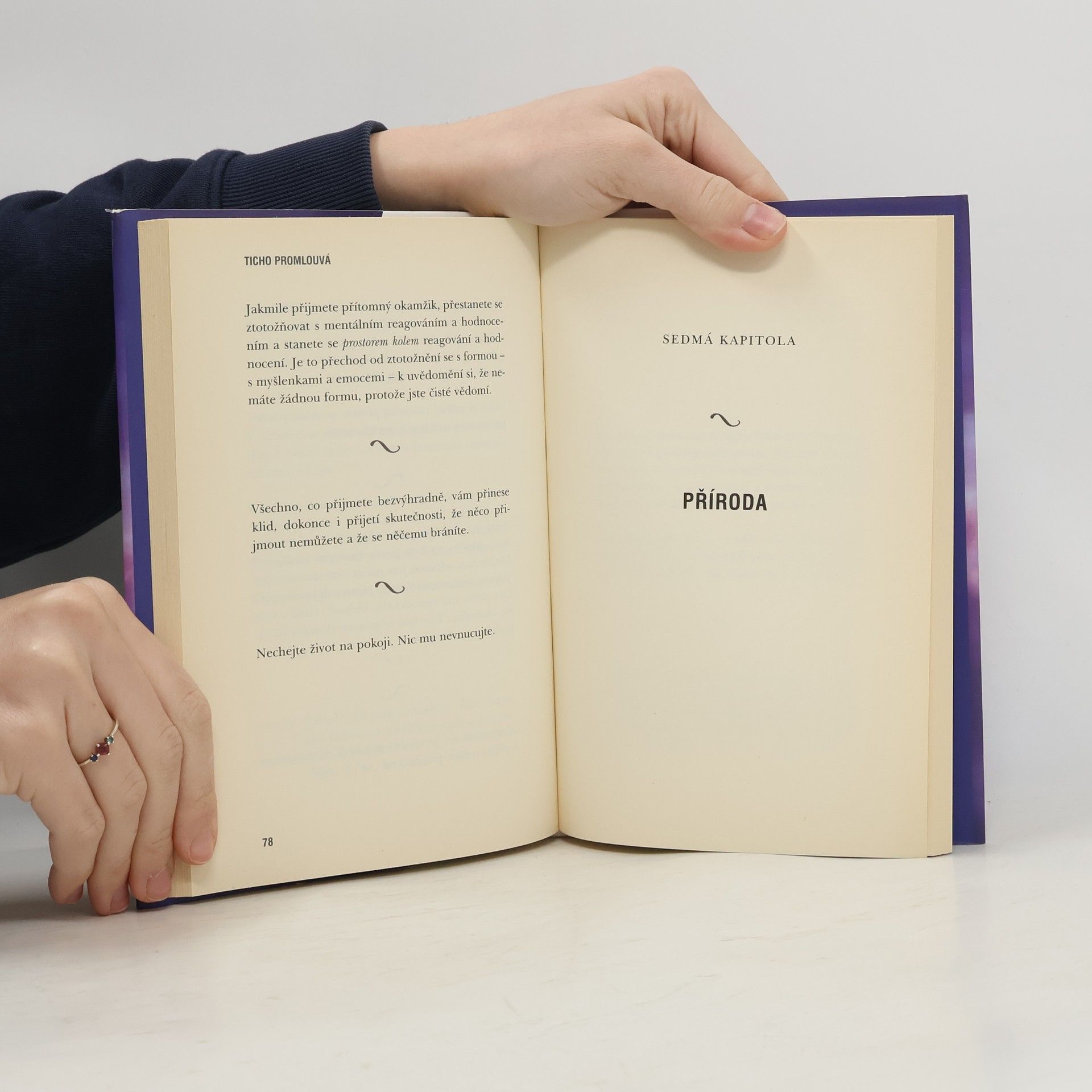Esenci Tolleova poselství je jednoduché pochopit: Když se spojíme s tichem ve svém nitru, překročíme hranice své aktivní mysli a emocí a objevíme hloubku trvalého klidu a spokojenosti. Kniha je rozdělena do deseti kapitol, z nichž každá je mozaikou stručně vyjádřených myšlenek, ale pokud je čtete jako celek, mají hluboce transformativní účinek.