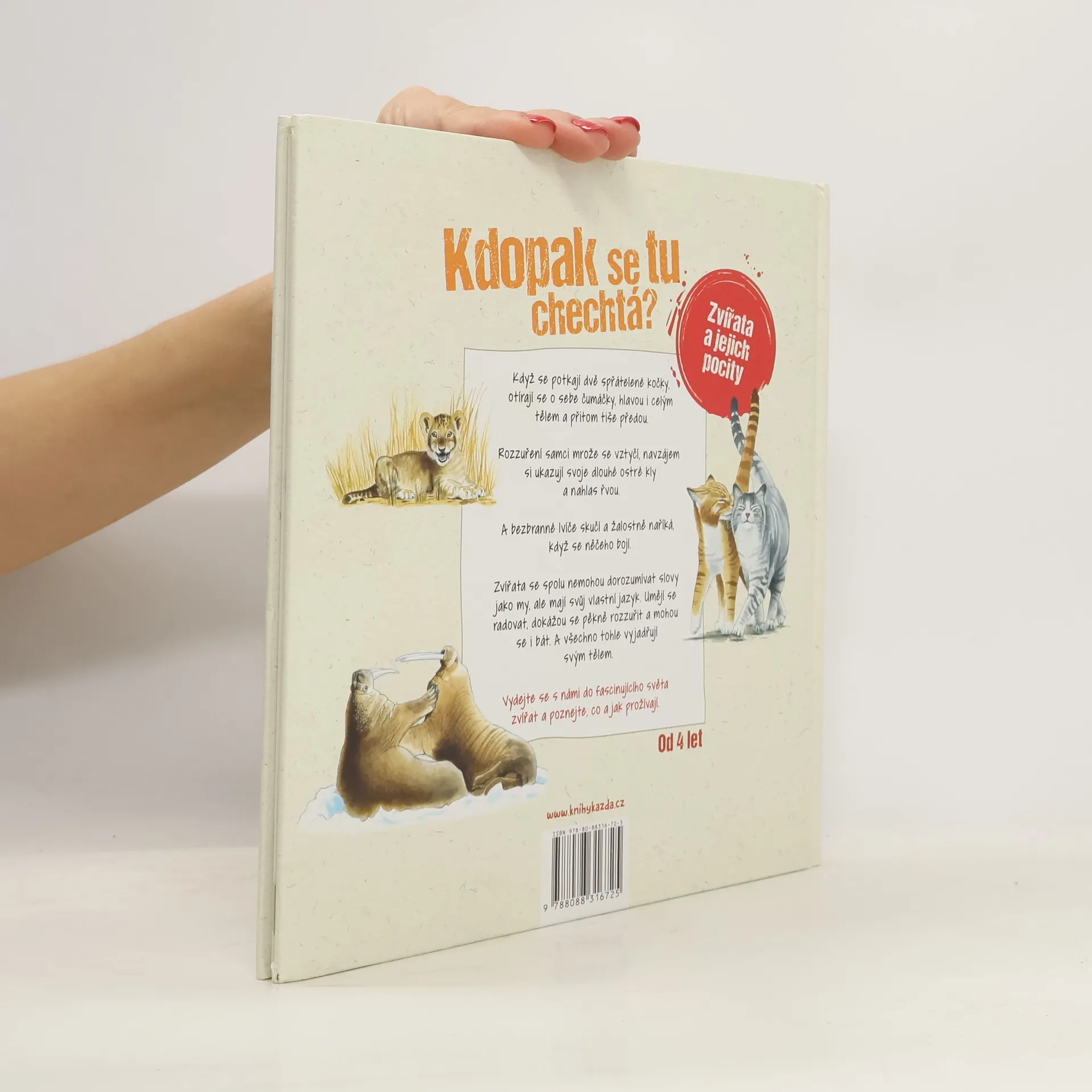 Když se potkají dvě spřátelené kočky, otírají se o sebe čumáčky, hlavou i celým tělem a přitom tiše předou. Rozzuření samci mrože se vztyčí, navzájem si ukazují svoje dlouhé ostré kly a nahlas řvou. A bezbranné lvíče skučí a žalostně naříká, když se něčeho bojí. Zvířata se spolu nemohou dorozumívat slovy jako my lidé, ale mají svůj vlastní jazyk. Umějí se radovat, dokážou se pěkně rozzuřit a mohou se i bát. A všechno tohle vyjadřují svým tělem.