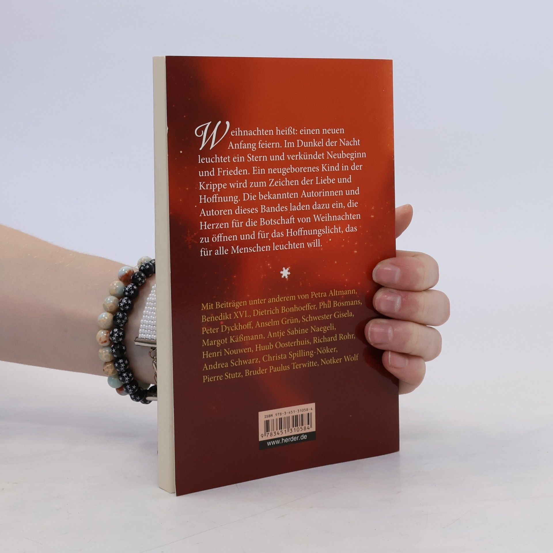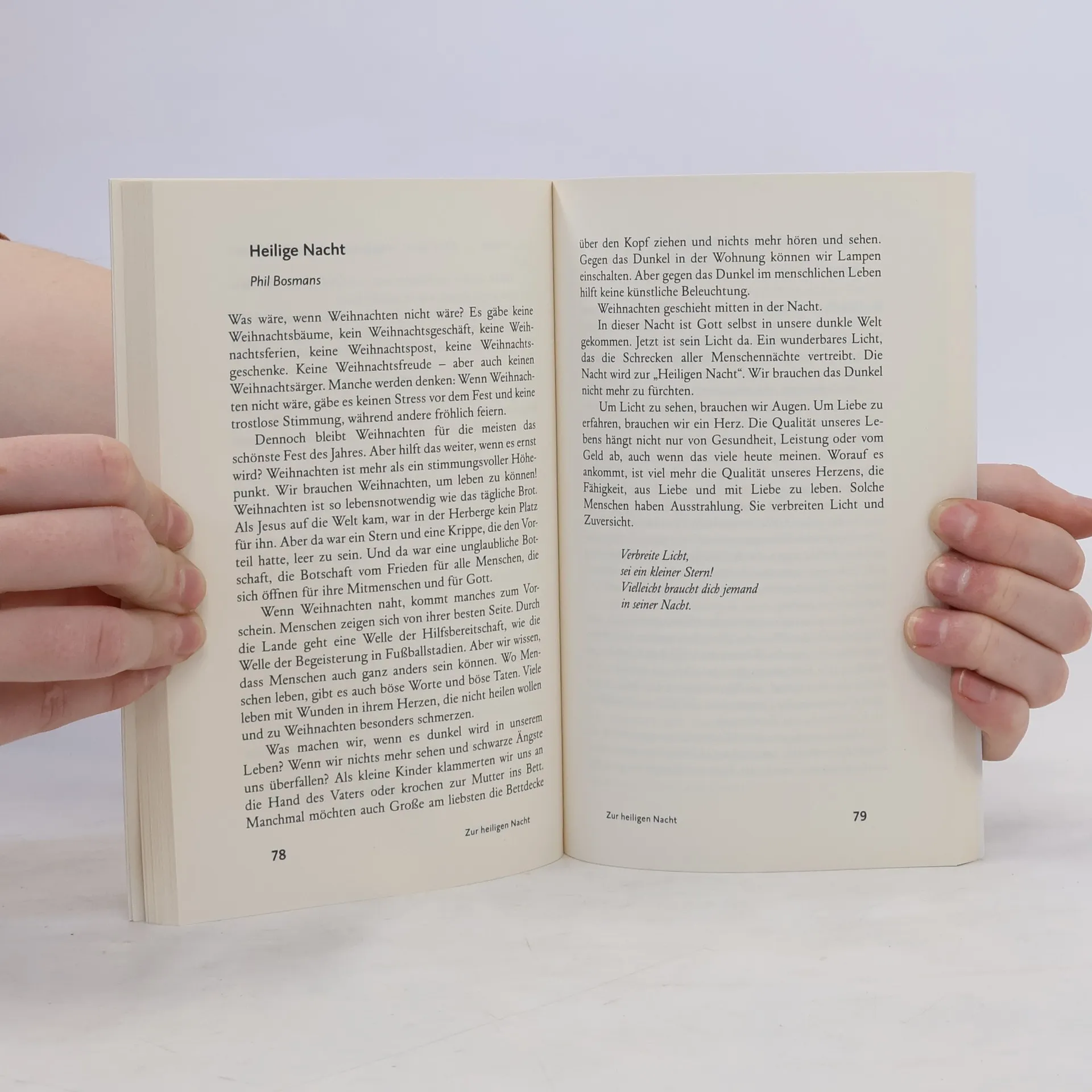 Der Weihnachtsband mit den Texten großer Autorinnen und Autoren. Die Geschichten und Betrachtungen, Lieder und Gedichte laden dazu ein, sich dem Licht zu öffnen, das die Weihnachtsbotschaft für alle Menschen bereithält. Mit Texten von Phil Bosmans, Dietrich Bonhoeffer, Benedikt XVI., Anselm Grün, Schwester Gisela, Margot Käßmann, Richard Rohr, Andrea Schwarz, Christa Spilling-Nöker, Pierre Stutz, Notker Wolf.
