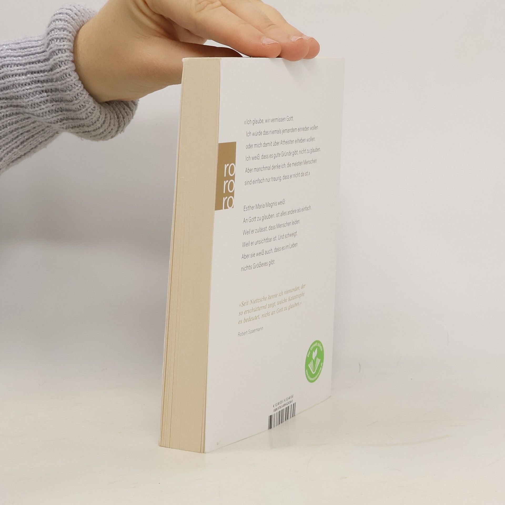 «Ich glaube, wir vermissen Gott. Ich würde das niemals jemandem einreden wollen oder mich damit über Atheisten erheben wollen. Ich weiß, dass es gute Gründe gibt, nicht zu glauben. Aber manchmal denke ich, die meisten Menschen sind einfach nur traurig, dass er nicht da ist.» Esther Maria Magnis weiß: An Gott zu glauben, ist alles andere als einfach. Weil er zulässt, dass Menschen leiden. Weil er unsichtbar ist. Und schweigt. Aber sie weiß auch, dass es im Leben nichts Größeres gibt. «Seit Nietzsche kenne ich niemanden, der so erschütternd zeigt, welche Katastrophe es bedeutet, nicht an Gott zu glauben.» (Robert Spaemann)