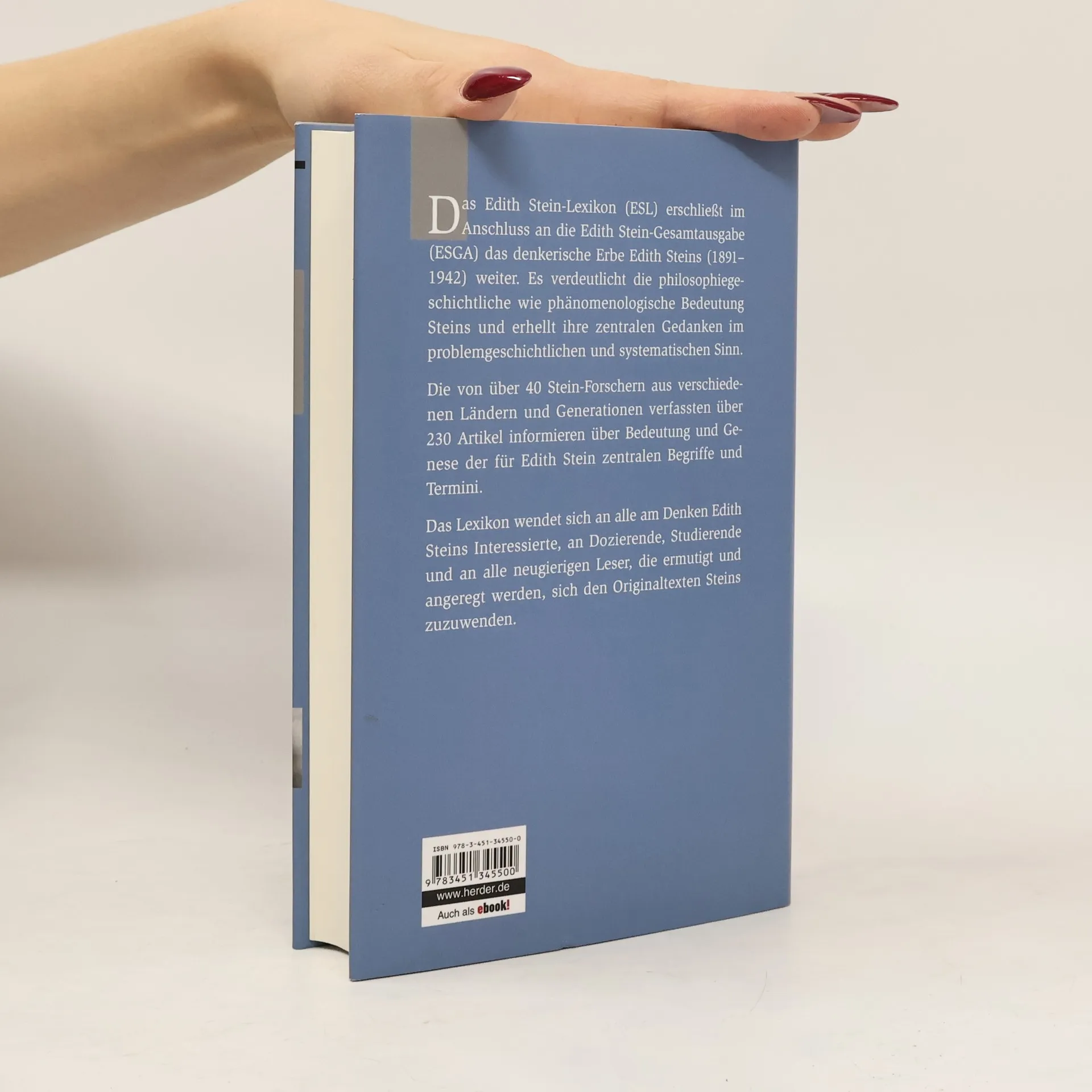 Im Anschluss an die Edith Stein-Gesamtausgabe (ESGA) erschließt das Edith Stein-Lexikon das denkerische Erbe, die philosophiegeschichtliche wie phänomenologische Bedeutung Edith Steins (1891–1942) weiter und macht es im problemgeschichtlichen und systematischen Sinn sichtbar. Die von über 40 Stein-Forschern aus verschiedenen Ländern und Generationen verfassten über 250 Artikel informieren über Bedeutung und Genese der für Edith Stein zentralen Begriffe und Termini. Das Lexikon wendet sich an alle am Denken Edith Steins Interessierte, an Dozierende, Studierende und an alle neugierigen Leser, die ermutigt und angeregt werden, sich den Originaltexten Edith Steins zum ersten Mal zuzuwenden.