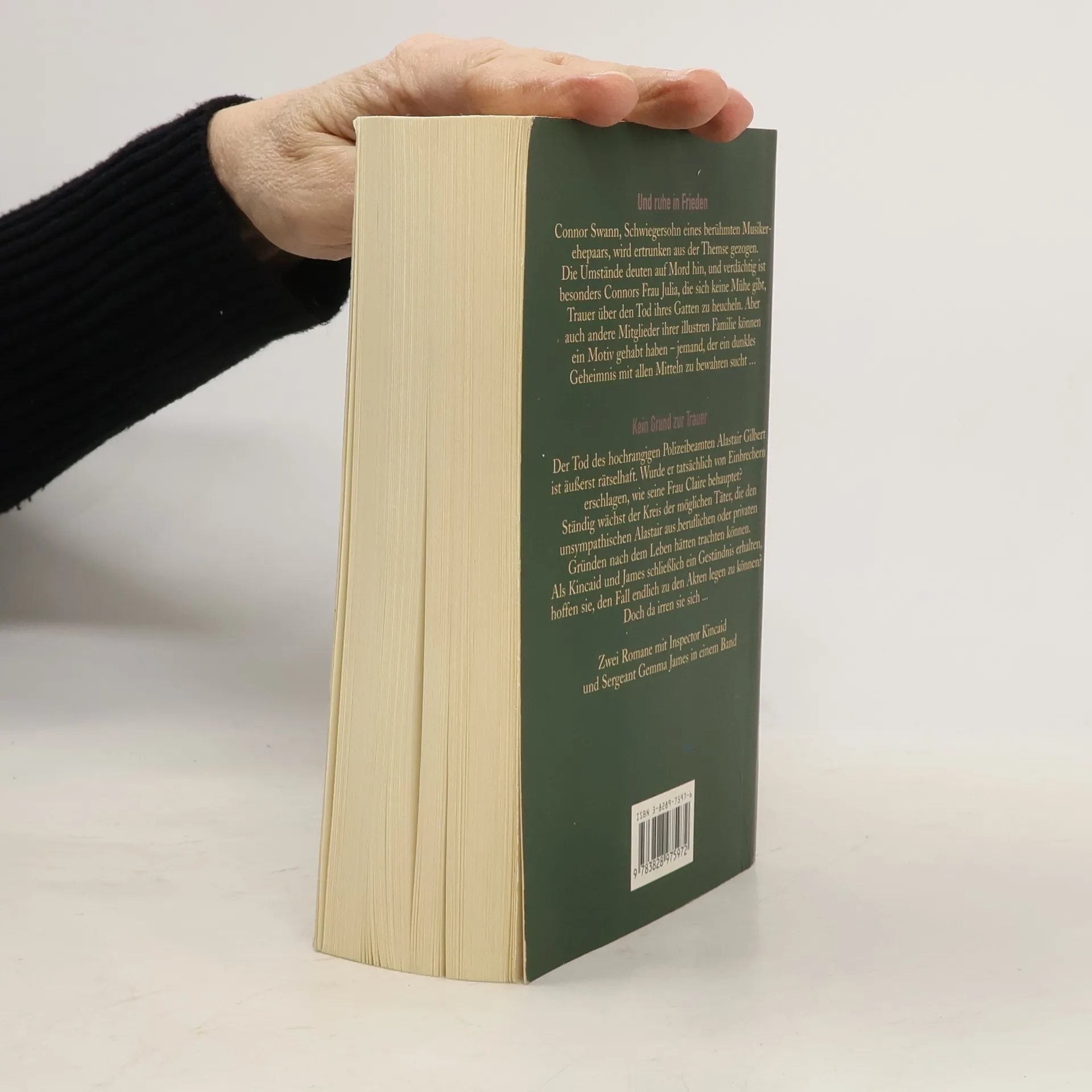 Und Ruhe in Frieden: Connor Swann, Schwiegersohn eines berühmten Musikerehepaares, wird ertrunken aus der Themse gezogen. Alles deutet auf Mord, und verdächtigt sind viele Mitglieder seiner illustren Familie. Kein Grund zur Trauer: Wurde der hochrangige Polizeibeamte Alastair Gilbert tatsächlich von Einbrechern erschlagen, wie seine Frau Claire behauptet? Ein Geständnis liegt vor, aber damit ist der Fall noch lange nicht abgeschlossen... Zwei Fälle für Inspector Kincaid und Seargeant Gemma James in einem Band.