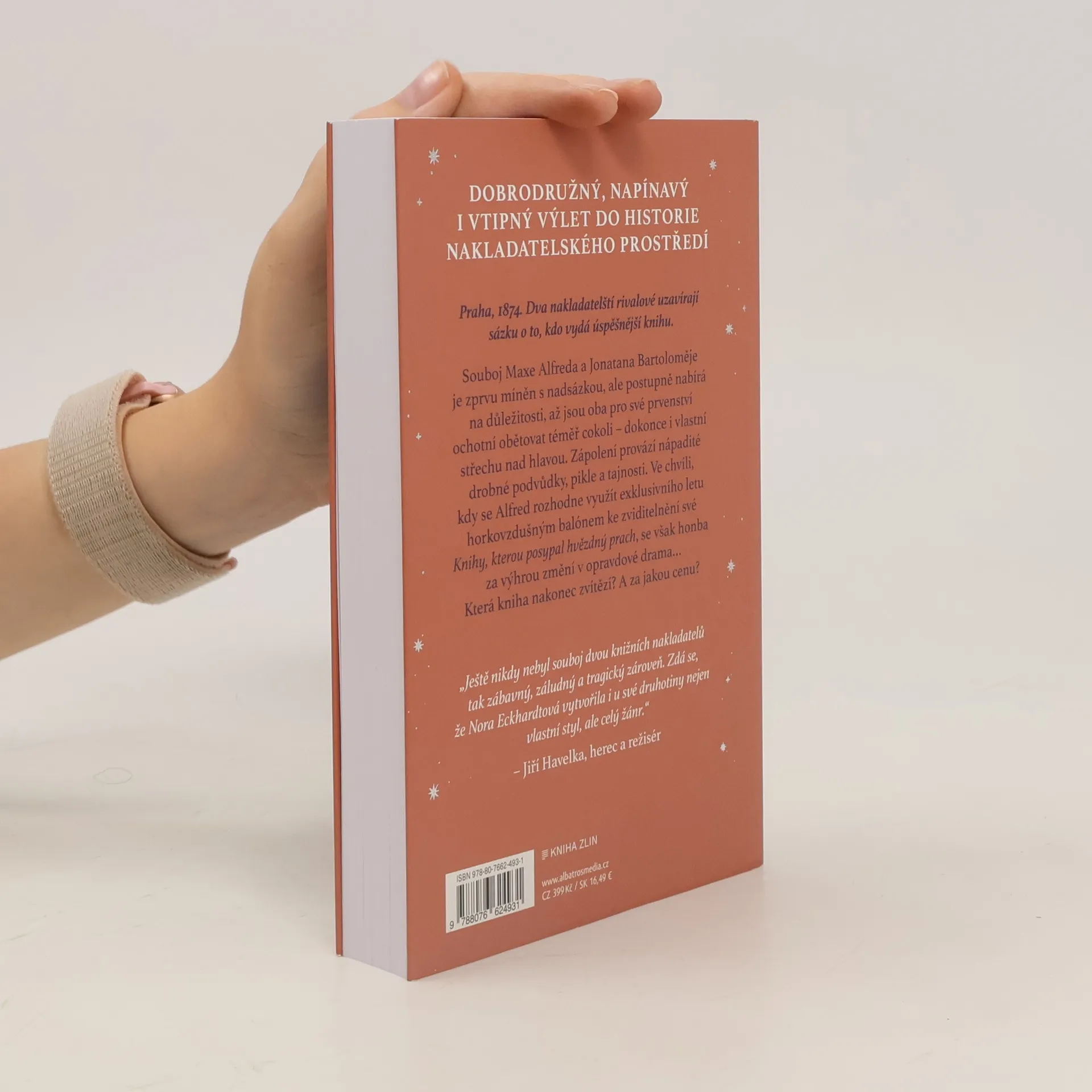 Dobrodružný, napínavý i vtipný výlet do historie nakladatelského prostředí.Praha, 1874. Dva nakladatelští rivalové uzavírají sázku o to, kdo vydá úspěšnější knihu. Souboj Maxe Alfreda a Jonatana Bartoloměje je zprvu míněn s nadsázkou, ale postupně nabírá na důležitosti, až jsou oba pro své prvenství ochotní obětovat téměř cokoli – i střechu nad hlavou. Zápolení provází drobné podvůdky, pikle a tajnosti. Ve chvíli, kdy se Alfred rozhodne využít exklusivního letu balónem ke zviditelnění své „Knihy, kterou posypal hvězdný prach“, se však honba za výhrou mění v opravdové drama…