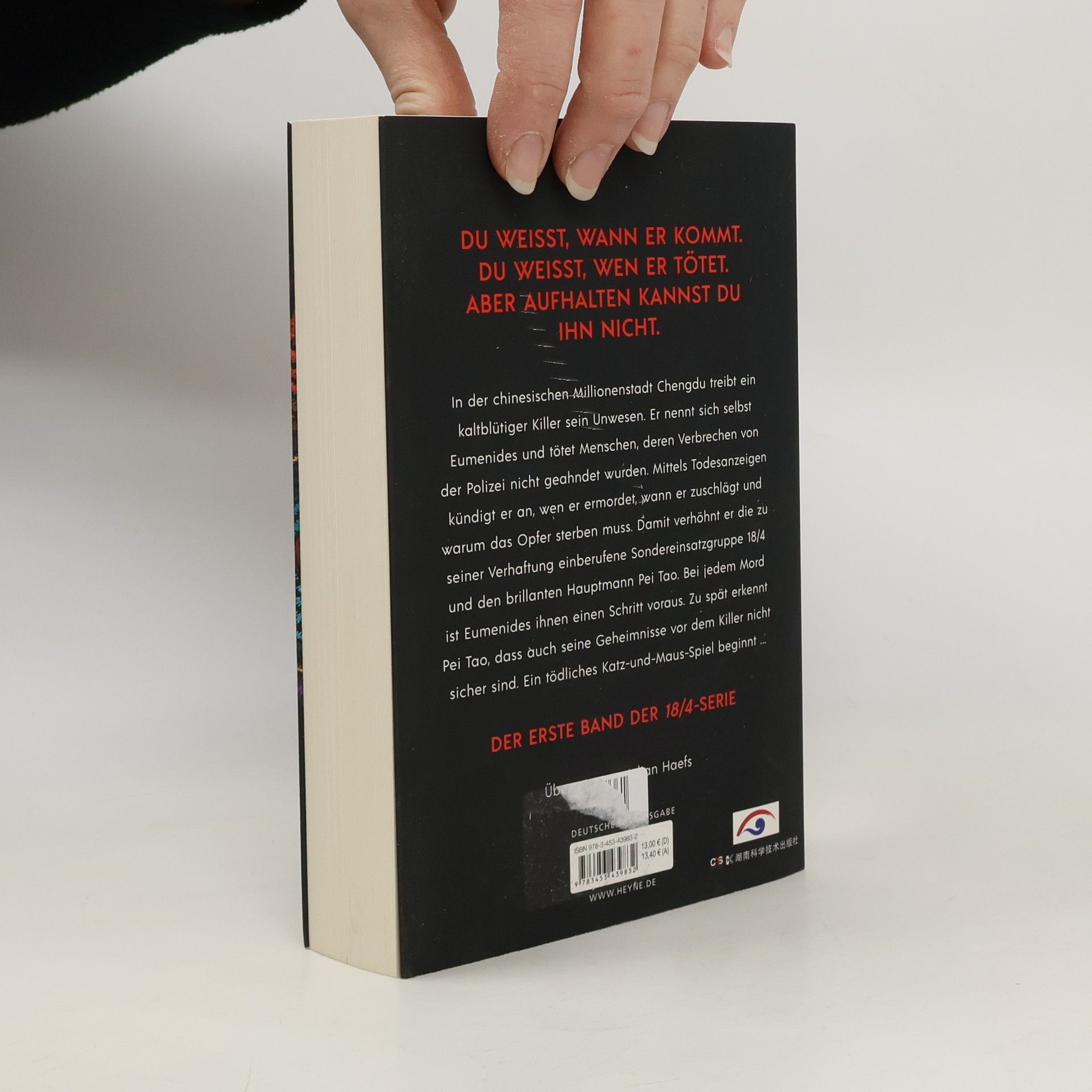 Du weißt, wann er kommt. Du weißt, wen er tötet. Aber aufhalten kannst du ihn nicht. In der chinesischen Millionenstadt Chengdu treibt ein kaltblütiger Killer sein Unwesen, der vor 18 Jahren die Polizei schon einmal zum Narren gehalten hat. Er nennt sich selbst Eumenides und tötet Menschen, deren Verbrechen von der Polizei nicht geahndet wurden. Mittels Todesanzeigen kündigt er an, wen er ermordet, wann er zuschlägt und warum das Opfer sterben muss. Damit verhöhnt er die zu seiner Verhaftung einberufene Sondereinsatzgruppe 18/4 und den brillanten Hauptmann Pei Tao. Bei jedem Mord ist Eumenides ihnen einen Schritt voraus. Zu spät erkennt Pei Tao, dass auch seine Geheimnisse und Vergehen vor dem Killer nicht sicher sind. Ein tödliches Katz-und-Maus-Spiel beginnt …