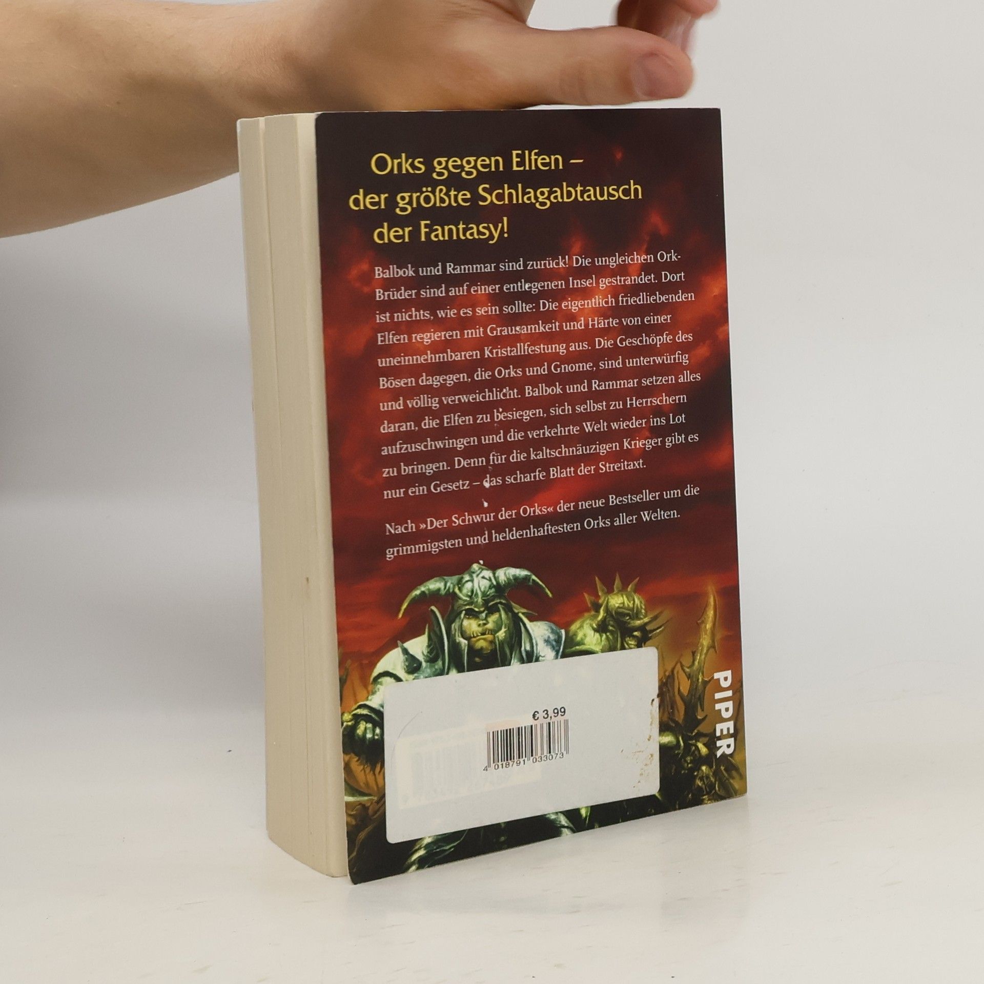 Nach »Der Schwur der Orks« Band 3 der Bestseller-Reihe um die grimmigsten und heldenhaftesten Orks aller Welten: Balbok und Rammar sind zurück! Die ungleichen Ork-Brüder sind auf einer entlegenen Insel gestrandet. Dort ist nichts, wie es sein sollte. Die eigentlich friedliebenden Elfen regieren mit Grausamkeit und Härte von einer uneinnehmbaren Kristallfestung aus. Die Geschöpfe des Bösen dagegen, die Orks und Gnome, sind unterwürfig und völlig verweichlicht. Balbok und Rammar setzen alles daran, die verkehrte Welt wieder ins Lot zu bringen. Denn für die kaltschnäuzigen Krieger gibt es nur ein Gesetz – das scharfe Blatt der Streitaxt.
