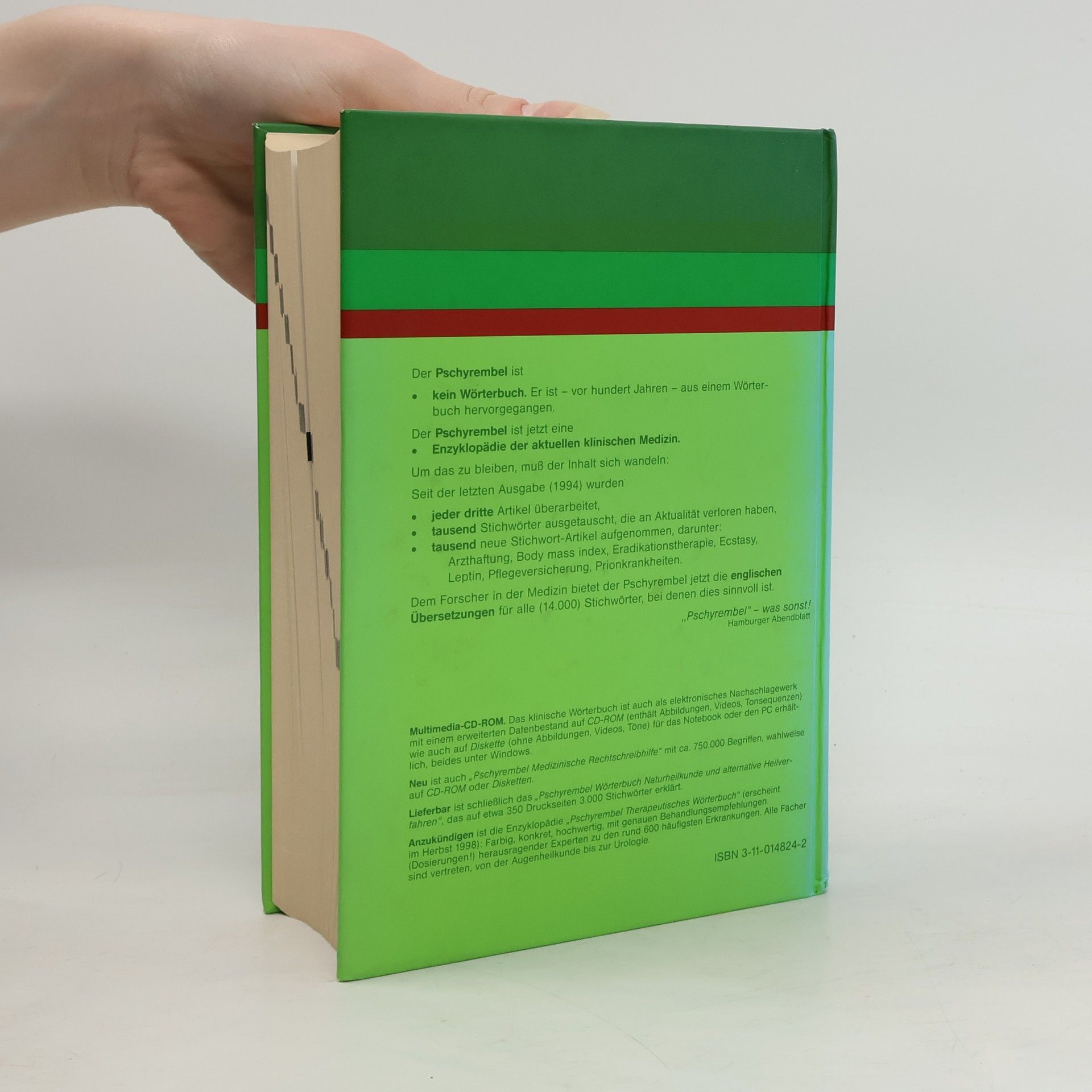 Mit seinen 260 Auflagen steht der PschyrembelŘ für lexikalische Kompetenz und für zuverlässig gesichertes Fachwissen. Und das aus gutem Grund: Mehr als hundert renommierte Autoren aus der medizinischen Wissenschaft und Praxis beliefern unser erfahrenes Redaktionsteam ständig mit neuesten, aktuellen Fachinformationen. In Zusammenarbeit mit hochkarätigen Experten sichern wir die wegweisenden inhaltlichen und formalen Standards, auf die sich Mediziner verlassen können. So ist und bleibt der PschyrembelŘ die bewährte Quelle von Wissen und Know-how, die in der täglichen Arbeit von Medizinern nicht mehr wegzudenken ist. - Der Pschyrembel beantwortet Ihre Fragen zur Medizin und erklärt medizinisch relevante Begriffe aus Biologie, Chemie und Physik. Und das stets auf dem aktuellen Stand der wissenschaftlichen Forschung: umfassend, sachkundig und zuverlässig. Prägnante Kurz-Definitionen zu Beginn jedes Eintrags. Englische Übersetzungen der Stichwörter. Leicht zu erfassende Einträge durch einheitliche Gliederung mit Zwischenüberschriften wie "Ursachen", "Symptome", "Komplikationen", "Diagnose", "Therapie", "Prognose". Hilfe bei Lesbarkeit und Aussprache medizinischer Begriffe durch markierte Trennungen der Wort-Teile und Betonungszeichen. Etymologische Erläuterungen erklären die ursprüngliche Bedeutung von Stichwörtern fremdsprachiger, insbesondere griechischer und lateinischer Herkunft mit Ursprungssprache, Ursprungswort und deutscher Bedeutung