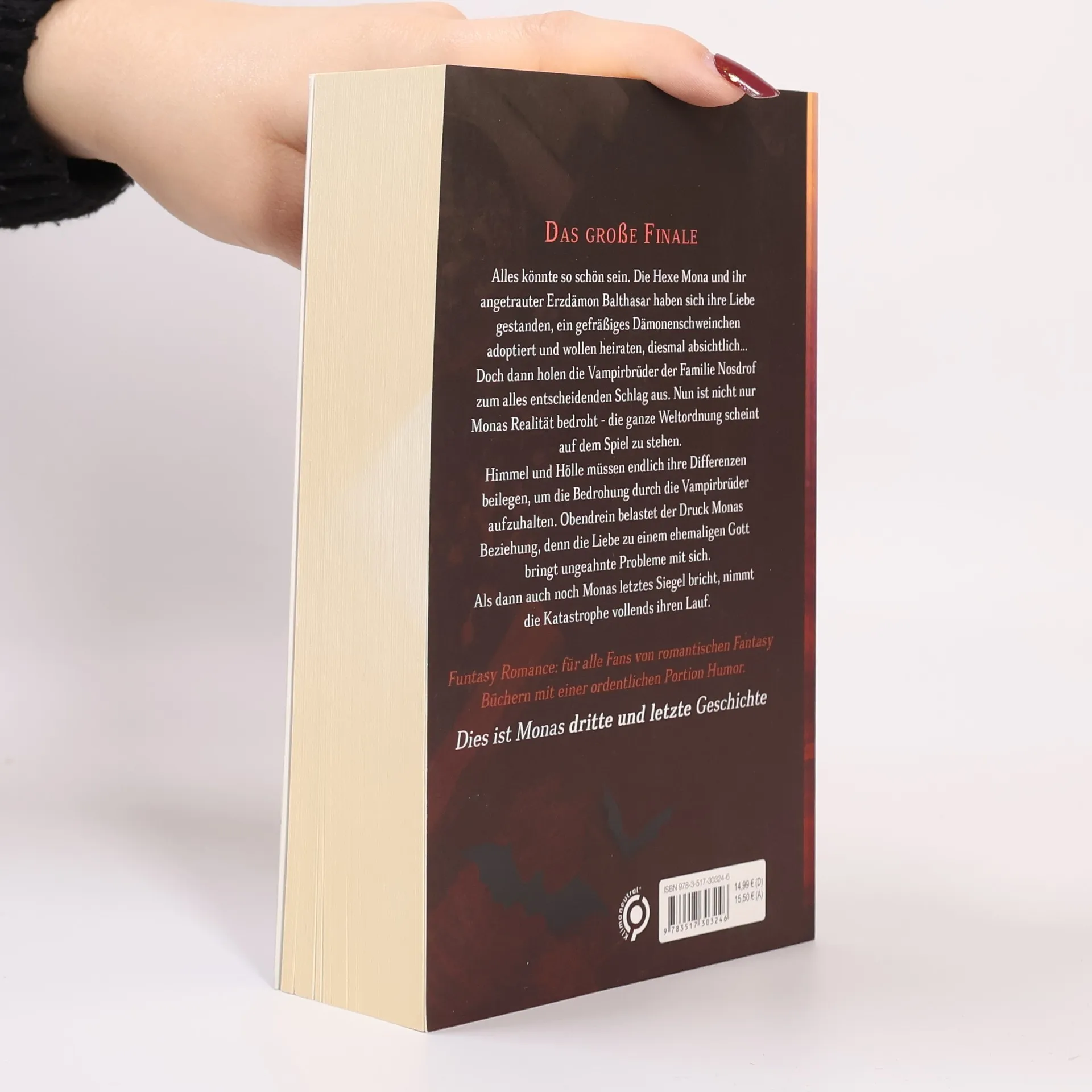 Alles könnte so schön sein. Die Hexe Mona und ihr angetrauter Erzdämon Balthasar haben sich ihre Liebe gestanden, ein gefräßiges Dämonenschweinchen adoptiert und wollen heiraten, diesmal absichtlich… Doch dann holen die Vampirbrüder der Familie Nosdrof zum alles entscheidenden Schlag aus. Nun ist nicht nur Monas Realität bedroht - die ganze Weltordnung scheint auf dem Spiel zu stehen. Himmel und Hölle müssen endlich ihre Differenzen beilegen, um die Bedrohung durch die Vampirbrüder aufzuhalten. Obendrein belastet der Druck Monas Beziehung, denn die Liebe zu einem ehemaligen Gott bringt ungeahnte Probleme mit sich. Als dann auch noch Monas letztes Siegel bricht, nimmt die Katastrophe vollends ihren Lauf.Das große Finale der Mona-Trilogie. Mit Hexe, Erzdämon, Teufeln, Vampiren, Werwölfen, Engeln, einer Skelettin und vielen bekannten sowie neuen Gestalten aus der Mythologie.