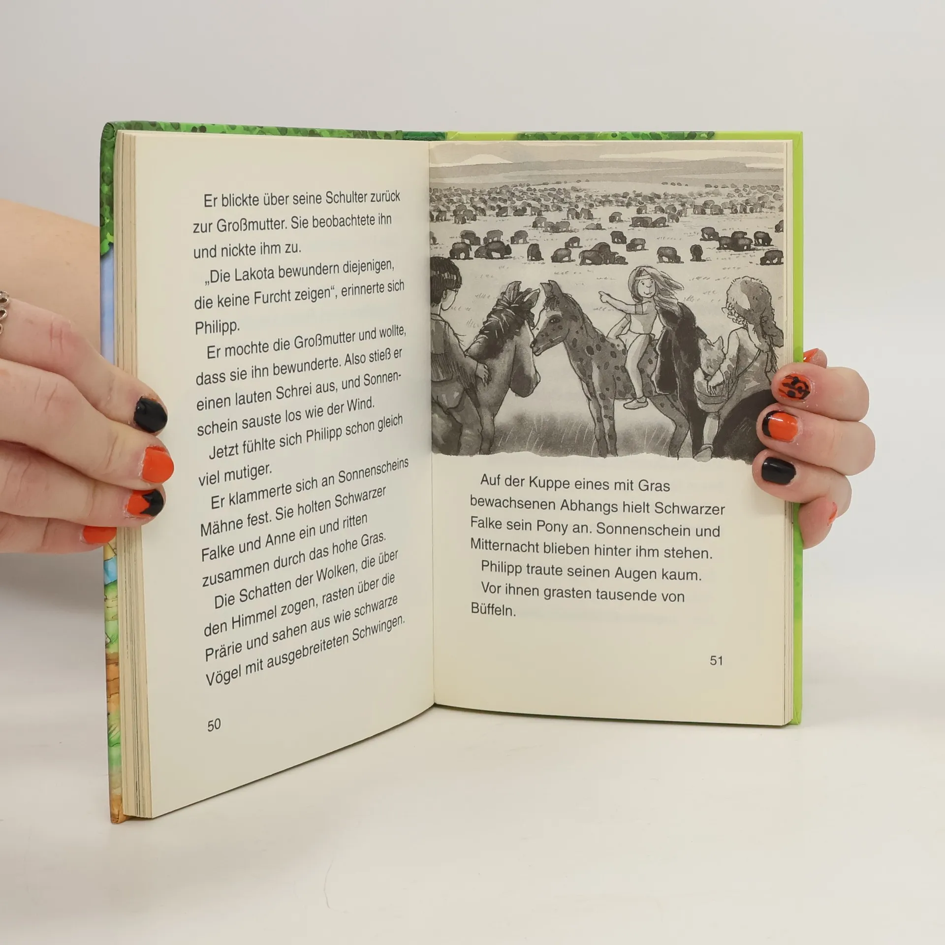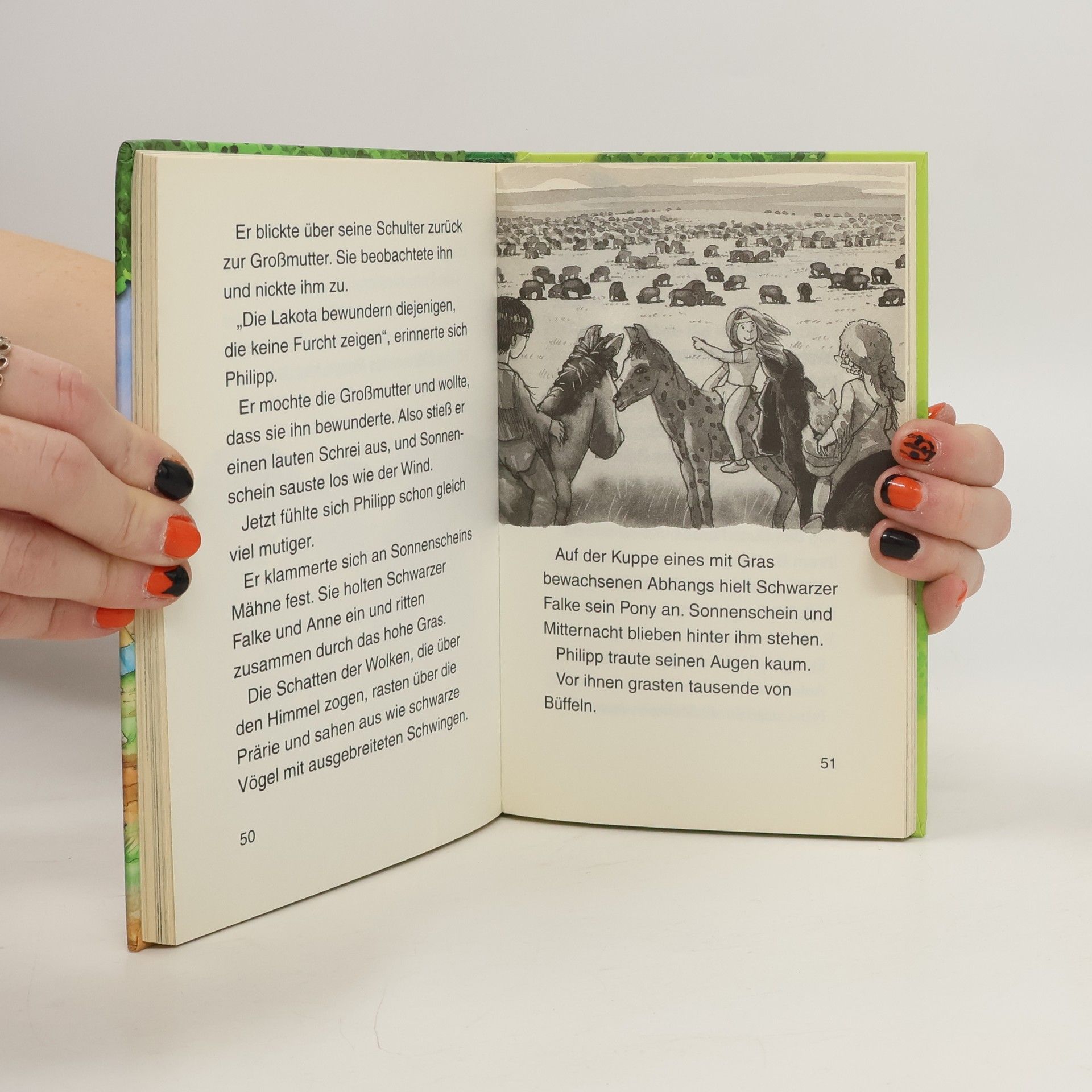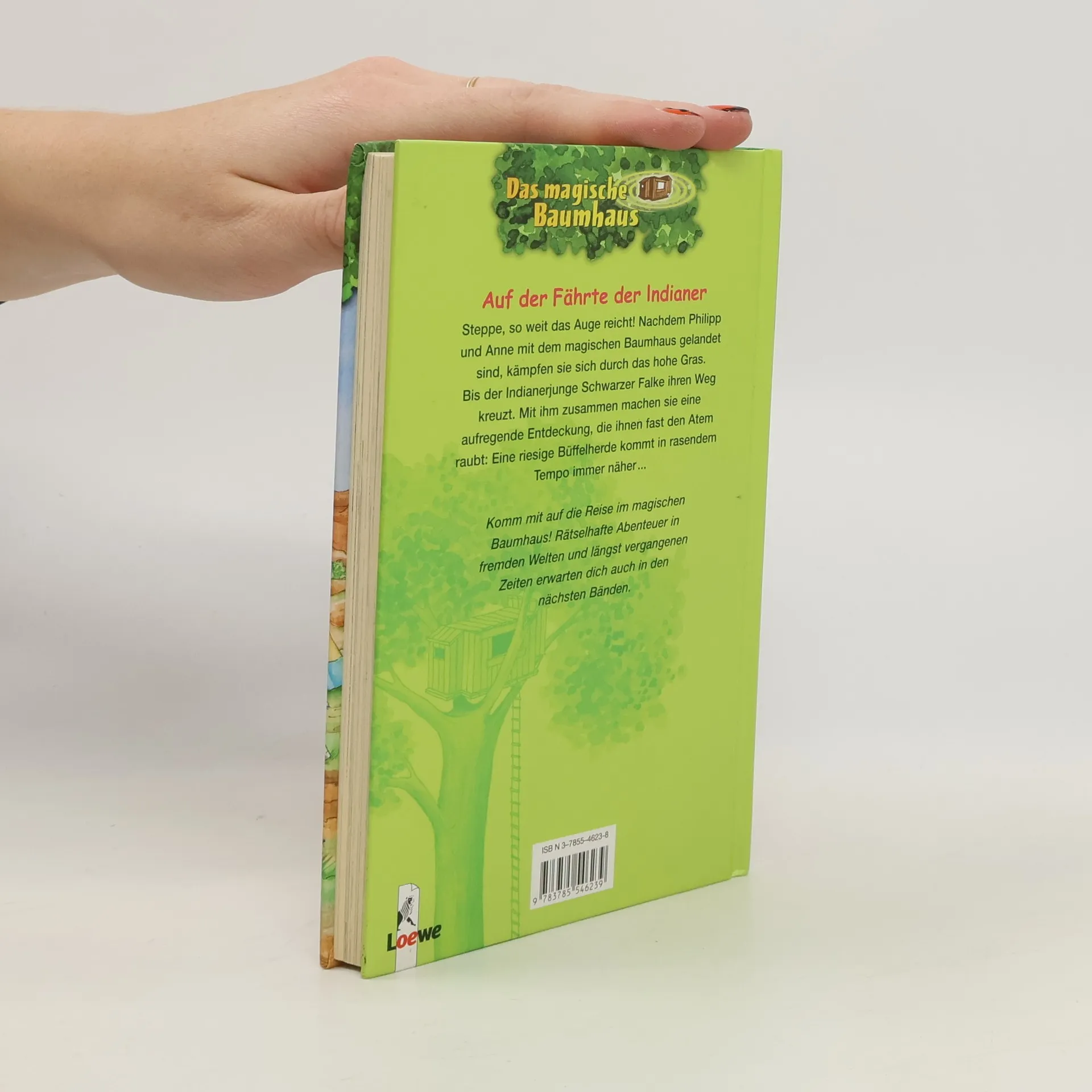 Steppe, so weit das Auge reicht! Nachdem Philipp und Anne mit dem magischen Baumhaus gelandet sind, kämpfen sie sich durch das hohe Gras. Bis der Indianerjunge Schwarzer Falke ihren Weg kreuzt. Mit ihm zusammen machen sie eine aufregende Entdeckung, die ihnen fast den Atem raubt: eine riesige Büffelherde kommt in rasendem Tempo immer näher auf sie zu ... Komm mit auf die Reise im magischen Baumhaus! Rätselhafte Abenteuer in fremden Welten und längst vergangenen Zeiten erwarten dich auch in den nächsten Bänden. Die beliebte Kinderbuch-Reihe von Bestsellerautorin Mary Pope Osborne! Die Geschwister Anne und Philipp reisen mit dem magischen Baumhaus durch die Zeit. Sie erleben spannende Abenteuer, entdecken ferne Länder und lernen viele berühmte Persönlichkeiten kennen.