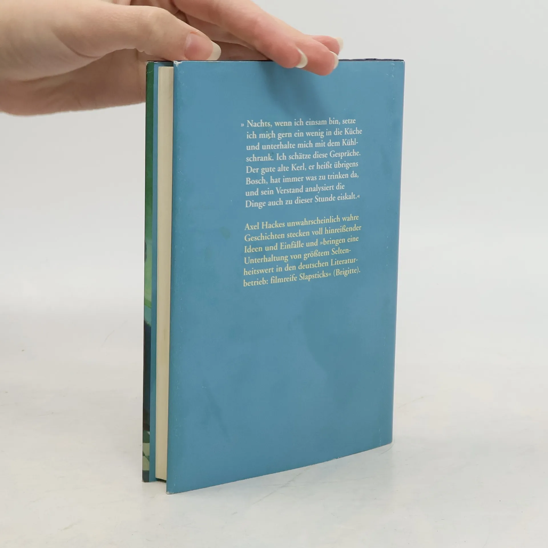 »Eines Tages, als ich allein in der Kneipe stand, zupfte mich ein riesiges graugrünes Monster am Ärmel und sagte: Hey, willste nich mal ein Buch schreiben? Ich hab nix mehr zu lesen!« Zum Glück hat Axel Hacke auf das Monster gehört. Und deshalb wissen wir jetzt, wie man sich den Abend vertreiben kann: »Nachts, wenn ich einsam bin, setze ich mich gern ein wenig in die Küche und unterhalte mich mit dem Kühlschrank. Ich schätze diese Gespräche. Der gute alte Kerl, er heißt übrigens Bosch, hat immer was zu trinken da, und sein Verstand analysiert die Dinge auch zu dieser Stunde eiskalt.« Aber man erfährt auch die wahre Geschichte über das traurige Leben des Schriftstellers Gehret und seine fantastische Sprachbesessenheit. Das Wahre ist, bei Tageslicht betrachtet, genauso unwahrscheinlich wie das Unwahrscheinliche wahr. Ob erlebt oder erfunden, wer möchte das bei diesen liebevoll-ironischen, dabei sehr genauen Beobachtungen eines skurrilen Alltags noch entscheiden. »Hinreißende Ideen und Einfälle bringen eine Unterhaltung von größtem Seltenheitswert in den deutschen Literaturbetrieb: filmreife Slapsticks.« Brigitte.