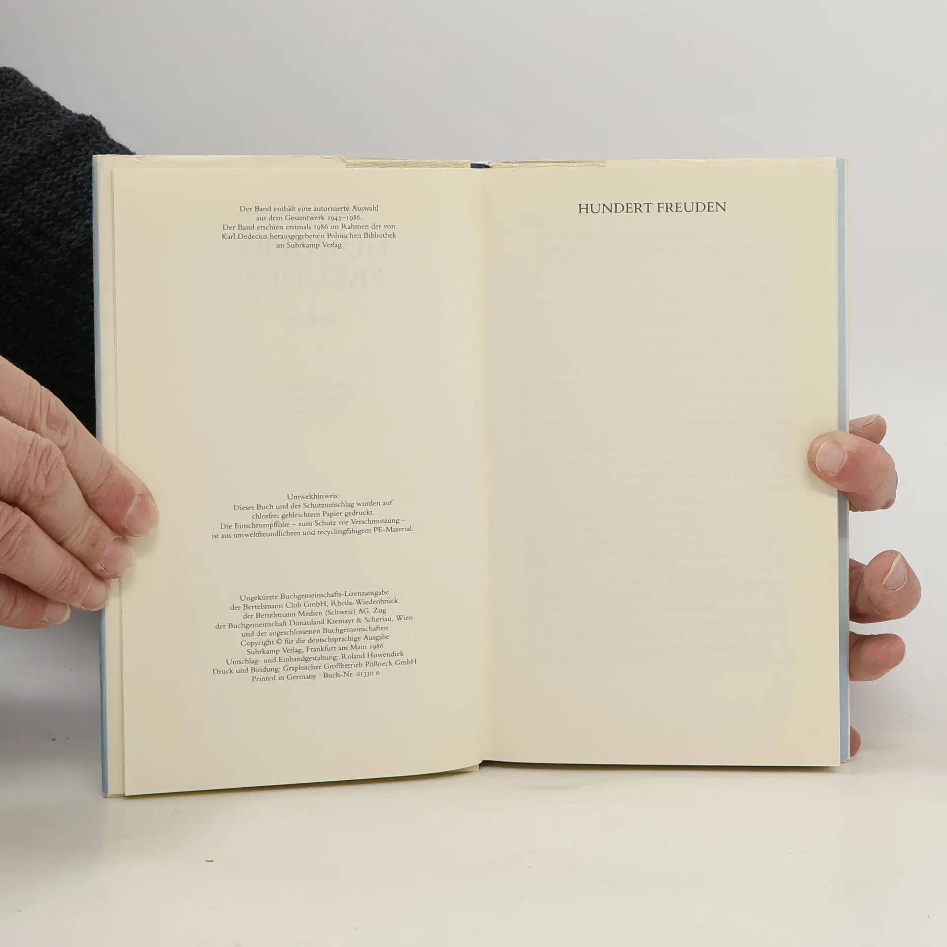 »Hundert Freuden« enthält eine Auswahl aus Wislawa Szymborskas Gesamtwerk von 1945 bis 1986. Ebenfalls im Suhrkamp Verslag sind erschienen: »Salz.« Gedichte (1973), »Deshalb leben wir.« Gedichte (1980) und »Auf Wiedersehen. Bis morgen.« Gedichte (1995)
