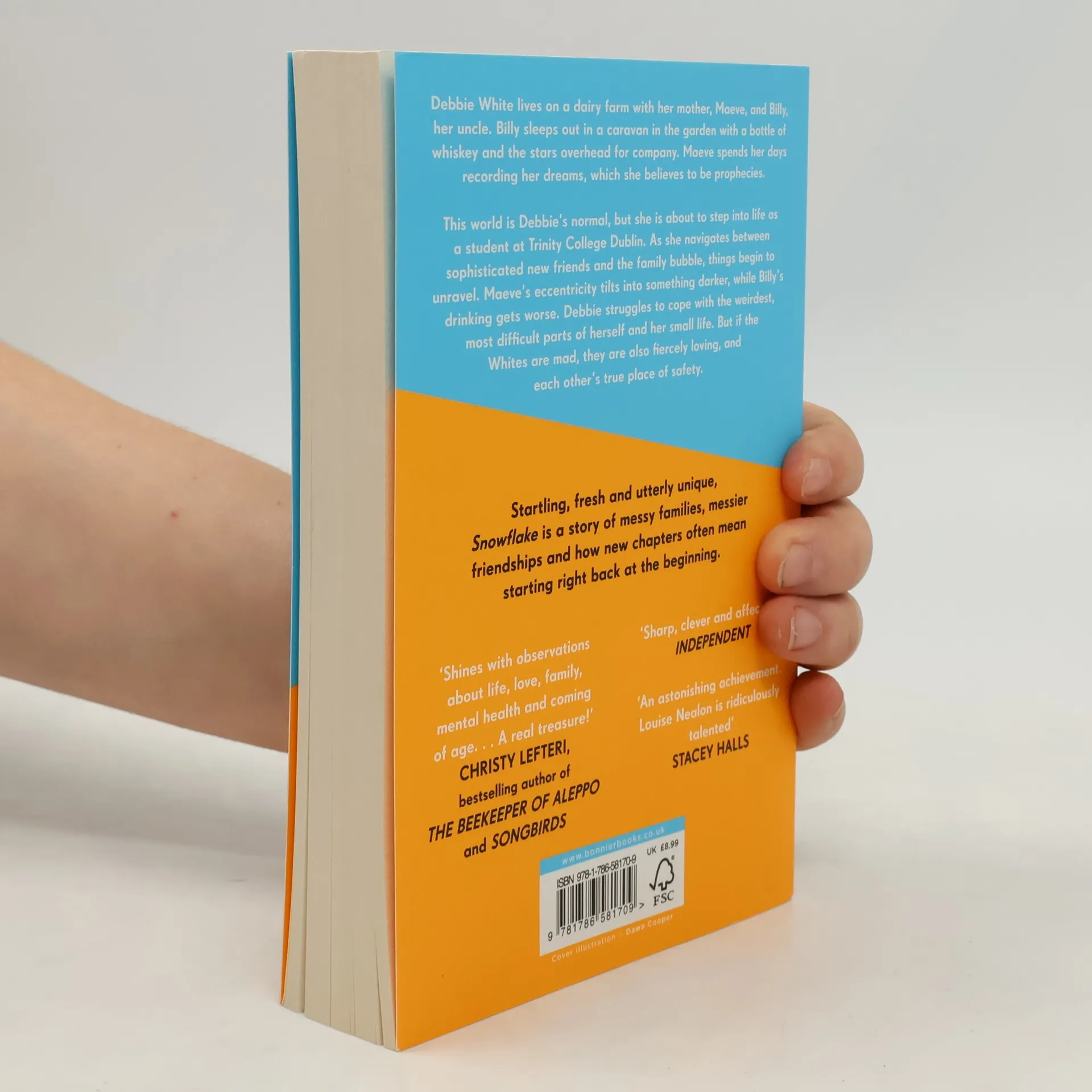 Debbie's brain isn't perfect. Debbie's thoughts aren't unique. Debbie's dreams are all too real. Debbie White lives on a dairy farm with her mother, Maeve, and her uncle, Billy. Billy sleeps out in a caravan in the garden with a bottle of whiskey and the stars overhead for company. Maeve spends her days recording her dreams, which she believes to be prophecies. This world is Debbie's normal, but she is about to step into life as a student at Trinity College Dublin. As she navigates between sophisticated new friends and the family bubble, things begin to unravel. Maeve's eccentricity tilts into something darker, while Billy's drinking gets worse. Debbie struggles to cope with the weirdest, most difficult parts of herself and her small life. But if the Whites are mad, they are also fiercely loving, and each other's true place of safety. Startling, fresh and utterly unique, Snowflake is a story of messy families, messier friendships and how new chapters often mean starting right back at the beginning.