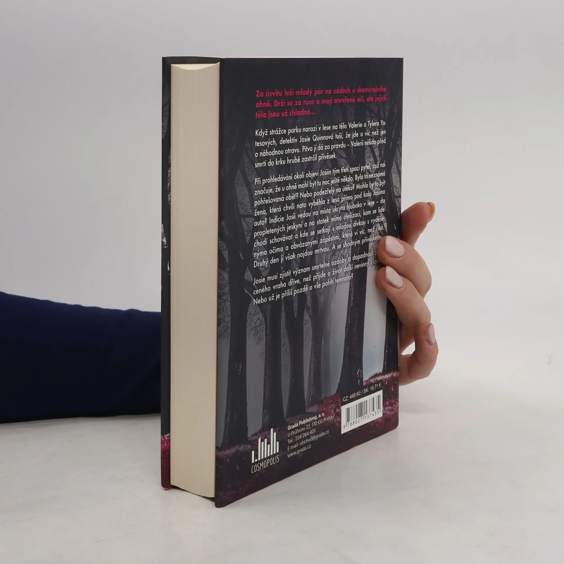 Za úsvitu leží mladý pár na zádech u skomírajícího ohně. Drží se za ruce a mají otevřené oči, ale jejich těla jsou už chladná...Když strážce parku narazí v lese na těla Valerie a Tylera Yatesových, detektiv Josie Quinnová tuší, že jde o víc než jen o náhodnou otravu. Pitva jí dá za pravdu – Valerii někdo před smrtí do krku hrubě zastrčil přívěsek.Při prohledávání okolí objeví Josiin tým třetí spací pytel, což naznačuje, že u ohně mohl být tu noc ještě někdo. Byla to neznámá pohřešovaná oběť? Nebo podezřelý na útěku? Mohla by to být žena, která chvíli nato vyběhla z lesa přímo pod kola Josiina auta? Indicie Josii vedou na místa ukrytá hluboko v lese – do propletených jeskyní a na statek mimo civilizaci, kam se lidé chodí schovávat a kde se setkají s mladou dívkou s vyděšenýma očima a obvázanými zápěstími, která ví víc, než říká. Druhý den ji však najdou mrtvou. A se shodným přívěskemJosie musí zjistit význam smrtelné ozdoby a dopadnout zvráceného vraha dříve, než přijde o život další nevinný člověk. Nebo už je příliš pozdě a vše pohltí temnota?