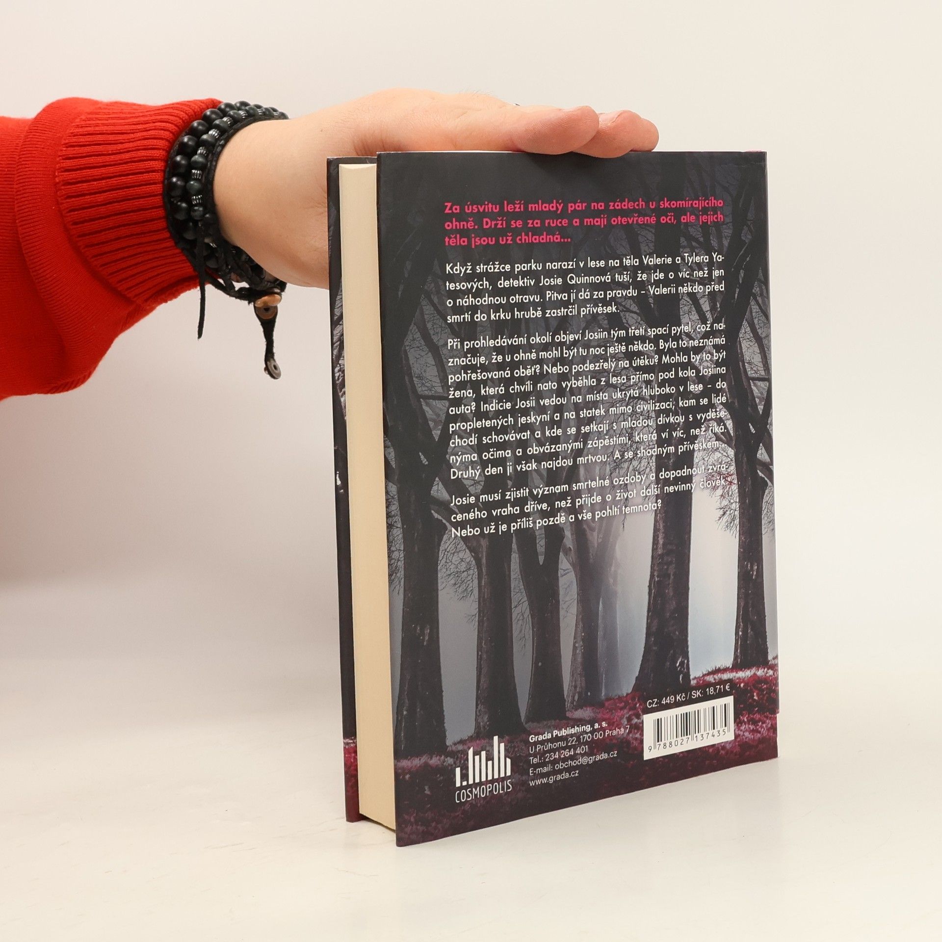 Za úsvitu leží mladý pár na zádech u skomírajícího ohně. Drží se za ruce a mají otevřené oči, ale jejich těla jsou už chladná...Když strážce parku narazí v lese na těla Valerie a Tylera Yatesových, detektiv Josie Quinnová tuší, že jde o víc než jen o náhodnou otravu. Pitva jí dá za pravdu – Valerii někdo před smrtí do krku hrubě zastrčil přívěsek.Při prohledávání okolí objeví Josiin tým třetí spací pytel, což naznačuje, že u ohně mohl být tu noc ještě někdo. Byla to neznámá pohřešovaná oběť? Nebo podezřelý na útěku? Mohla by to být žena, která chvíli nato vyběhla z lesa přímo pod kola Josiina auta? Indicie Josii vedou na místa ukrytá hluboko v lese – do propletených jeskyní a na statek mimo civilizaci, kam se lidé chodí schovávat a kde se setkají s mladou dívkou s vyděšenýma očima a obvázanými zápěstími, která ví víc, než říká. Druhý den ji však najdou mrtvou. A se shodným přívěskemJosie musí zjistit význam smrtelné ozdoby a dopadnout zvráceného vraha dříve, než přijde o život další nevinný člověk. Nebo už je příliš pozdě a vše pohltí temnota?
