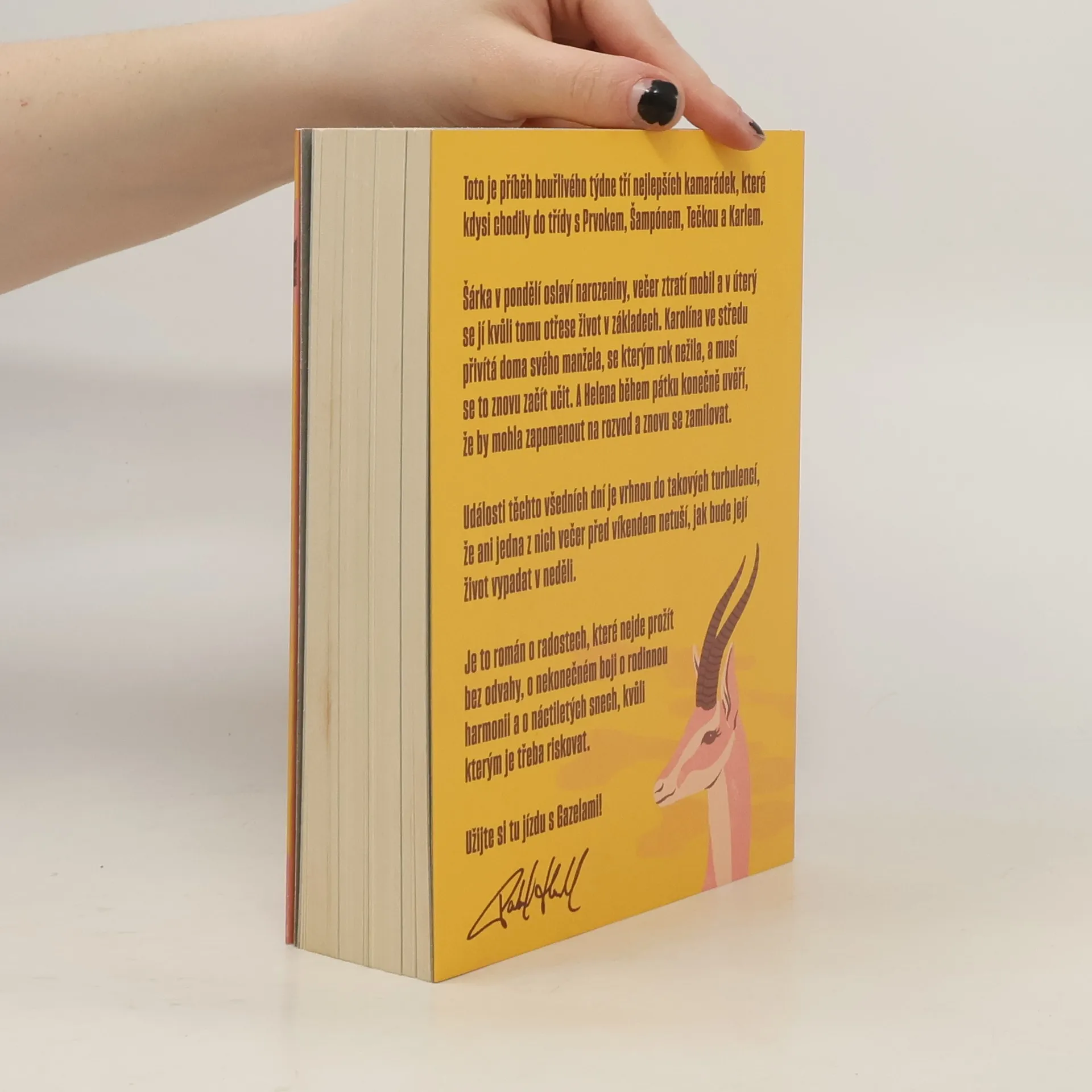 Gazely vypráví příběh jednoho bouřlivého týdne tří blízkých kamarádek, které kdysi chodily do školy s Prvokem, Šampónem, Tečkou a Karlem. Šárka začíná týden narozeninovou oslavou, ale ztráta mobilu jí už v úterý převrátí život naruby. Karolína se ve středu setkává se svým manželem, se kterým po roce odloučení zkouší obnovit vztah. Helena v pátek zjišťuje, že by mohla nechat rozvod za sebou a znovu najít lásku. Během těchto několika dní se jejich životy ocitnou ve víru změn, takže ani jedna z nich nemá tušení, jaké překvapení je čeká do neděle. Tento román je o radosti, která vyžaduje odvahu, o neustálém úsilí najít rovnováhu v rodině a o snech z mládí, kvůli kterým stojí za to riskovat.
