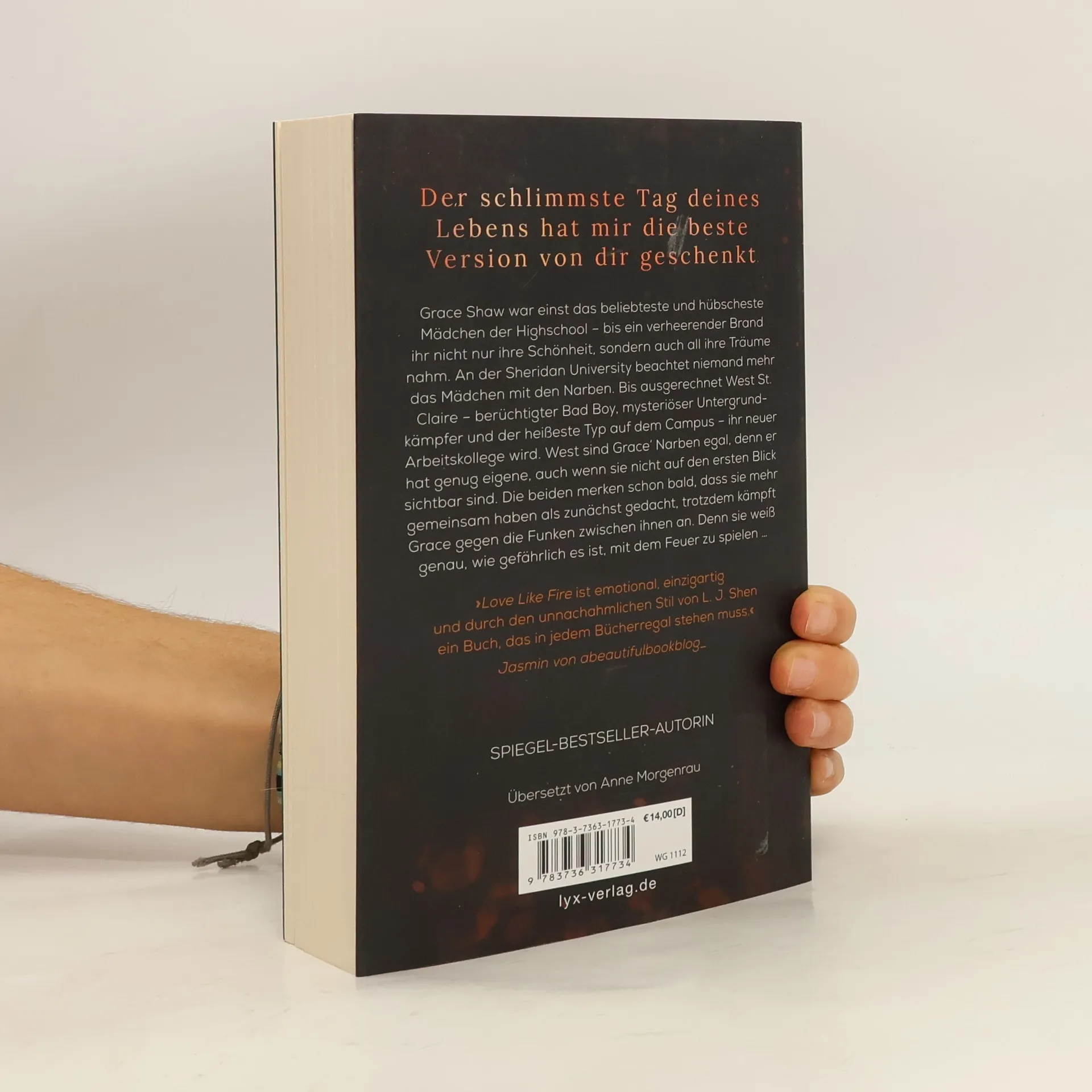 Der schlimmste Tag deines Lebens hat mir die beste Version von dir geschenkt Grace Shaw war einst das beliebteste und hübscheste Mädchen der Highschool - bis ein verheerender Brand ihr nicht nur ihre Schönheit, sondern auch all ihre Träume nahm. An der Sheridan University beachtet niemand mehr das Mädchen mit den Narben. Bis ausgerechnet West St. Claire - berüchtigter Bad Boy, mysteriöser Untergrund-kämpfer und der heißeste Typ auf dem Campus - ihr neuer Arbeitskollege wird. West sind Grace’ Narben egal, denn er hat genug eigene, auch wenn sie nicht auf den ersten Blick sichtbar sind. Die beiden merken schon bald, dass sie mehr gemeinsam haben als zunächst gedacht, trotzdem kämpft Grace gegen die Funken zwischen ihnen an. Denn sie weiß genau, wie gefährlich es ist, mit dem Feuer zu spielen ... „LOVE LIKE FIRE ist emotional, einzigartig und durch den unnachahmlichen Stil von L. J. Shen ein Buch, das in jedem Bücherregal stehen muss.“ JASMIN von ABEAUTIFULBOOKBLOG_ Das neue Buch von SPIEGEL-Bestseller-Autorin L. J. Shen