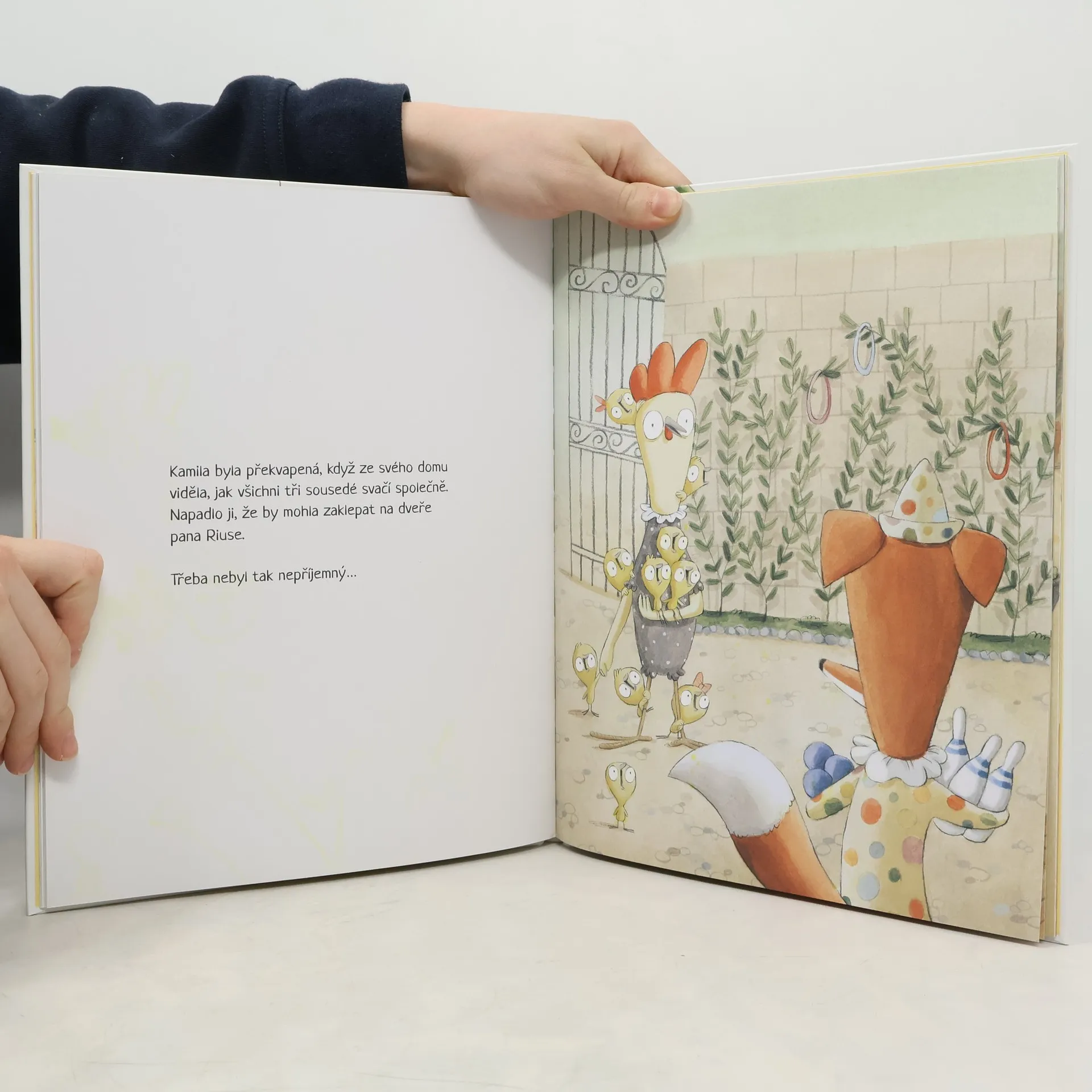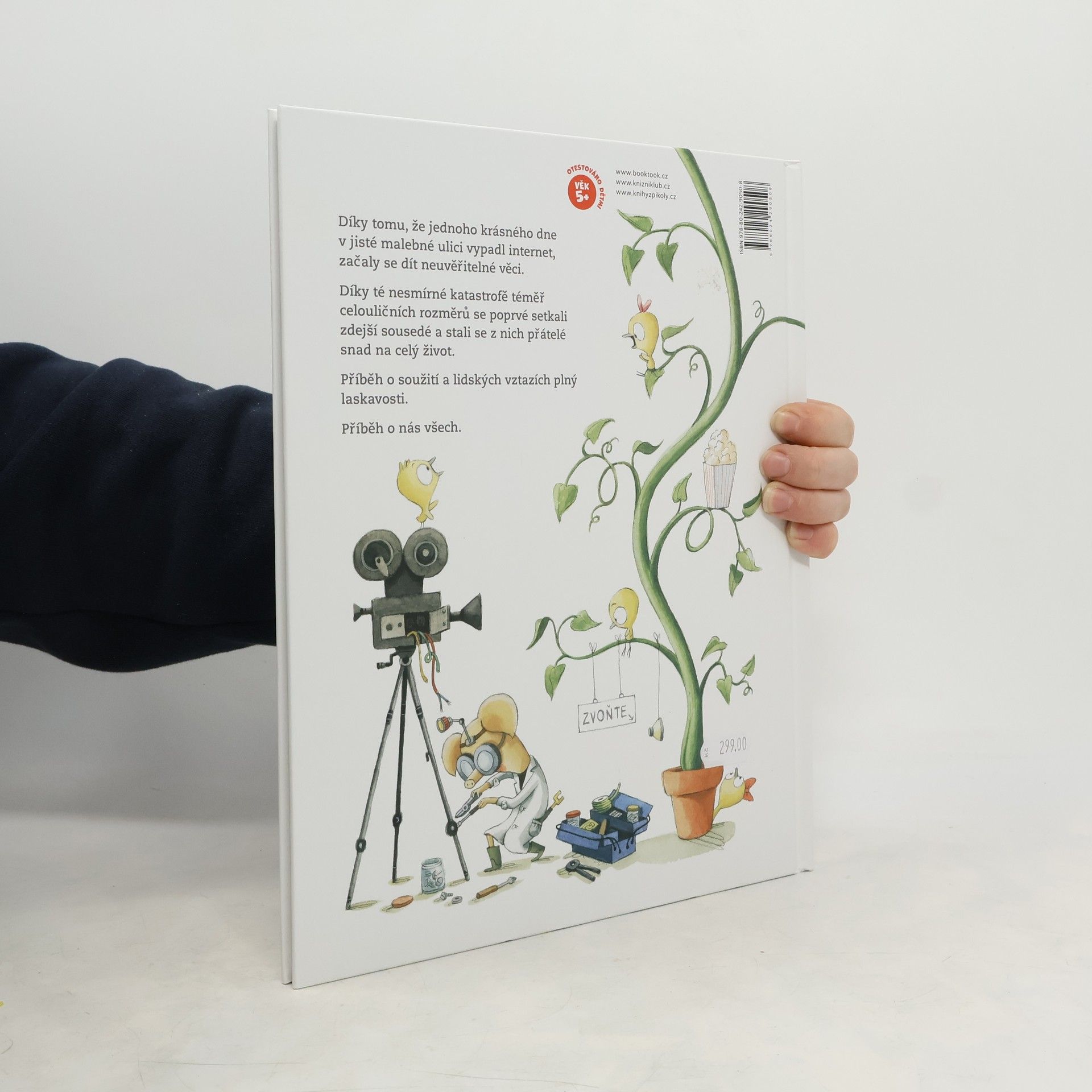 Bylo nebylo jedno sousedství a zdálo se jako každé jiné. Byly tu domy, trávníky, lampy i stromy. A také tu vedle sebe žili myška, kocour, sova, liška, zlobr a slepice. Sousedé, kteří si sotva kývli na pozdrav. Jednoho dne však vypadne internet. Dokáže taková malá událost něco změnit? Překonají sousedé strach, nesmělost a stud a najdou k sobě cestu?