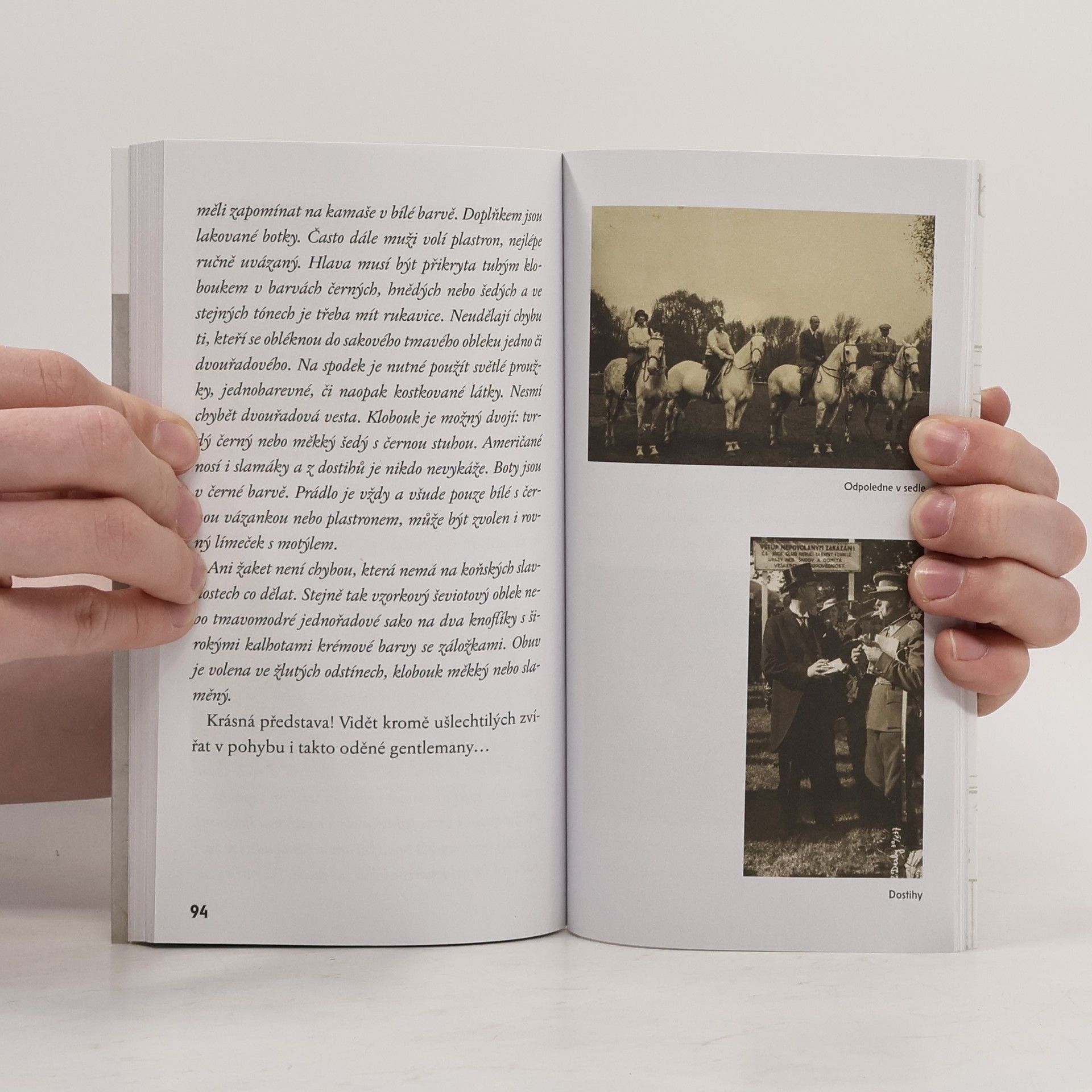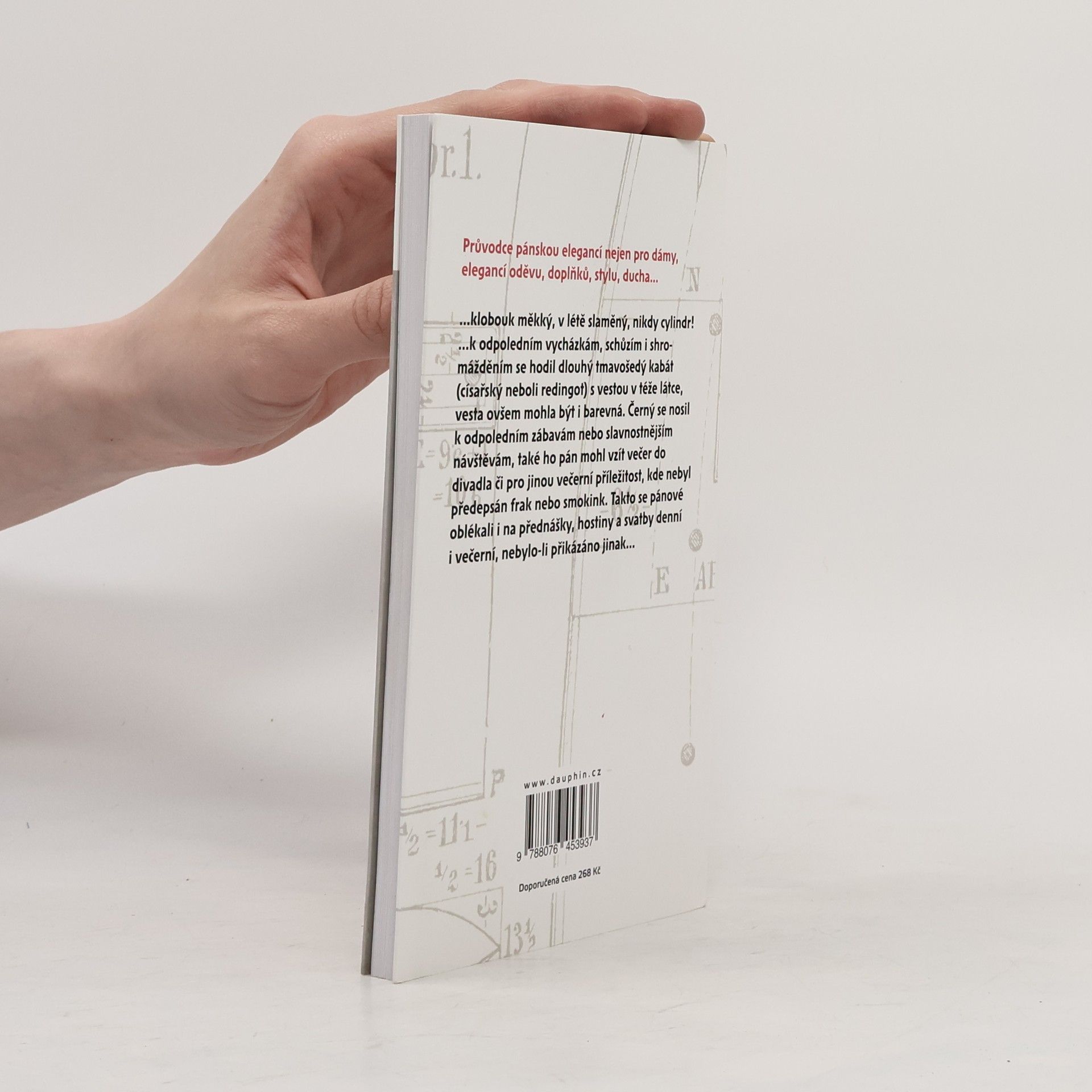 Průvodce pánskou elegancí nejen pro dámy, elegancí oděvu, doplňků, stylu, ducha......klobouk měkký, v létě slaměný, nikdy cylindr!...k odpoledním vycházkám, schůzím i shromážděním se hodil dlouhý tmavošedý kabát (císařský neboli redingot) s vestou v téže látce, vesta ovšem mohla být i barevná. Černý se nosil k odpoledním zábavám nebo slavnostnějším návštěvám, také ho pán mohl vzít večer do divadla či pro jinou večerní příležitost, kde nebyl předepsán frak nebo smokink. Takto se pánové oblékali i na přednášky, hostiny a svatby denní i večerní, nebylo-li přikázáno jinak.
