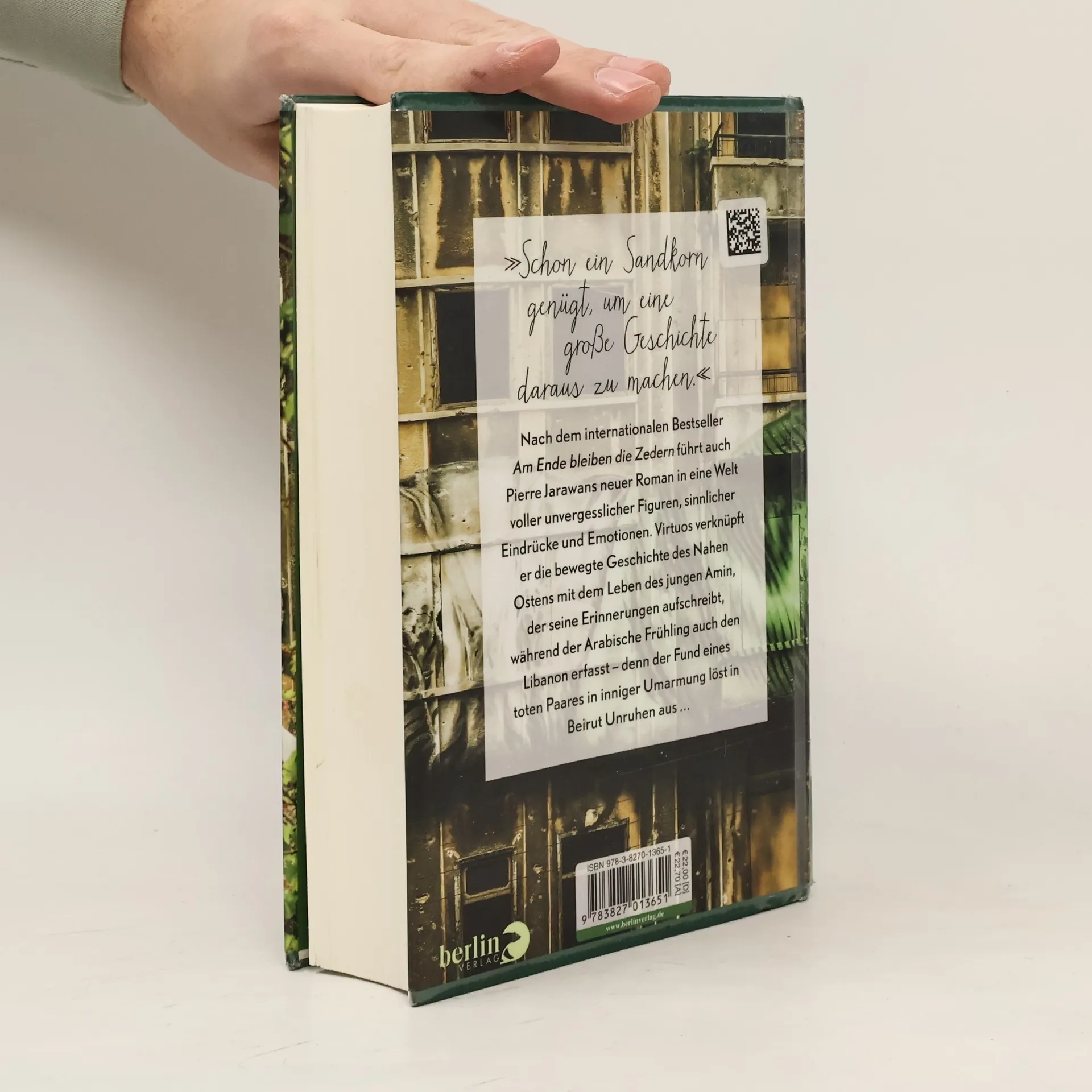 »Schon ein Sandkorn genügt, um eine große Geschichte daraus zu machen.« Im Jahr 2011, während der Arabische Frühling tobt, führt der Fund zweier Leichen in Beirut zu Unruhen. Amin beginnt, seine Erinnerungen an 1994 niederzuschreiben, als er mit seiner Großmutter in den Libanon zurückkehrte – zwölf Jahre nach dem Tod seiner Eltern. Er erinnert sich an seine Freundschaft mit dem gleichaltrigen Jafar und an die Herausforderungen, die er in dieser komplexen Nachkriegswelt meistern musste. Amin lernt schmerzhaft, dass Gewissheit in diesem Land unerreichbar bleibt – sowohl über die Vergangenheit seines Freundes als auch über die Geschichte seiner eigenen Familie. Pierre Jarawans neuer Roman, nach dem internationalen Bestseller Am Ende bleiben die Zedern, entführt die Leser in eine Welt voller unvergesslicher Figuren und intensiver Emotionen. Seine Erzählweise ist temporeich und klar, mit einer Souveränität, die den Leser mitreißt. Jarawan wird als Hakawati, Geschichtenerzähler, beschrieben, dessen melancholische Bildsprache fremde Welten lebendig werden lässt. Mit beeindruckender Leichtigkeit verbindet er persönliche Erlebnisse seiner Charaktere mit bedeutenden historischen Ereignissen und verwebt Märchenhaftes mit politisch brisanten Themen. Die Geschichte ist spannend und atmosphärisch berauschend, erzählt in einer klaren, präzisen Sprache, die tief berührt.