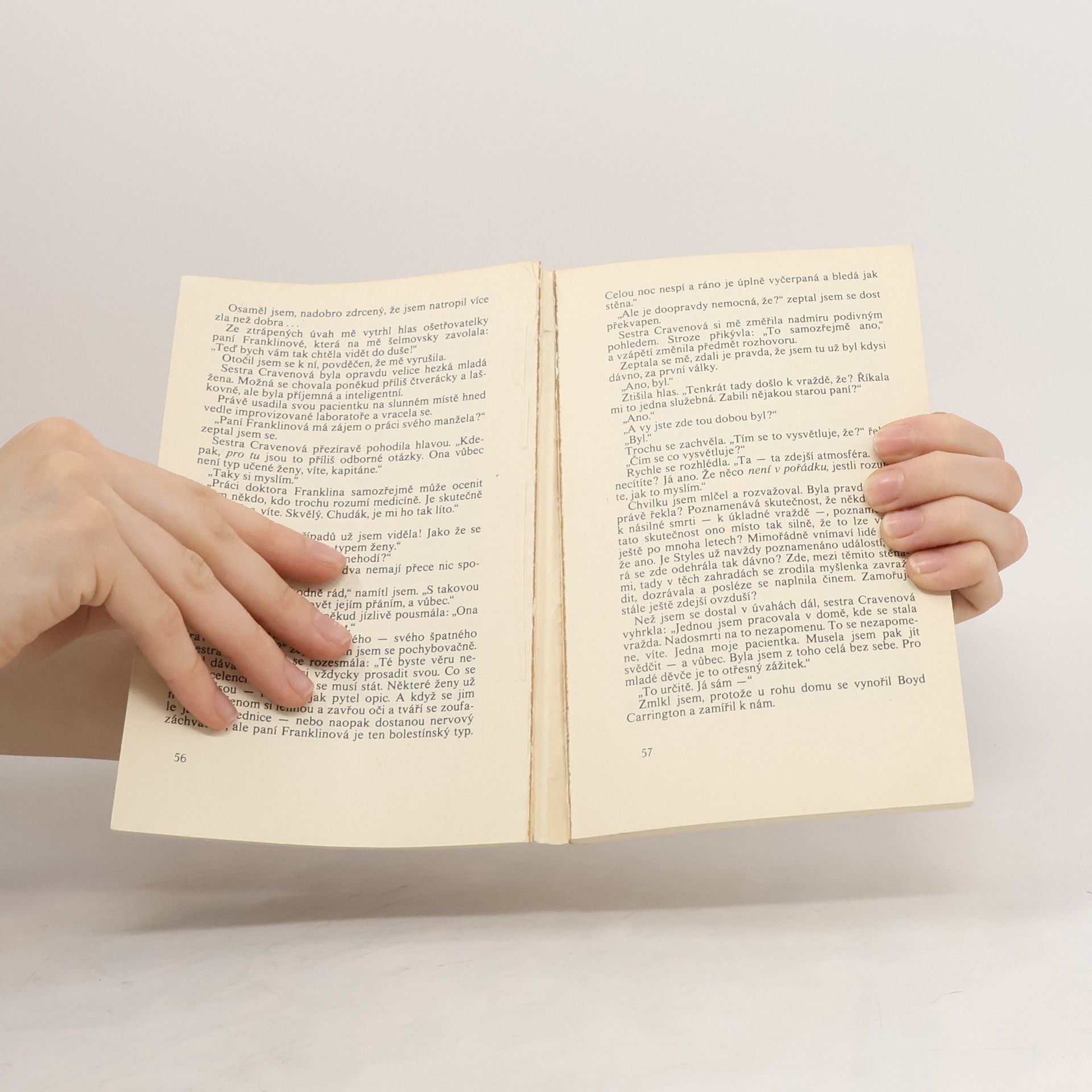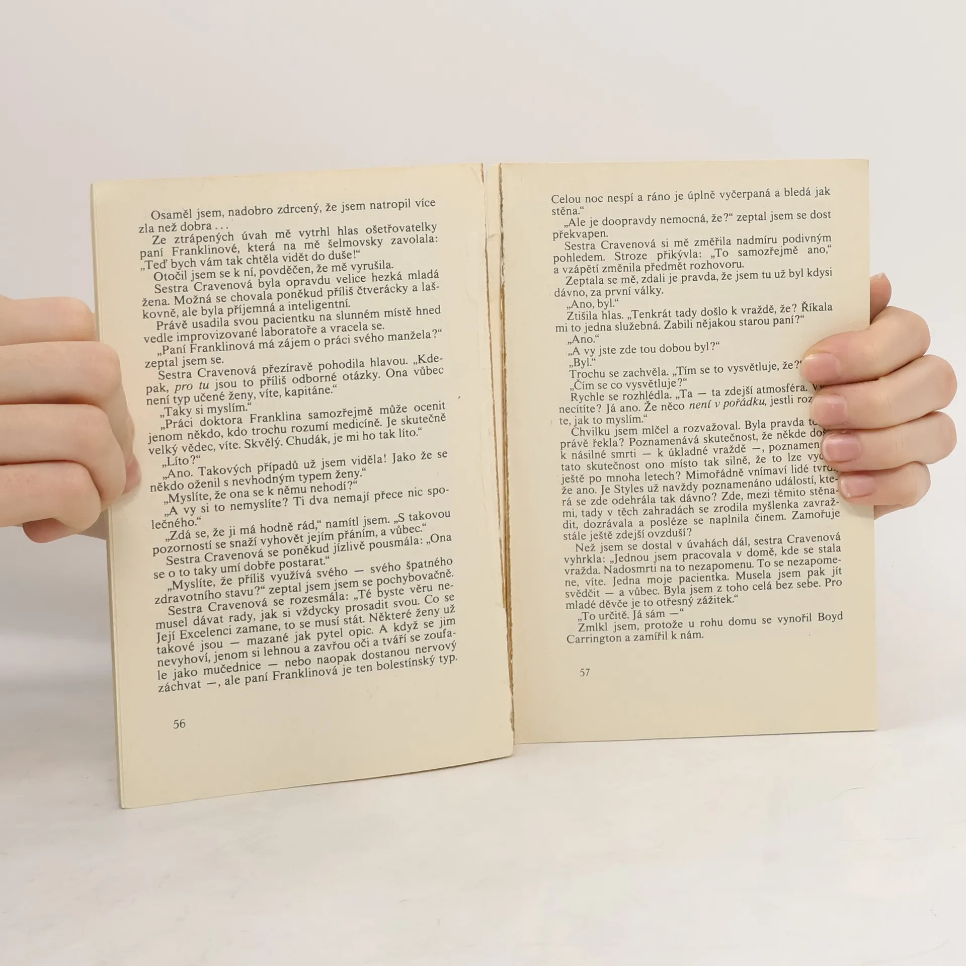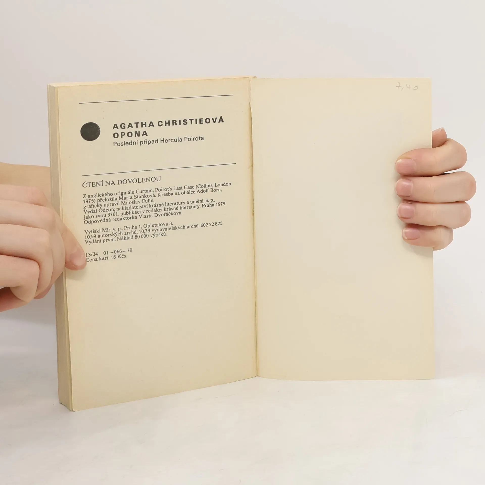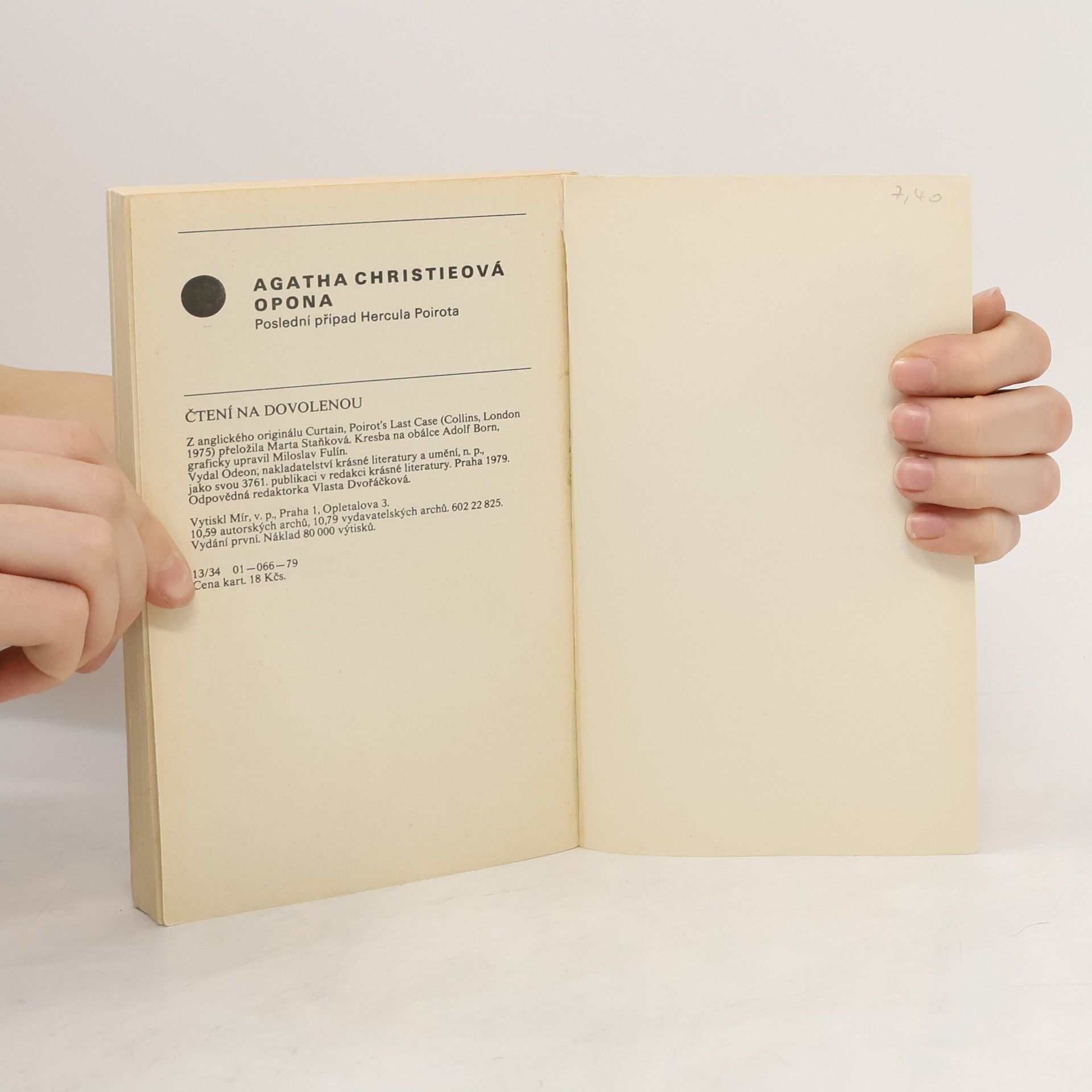 Poslední případ Hercule Poirota. Detektivní román, kterým se anglická autorka navždy rozloučila s oblíbeným literárním hrdinou. V uzavřené skupině lidí dochází k vraždě, která se stane jedním z nejtěžších a nejošidnějších Poirotových případů. Vytuší souvislost se zločinem v minulosti, objeví pachatele a když si uvědomí, že nemá dostatek důkazů pro jeho usvědčení, bere spravedlnost do svých rukou. Shodou okolností se odehrává Poirotův poslední případ na místě, kde začala jeho detektivní dráha. Edice Čtení na dovolenou. 1. vydání.