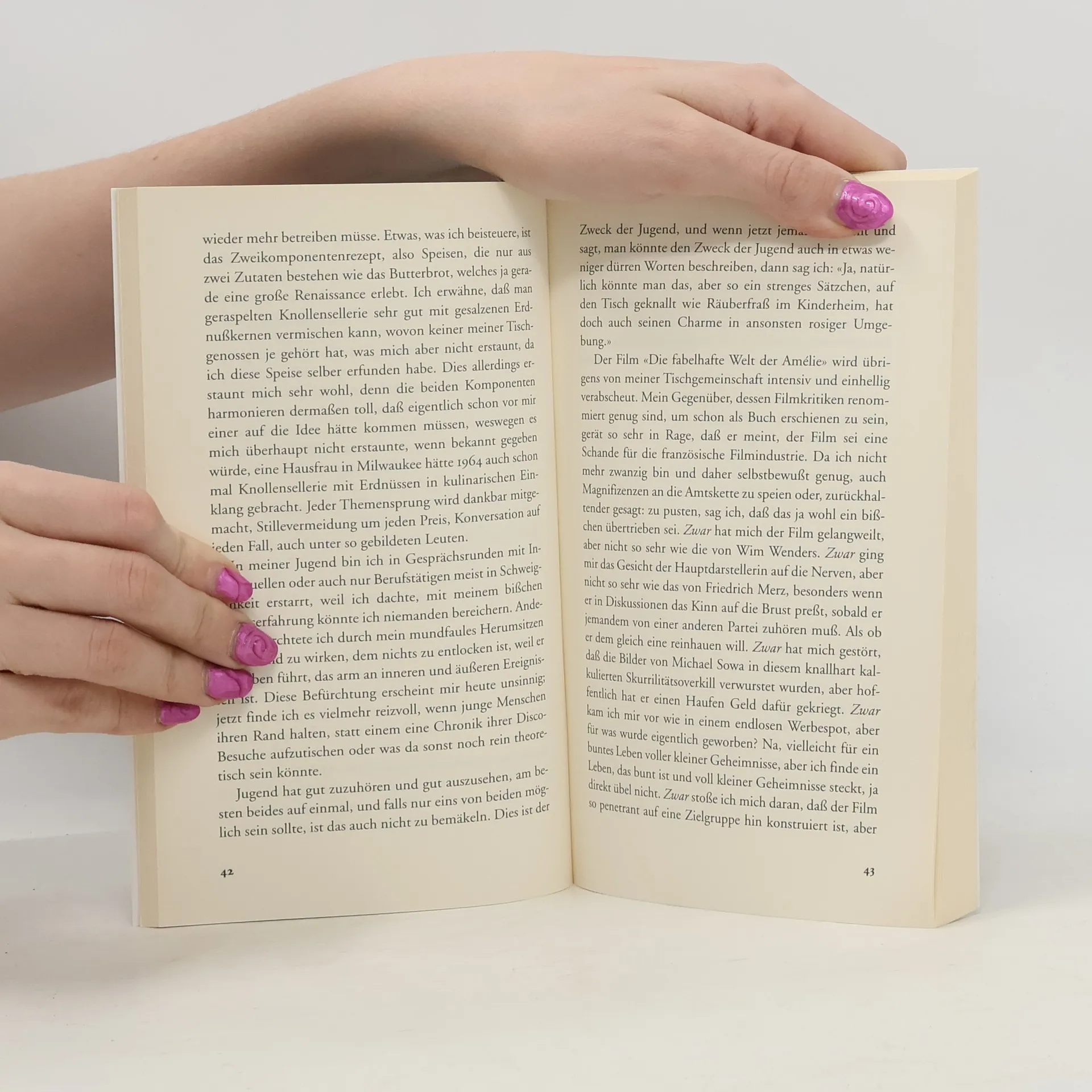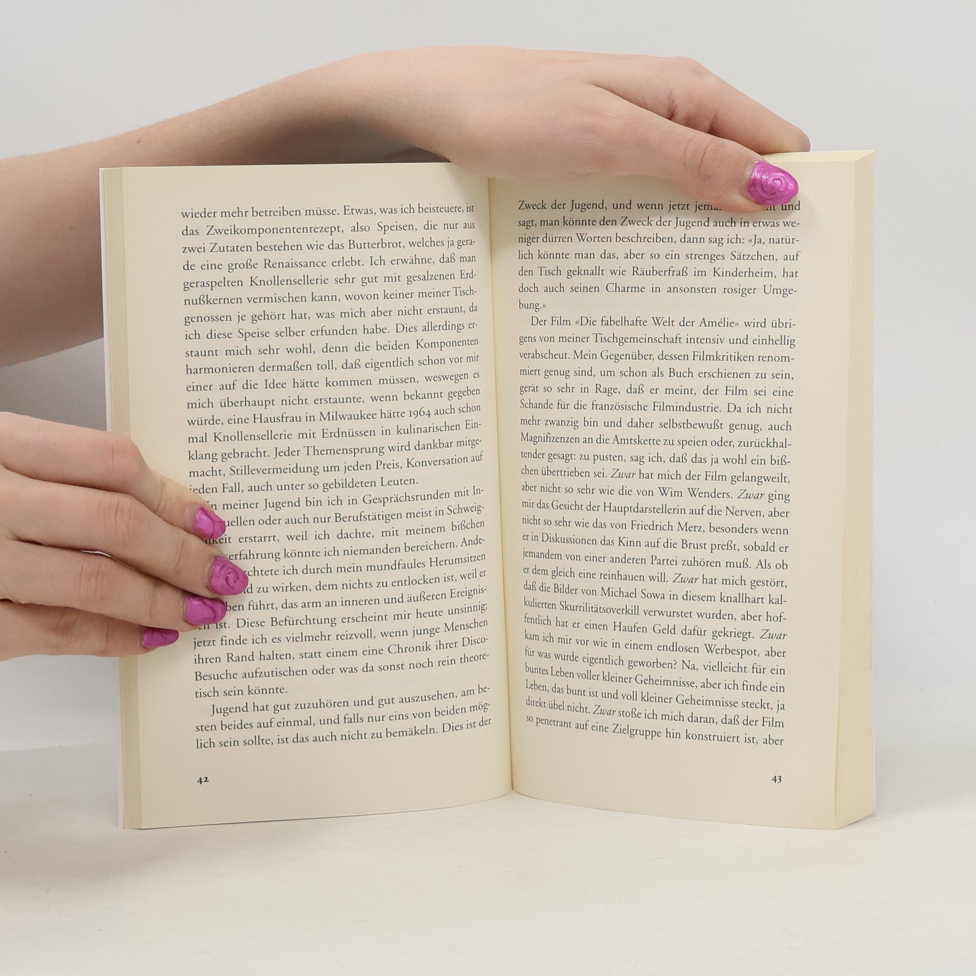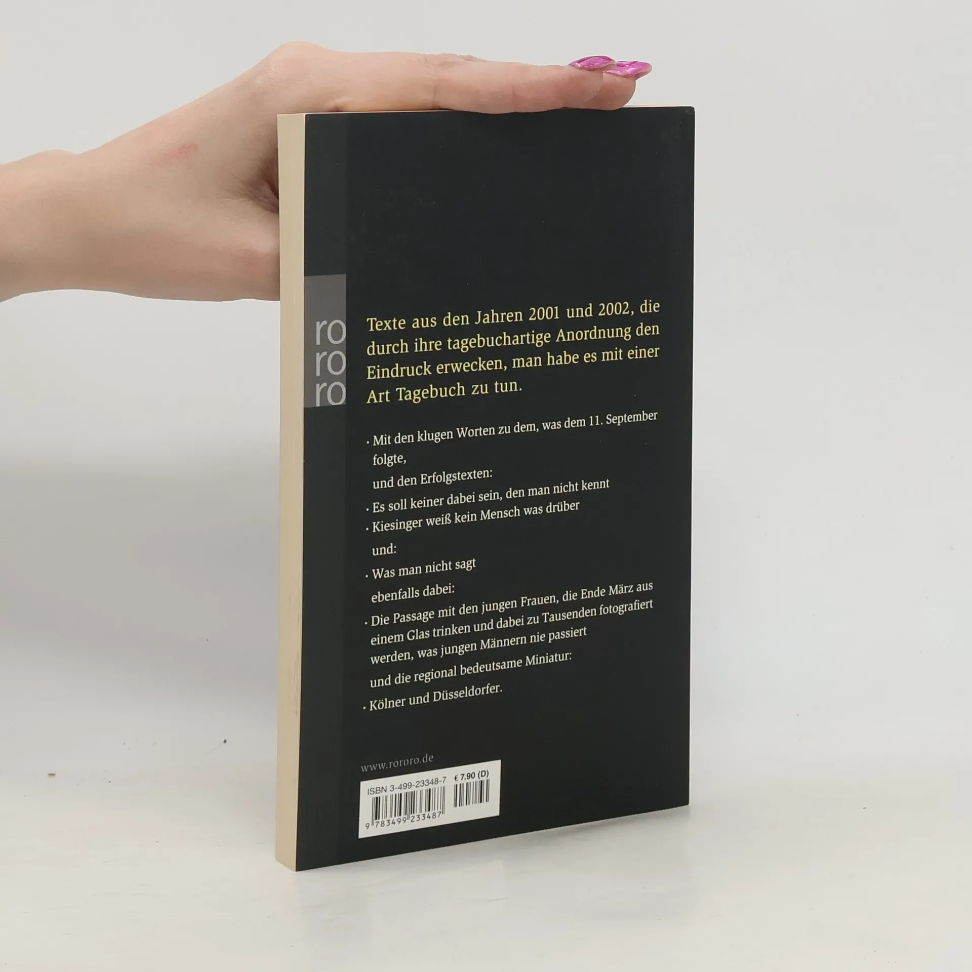 Texte aus den Jahren 2001 und 2002, die durch ihre tagebuchartige Anordnung den Eindruck erwecken, man habe es mit einer Art Tagebuch zu tun. Mit den klugen Worten zu dem, was dem 11. September folgte, und den Erfolgstexten: Es soll keiner dabei sein, den man nicht kennt Kiesinger weiß kein Mensch was drüber und: Was man nicht sagt ebenfalls dabei: Die Passage mit den jungen Frauen, die Ende März aus einem Glas trinken und dabei zu Tausenden fotografiert werden, was jungen Männern nie passiert und die regional bedeutsame Miniatur: Kölner und Düsseldorfer.