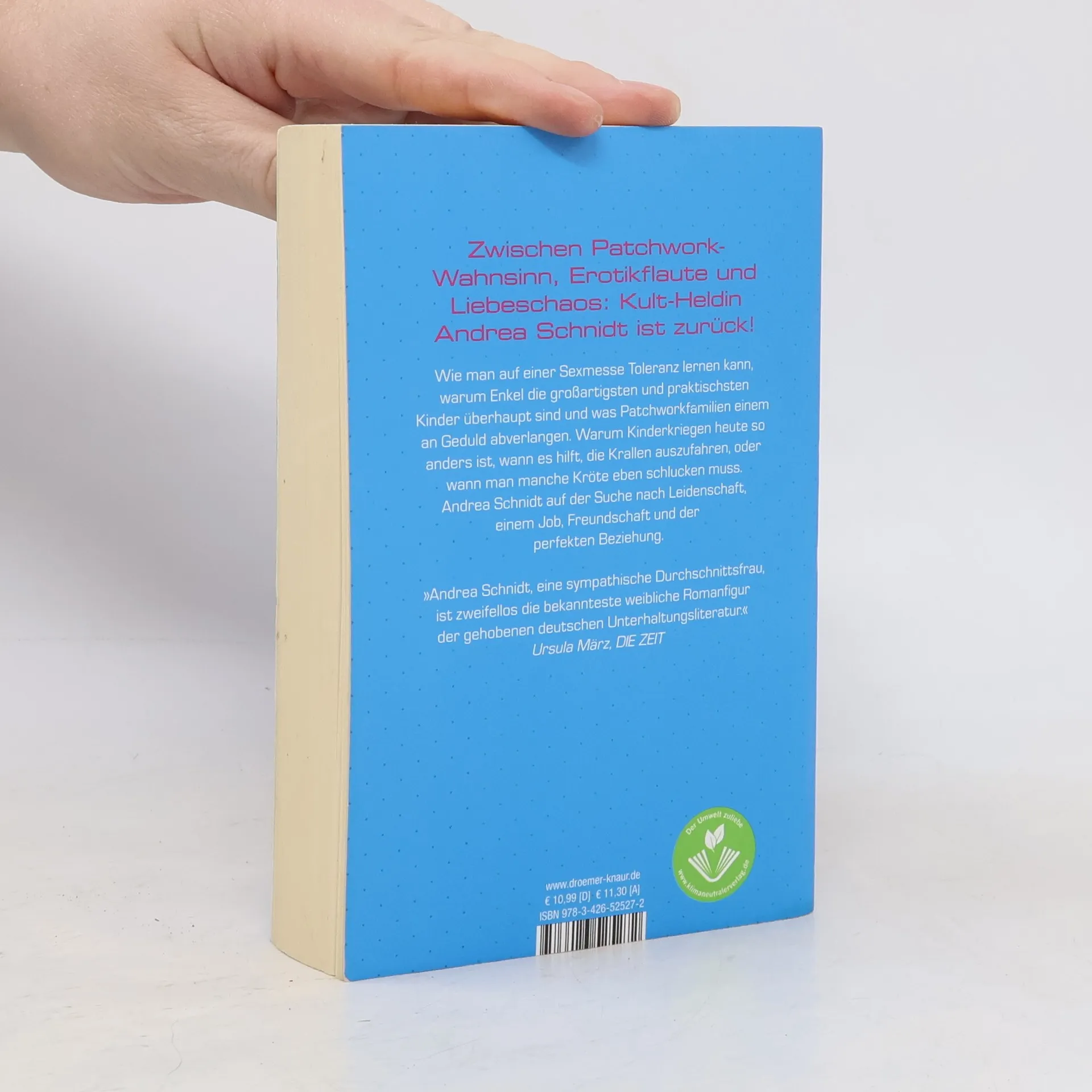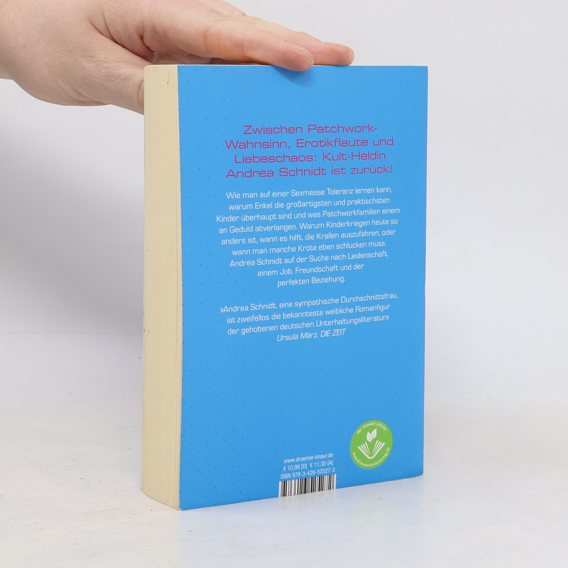Zwischen Patchwork-Familien-Wahnsinn, Erotik-Flaute und Chaos in Sachen Liebe: In Susanne Fröhlichs 11. humorvollen Roman um Andrea Schnidt bleibt der Kult-Alltagsheldin kaum Zeit zum Verschnaufen – und dann wird sie auch noch Oma! Fragen über Fragen, die sich vor Andrea Schnidt auftürmen: Warum ist im heimischen Bett plötzlich so wenig los? Hilft da ein schickes Reizwäscheset oder hat Sex eben auch ein Verfallsdatum? Warum zieht die Ex des Liebsten, die perfekte Bea, ausgerechnet in die nächste Nachbarschaft? Muss man Patchwork-Familie lieben? Warum wird Ex-Schwiegervater Rudi nachts von der Polizei aufgegriffen, und wie fühlt es sich eigentlich an, Oma zu werden? Müssen Babys heutzutage wirklich schon im Kreissaal die erste Lektion Mandarin bekommen? Oder sind die jungen Mütter einfach alle nur ein bisschen wahnsinnig? Von Vaterschaftstests, One-Night-Stands und verwöhnten Jung-Erwachsenen, von neuen Freundinnen und Hobby-Detektiven. Vom Leben und seinen Wirrungen! Empathisch und voller lebensklugem Humor: der 11. Andrea-Schnidt-Roman im Taschenbuch. Die humorvollen Romane um Andrea Schnidt von Bestseller-Autorin Susanne Fröhlich sind in folgender Reihenfolge erschienen: Frisch gepresst Frisch gemacht! Familienpackung Treuepunkte Lieblingsstücke Lackschaden Aufgebügelt Wundertüte Feuerprobe Verzogen Abgetaucht