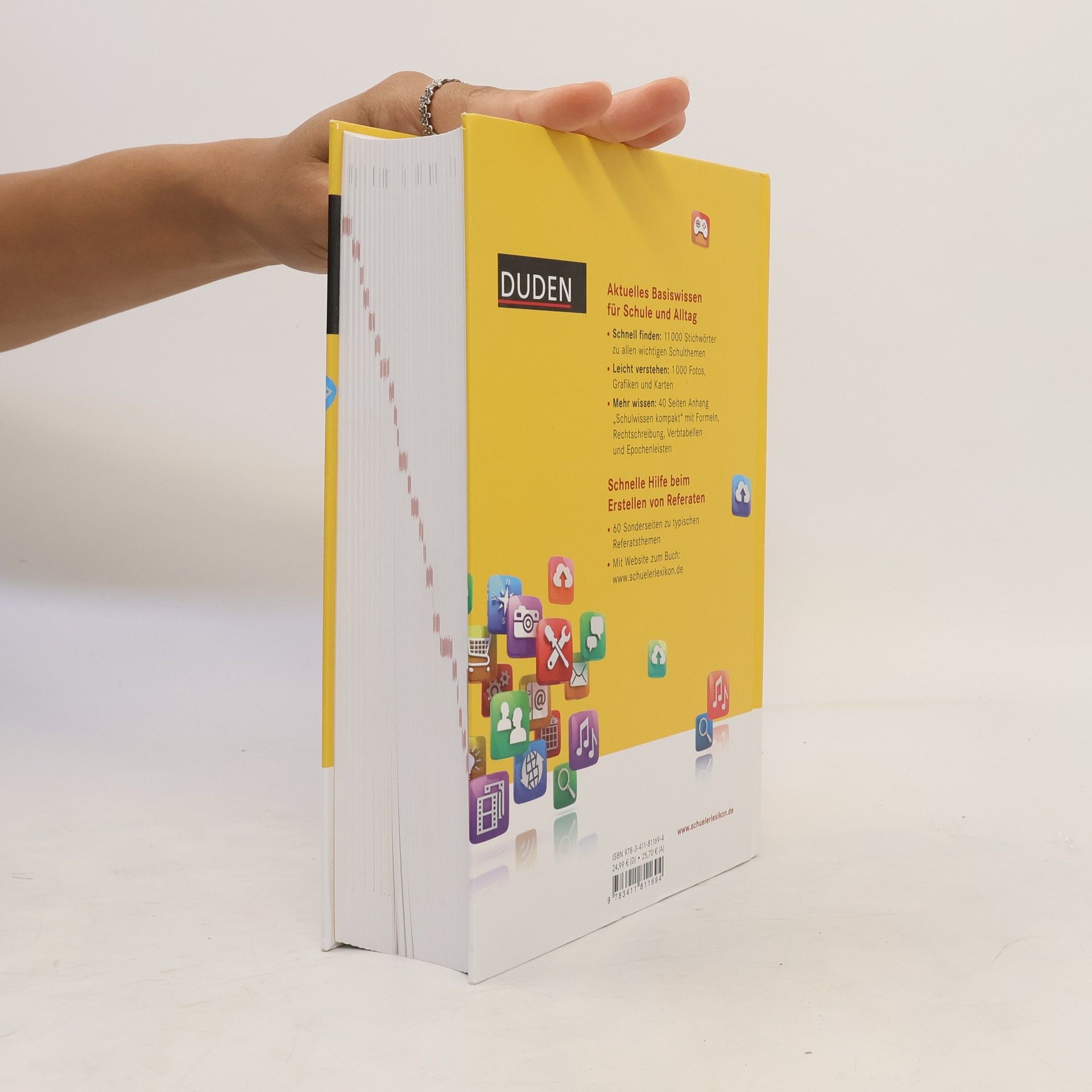 Aktuelles Basiswissen für Schule und Alltag: Das Duden-Schülerlexikon liefert fundierte Antworten auf alles, was Jugendliche wissen möchten. 11.000 Stichworteinträge und 230 Infoboxen zu den Themen Geschichte, Politik, Geografie, Naturwissenschaften, Tiere, Pflanzen, Kunst, Literatur und Musik werden illustriert durch mehr als 1.000 Fotos, Grafiken, Karten und Tabellen. Mit 60 Sonderseiten zu typischen Referatsthemen und einem Anhang "Schulwissen kompakt" mit Übersichten, Formelsammlungen und Karten zu den zentralen Schulfächern. §Mit kostenloser Onlinesuche unter "www. schuelerlexikon.de".