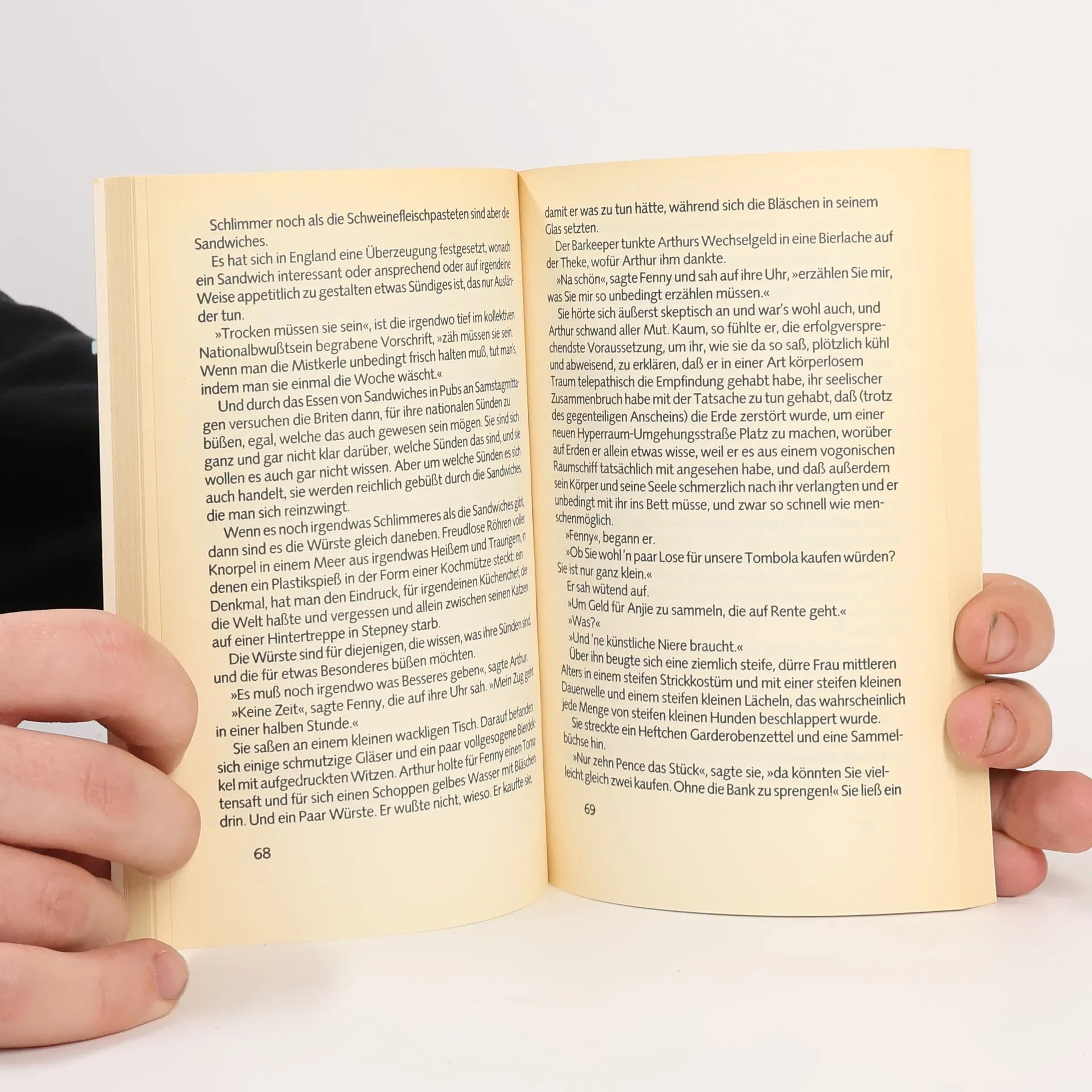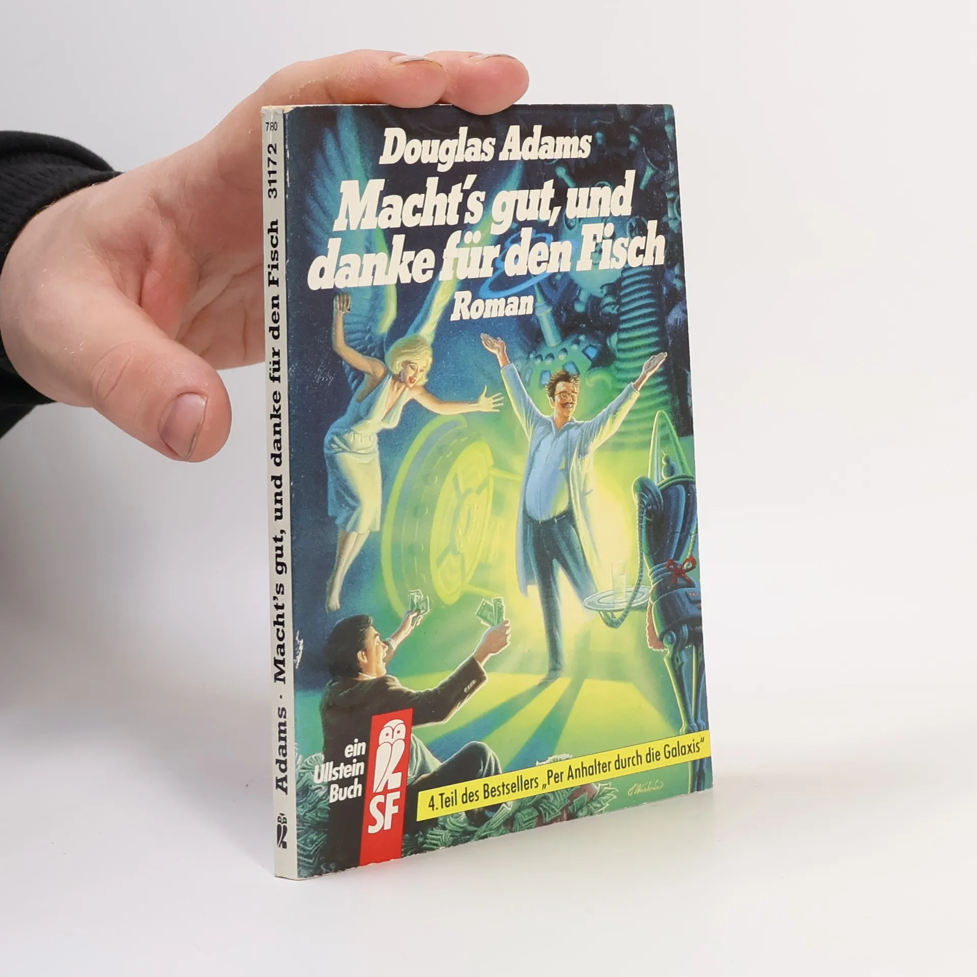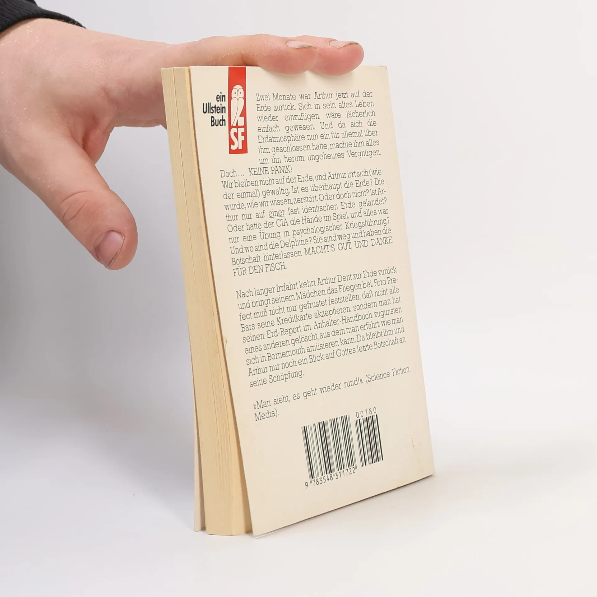 Arthur Dents Flucht von dem absolut unbedeutenden, kleinen blaugrünen Planeten in den unerforschten Einöden des total aus der Mode gekommenen Ausläufers des westlichen Spiralarms der Galaxis nimmt kein Ende. Im vierten Band der Hitchhiker -Trilogie kehrt der müde Wanderer durch die Weiten des Weltenraumes auf die Erde zurück. Sie wurde wohl doch nicht gesprengt. Oder doch? Arthur Dents Porsche mit dem Aufkleber "Mein Zweitwagen ist auch ein Porsche" steht jedenfalls noch vor der Kneipe Horse and Groom, wo damals alles begann, genauso wie die aus Pappe gestanzten Mädchen, die stapelweise Erdnußpäckchen auf ihren Brüsten balancieren. Sogar sein Haus ist noch da. Alles ist genau so, wie er es zurückgelassen hatte -- außer der Schachtel neben dem schäbigen alten Fernseher. Darinnen findet sich ein Goldfischglas mit den zierlich eingravierten Buchstaben, die ein "Mach's gut, und danke..." ergeben. Ist Arthur Dent wirklich auf der Erde gelandet? Was ist aus all den Delphinen geworden? Was passierte wirklich an jenem Tag, dessen Ereignisse Arthur vor acht seiner persönlichen Jahre so viele Scherereien gebracht hatten? Fragen über Fragen, die die deutsche Hitchhiker -Fangemeinde beunruhigen. Aber keine Panik, der Übersetzer dieser Ausgabe ist ganz offensichtlich ein guter Übersetzer. Ihm ist die Aufgabe so vortrefflich gelungen, daß das Buch zu einer Tüte Kartoffelchips wird. Man hört erst auf, wenn es alle ist.