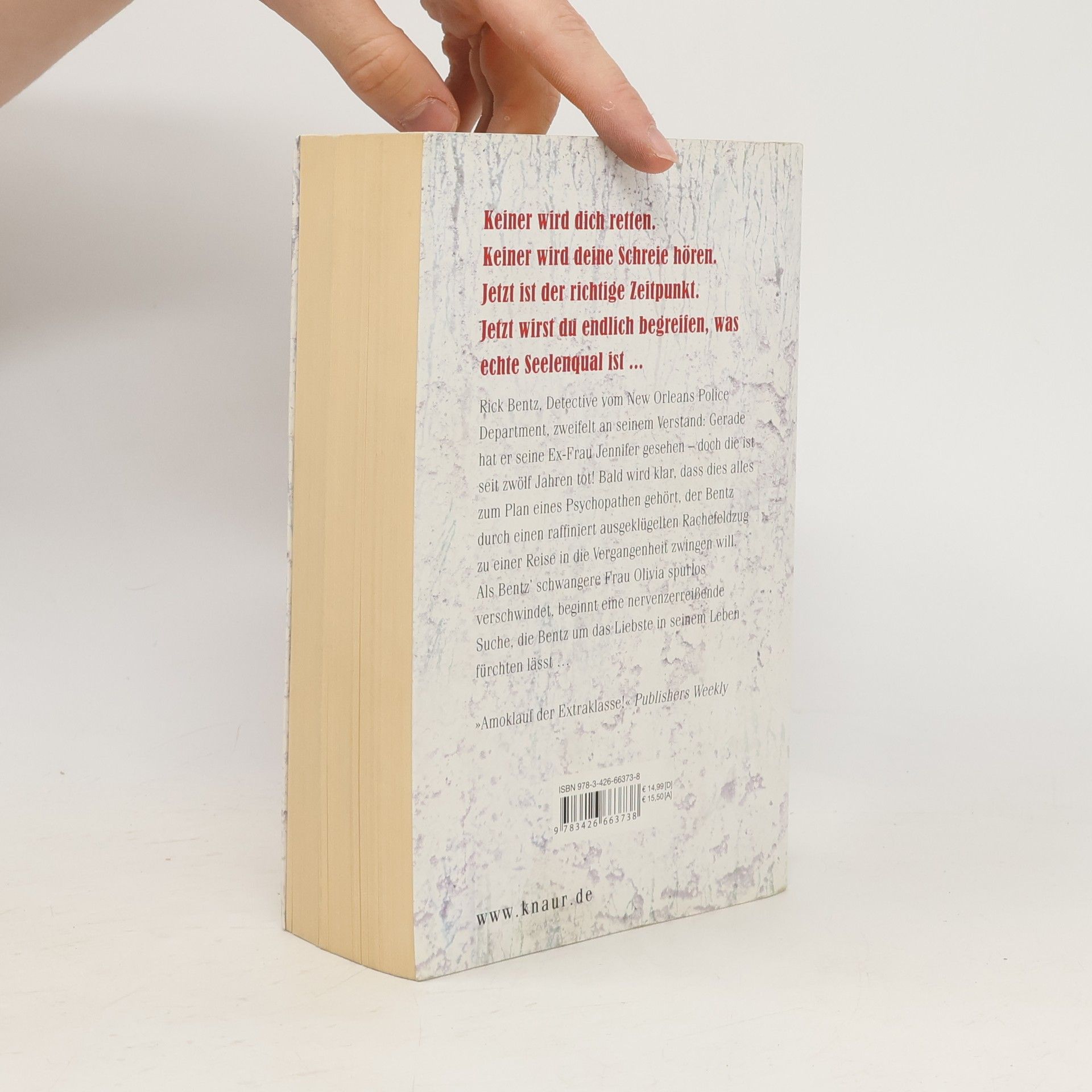 Keiner wird dich retten. Keiner wird deine Schreie hören. Jetzt ist der richtige Zeitpunkt. Jetzt wirst du endlich begreifen, was echte Seelenqual ist ... Rick Bentz, Detective vom New Orleans Police Department, zweifelt an seinem Verstand: Gerade hat er seine Ex-Frau Jennifer gesehen – doch die ist seit zwölf Jahren tot! Bald wird klar, dass dies alles zum Plan eines Psychopathen gehört, der Bentz durch einen raffiniert ausgeklügelten Rachefeldzug zu einer Reise in die Vergangenheit zwingen will. Als Bentz’ schwangere Frau Olivia spurlos verschwindet, beginnt eine nervenzerreißende Suche, die Bentz um das Liebste in seinem Leben fürchten lässt … »Amoklauf der Extraklasse!« Publishers Weekly