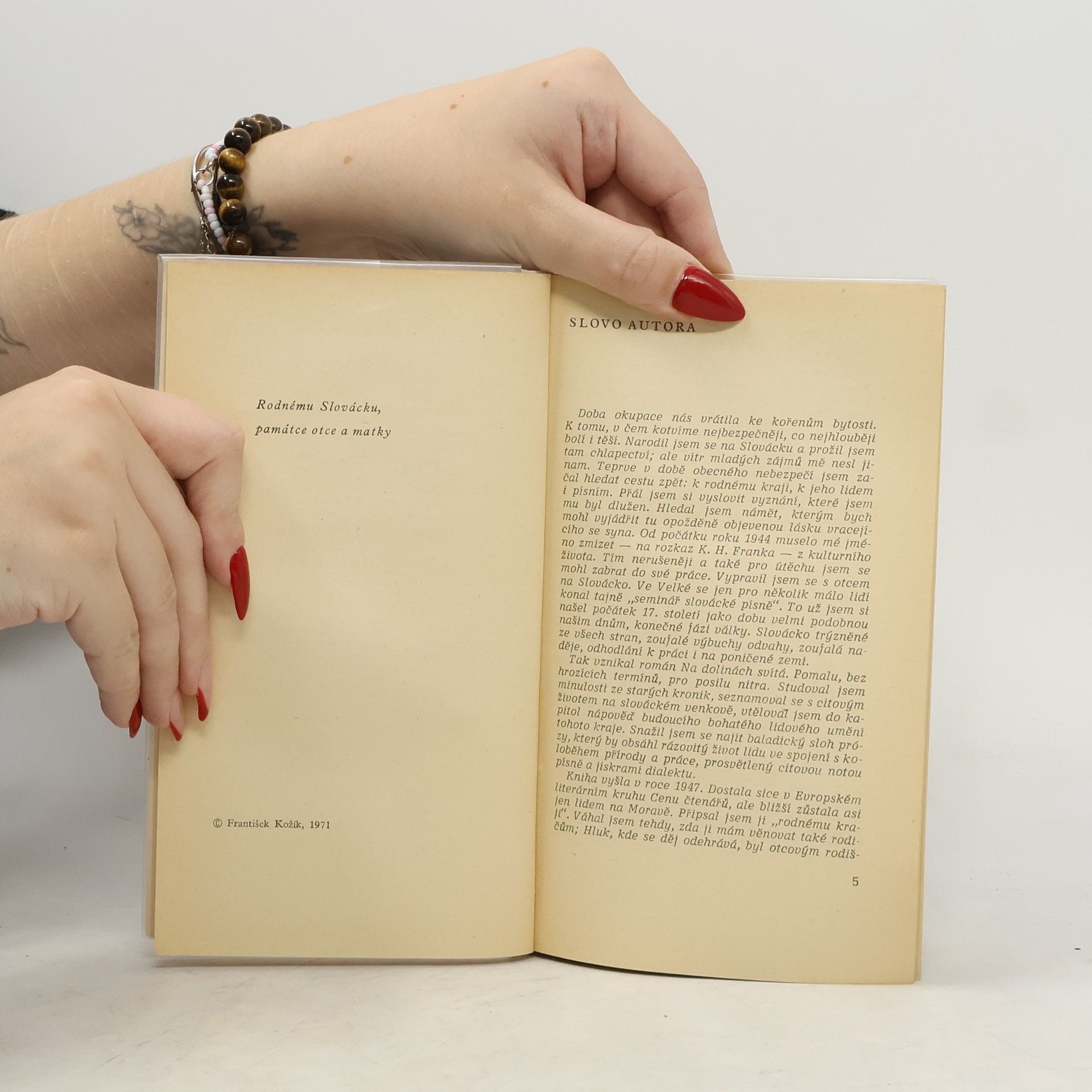 Hejtmanem Šarovcem (Na dolinách svítá) se autor vrátil do historie rodného Slovácka, a jak sám říká, je to jeho nejmilejší kniha. Dramaticky v ní líčí boj loupeživého zemana ze 17. stol., který však pochopil svou povinnost a s hrstkou svých lidí se postavil na ochranu kraje proti cizím nájezdníkům – se vší svou ohnivostí, umíněností, ale také s dosud neznámou obětavostí. – Kniha dostala cenu čtenářů v Evropském literárním klubu, autor ji zpracoval i jako rozhlasovou a divadelní hru, z níž vznikla také opera