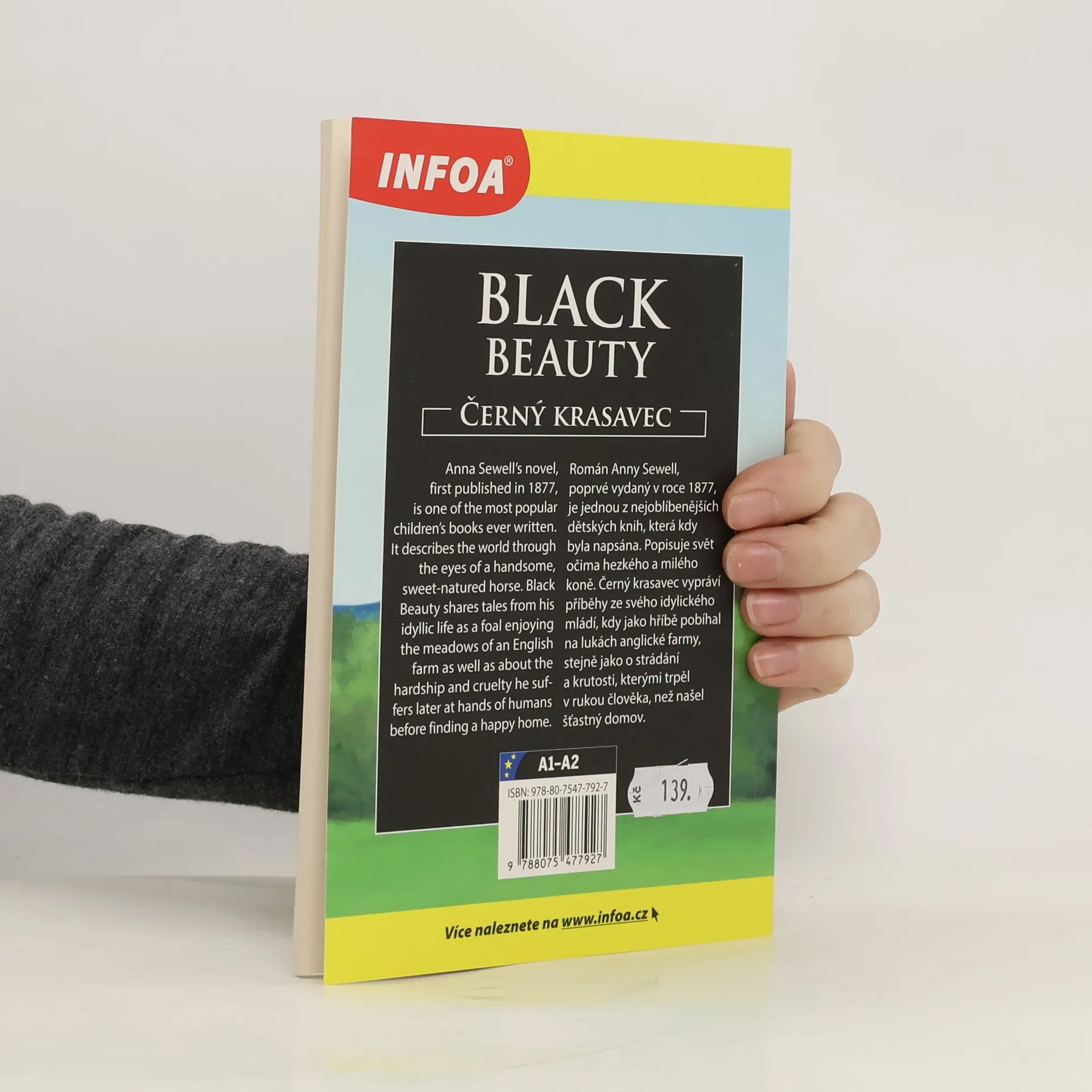 Jazyková úroveň A1-A2. Podle příběhu Anny Sewell. Román Anny Sewell, poprvé vydaný v roce 1877, je jednou z nejoblíbenějších dětských knih, která kdy byla napsána. Popisuje svět očima hezkého a milého koně. Černý krasavec vypráví příběhy ze svého idylického mládí, kdy jako hříbě pobíhal na lukách anglické farmy, stejně jako o strádání a krutosti, kterými trpěl v rukou člověka, než našel šťastný domov.