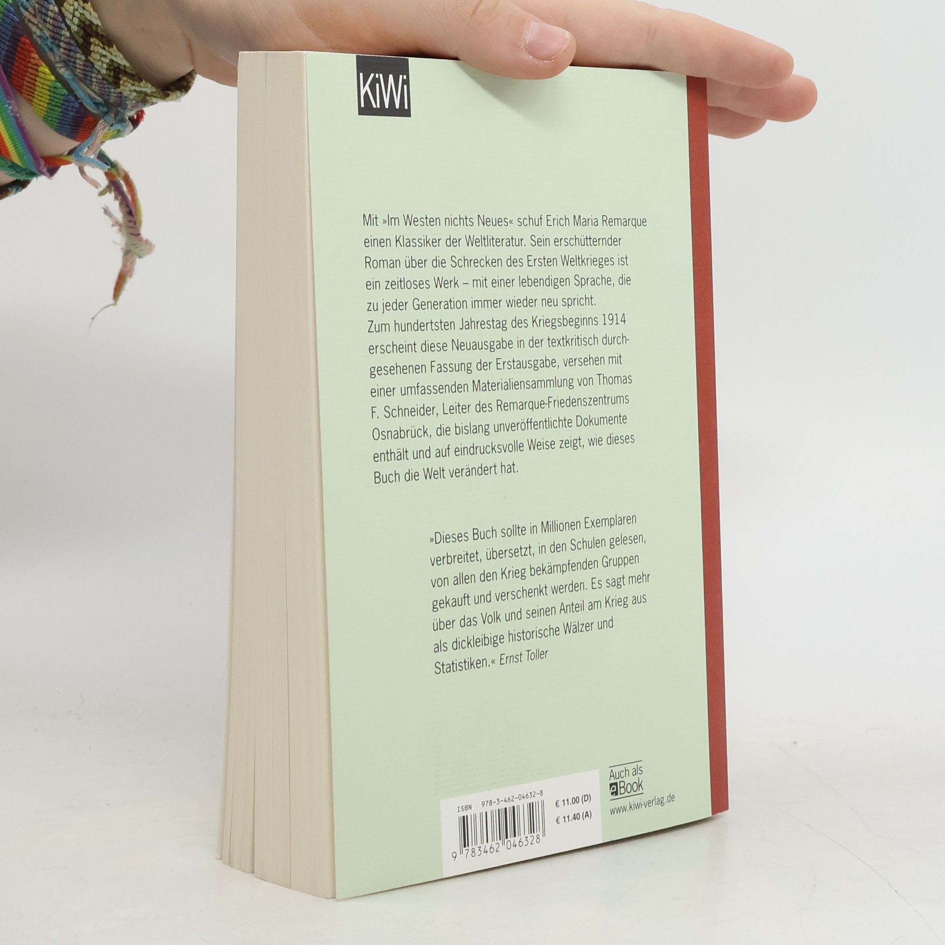 Der Weltbestseller der Anti-Kriegsliteratur - das Buch zur Oscar-prämierten Netflix-Verfilmung Der bedeutendste deutsche Roman zum Ersten Weltkrieg in einer Sonderausgabe – mit neuer Materialiensammlung und einem Nachwort des Remarque-Spezialisten Thomas F. Schneider: Schullektüre ohne Verfallsdatum. Mit diesem Roman begründete Erich Maria Remarque seinen Weltruhm und schuf ein zeitlos gültiges Bild der Schrecken des modernen Krieges. Zum hundertsten Jahrestag des Kriegsbeginns 1914 erscheint eine besonders ausgestattete, mit einem Nachwort von Thomas F. Schneider, Leiter des Remarque-Friedenszentrums der Universität Osnabrück, zur Entstehungs- und Rezeptionsgeschichte versehene Sonderausgabe. Die Geschichte des neunzehnjährigen Paul Bäumer, der als ahnungsloser Kriegsfreiwilliger von der Schulbank an die Front kommt, ist inzwischen Allgemeingut. Auch bei der erneuten Lektüre ist der Eindruck jedoch wieder erschütternd: Wie Bäumer statt der erhofften Kriegsbegeisterung und eines kurzen Abenteuers die ganze Brutalität des Gemetzels und das sinnlose Sterben seiner Kameraden erlebt, ist anrührend und empörend.
