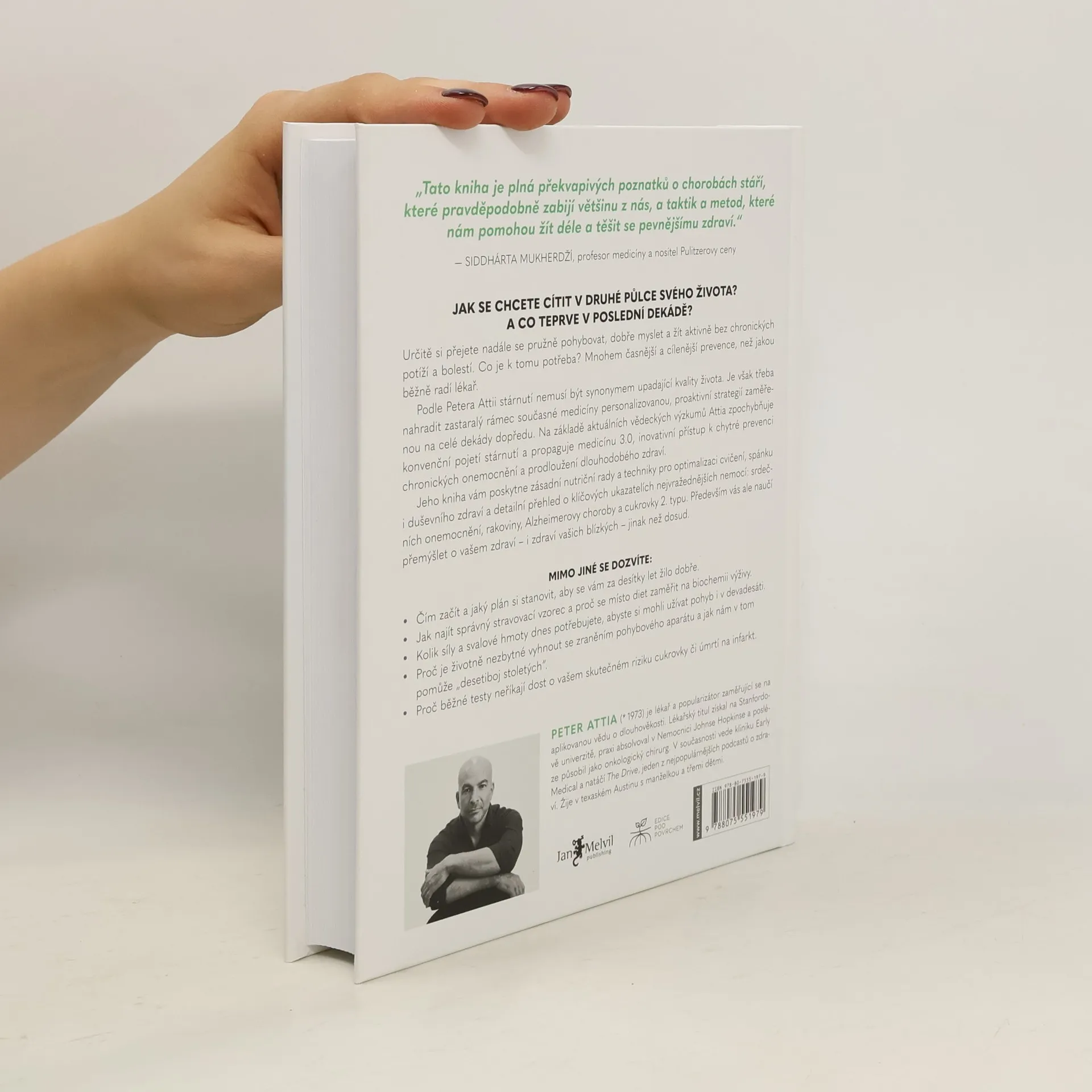Určitě si přejete nadále se pružně pohybovat, dobře myslet a žít aktivně bez chronických potíží a bolestí. Co je k tomu třeba? Mnohem časnější a cílenější prevence, než jakou běžně radí lékař. Peter Attia věří, že zastaralý rámec současné medicíny musíme nahradit personalizovanou, proaktivní strategií zaměřenou na celé dekády dopředu. Na základě aktuálních vědeckých výzkumů Attia zpochybňuje konvenční pojetí stárnutí a propaguje medicínu 3.0, inovativní přístup k chytré prevenci chronických onemocnění a prodloužení dlouhodobého zdraví. Jeho kniha vám poskytne zásadní nutriční rady a techniky pro optimalizaci cvičení, spánku i duševního zdraví a detailní přehled o klíčových ukazatelích nejvražednějších nemocí: srdečních chorob, rakoviny, Alzheimerovy choroby a cukrovky 2. typu. Především vás ale naučí přemýšlet o vašem zdraví – i zdraví vašich blízkých – jinak než dosud.